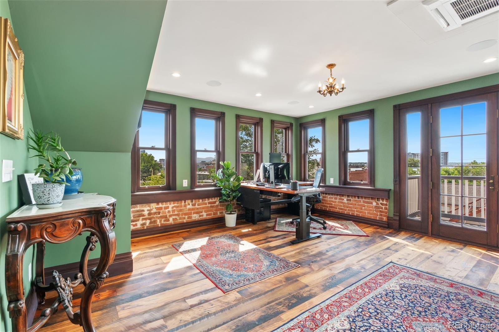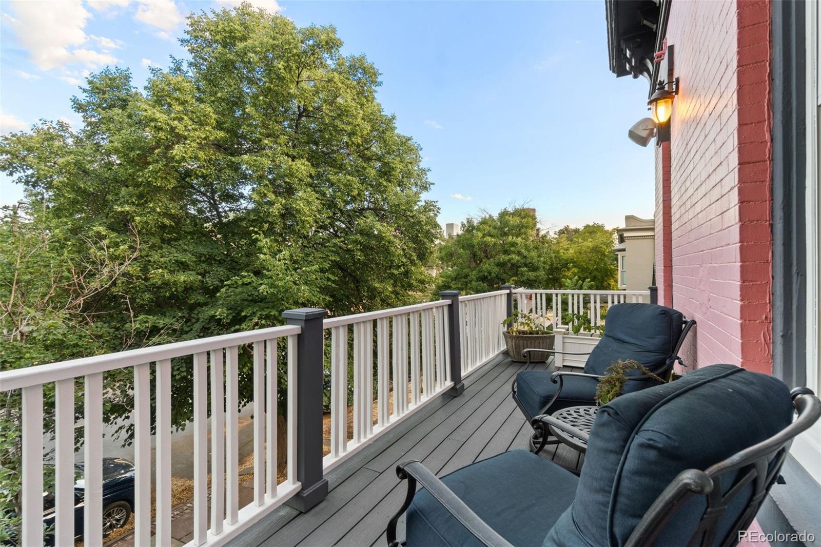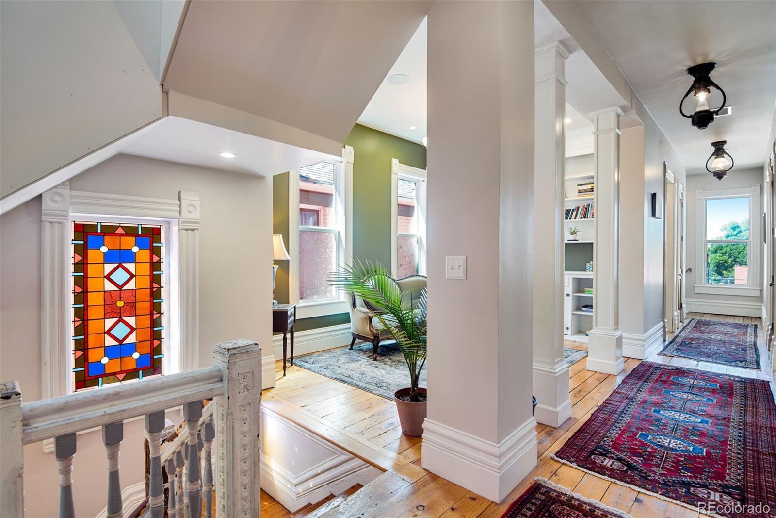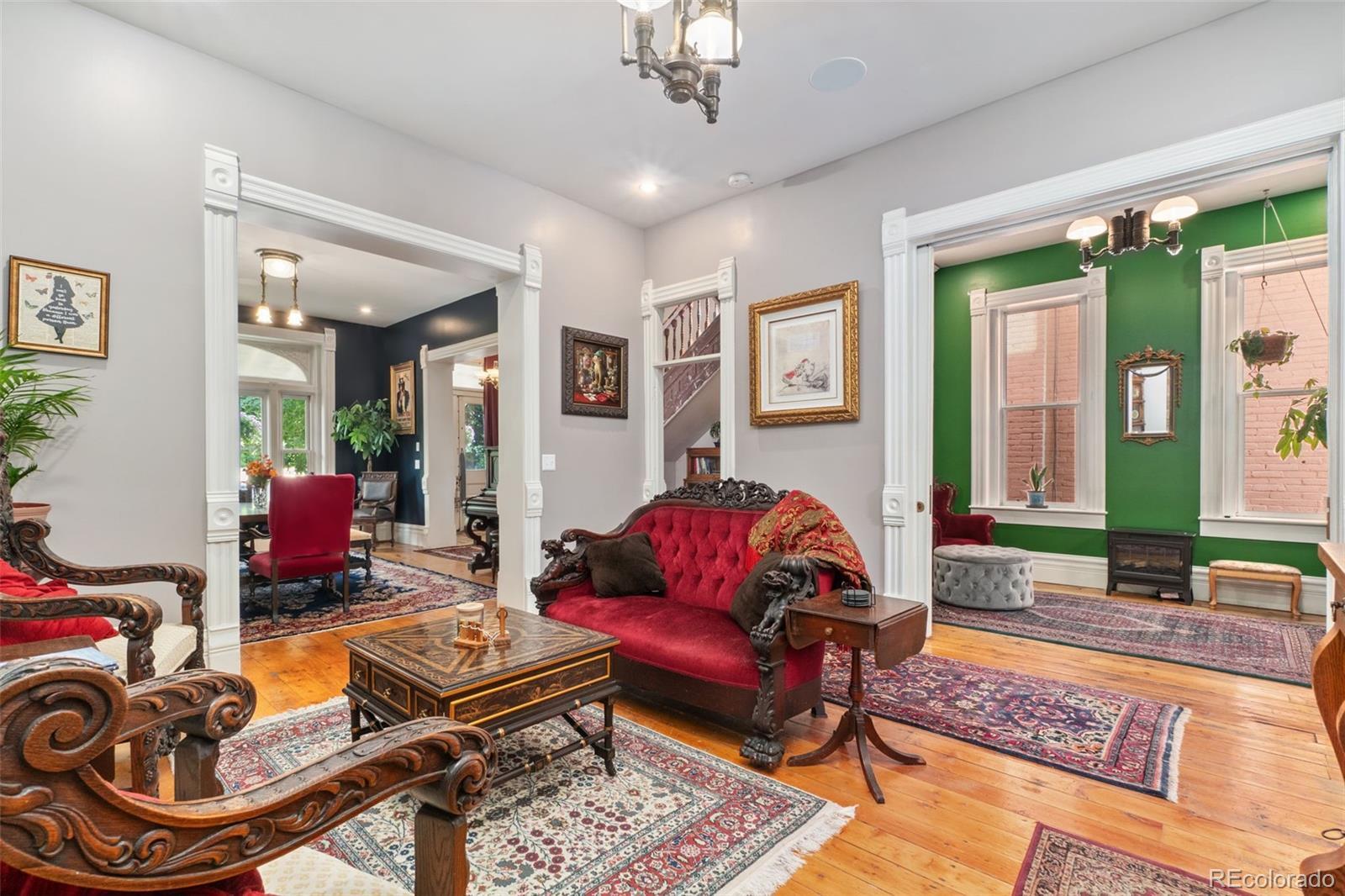 This one-of-a-kind home, situated on a quiet tree-lined street of stately Victorian homes in historic Curtis Park, lies just a few blocks from the center of RiNo. When you step into 2721 Curtis, you’ll be transported to a whimsical, Victorian era, ‘Alice in Wonderland’ atmosphere, where all its charm and character will be felt. From its original walnut staircase and wide plank pine floors to the cast-iron fireplaces, over 10-ft ceilings, and ornate woodwork, this home retains the beauty and integrity of its Victorian roots. Nearly every light fixture is a hand-selected 1800s antique, with its museum-quality railcar light fixtures as outstanding, rare pieces of history. A state-of-the-art whole house sound system, with 45 speakers throughout, offers sound control in every room. Gigabit internet. Its eight, 4k camera suite enables monitoring from a simple app. A new, state-of-the-art commercial heat pump HVAC system, with controls for each floor. Navien on-demand water heat system. With over 4300 finished sqft, the house has plenty of room to entertain, live and work. The large kitchen showcases a center island, marble countertops, farm style sinks, stainless appliances, and a huge custom pantry. The second floor features an additional library, three bedrooms and two baths. The primary suite on the second floor boasts a decorative fireplace, a relaxing balcony overlooking Curtiis Street, and a beautiiful ‘blue celeste’ Argentinian marble bath with a walk-in, rainfall shower and Rohl fixtures. The third floor features another primary suite with bath, custom top-of-the-line, mahogany Loewen windows and French doors opening to a balcony with stunning mountain and city skyline views. The basement features original stone walls, antique arched doors, reclaimed wood floors, and a granite bar top imported from Madagascar. Home theater with custom, app-controlled lighting and immersive 13-speaker surround sound movie theater with a 72-in TV and tech rack included in sale.