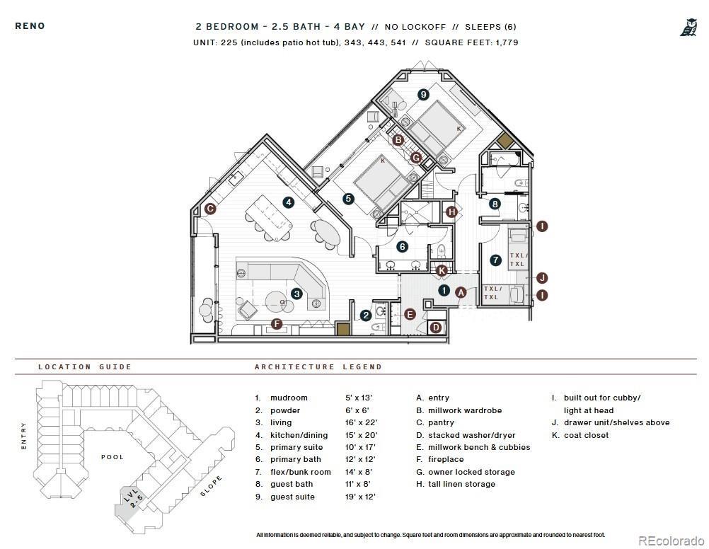 To-be-built Beckwith Residence 225 is a standout Reno floor plan offering 1,779 square feet of thoughtfully designed living space, two spacious bedrooms, two and a half bathrooms, and three private balconies that invite the outdoors in. Positioned poolside with easy access to the hot tub, Matchstick Lounge, and Telly’s restaurant. Inside, discover mountain-modern interiors that echo the alpine meadows of Crested Butte. Whimsical design details and unexpected pops of color bring a distinctive sense of place and playful sophistication to every room. The gourmet kitchen is a chef’s dream, with natural stone countertops, high-end appliances, a pantry, and generous space for culinary exploration and entertaining. A custom millwork bench and cubbies at the entry make gear organization effortless. The main living area features wide-plank wood flooring, a sleek electric fireplace, and easy access to a sunny balcony for seamless indoor-outdoor flow. The primary suite is a private sanctuary, complete with a millwork wardrobe, private balcony, and a spa-inspired en-suite bath featuring Kohler fixtures and radiant finishes. The secondary bedroom and flex/bunk room each offer tranquil retreats— ideal for hosting guests. Additional conveniences include a stylish powder room with bespoke wall coverings, in-unit laundry with a stacked washer and dryer, and secure owner’s gear storage. Residence 225 delivers relaxed luxury, unbeatable access, and connection to everything that makes mountain town living magical. The Beckwith is the only ski-in, ski-out resort in the heart of Crested Butte's base area, with world-class amenities including a four-star, community-inspired hotel, seamless ski valet, luxurious spa, adventure concierge, and private mountain & social community, Club Beck. A multi-phased reimaging of Elevation Hotel & Spa will transform almost every space at the resort, with residences anticipated for completion in the Winter 26-27 ski season.
