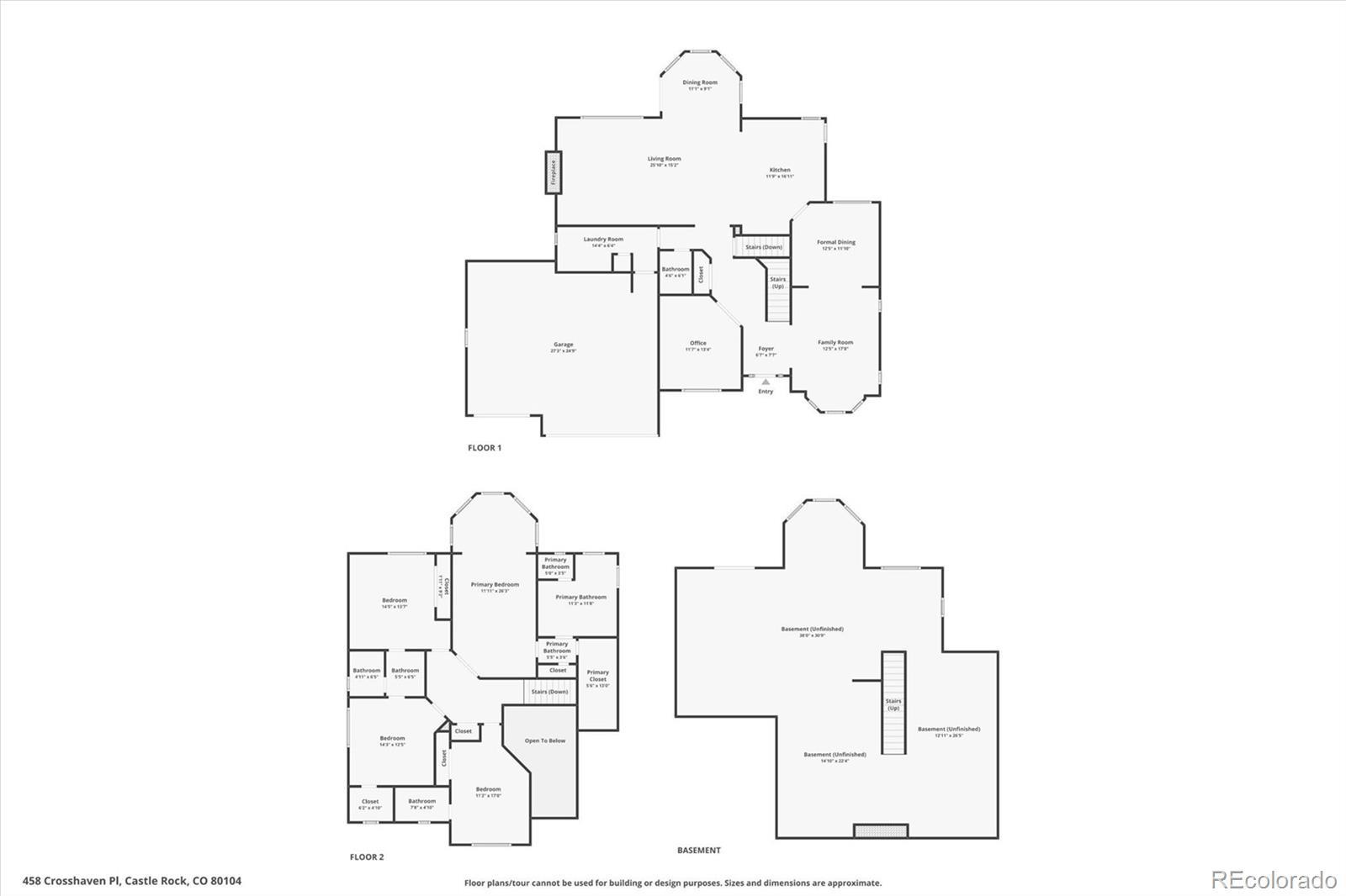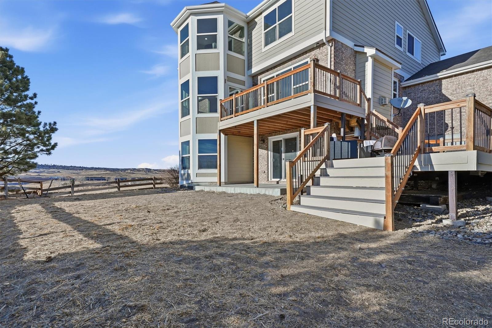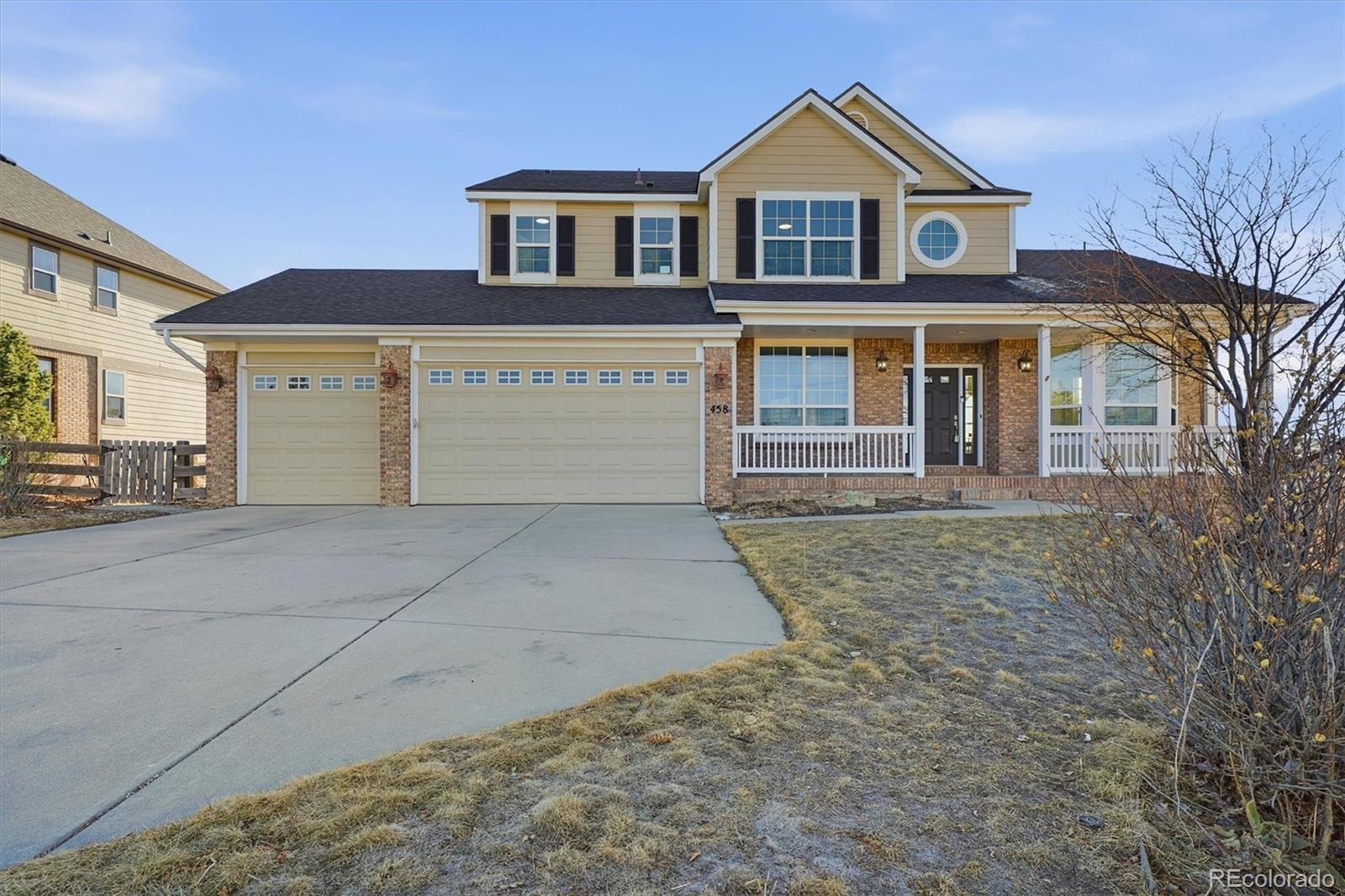 Stunning mountain and golf course views from almost every room! Pikes Peak, Rampart Range, The Castle Rock, Plum Creek Golf Course, and expansive open space. Welcome to 458 Crosshaven Place, a semi-custom 4 bedroom, 4 bathroom, 3 car garage home on 1/4 acre at the end of a cul-de-sac! New carpet, new paint, refinished hardwood floors welcome you inside this home. Formal living room and dining room, family room with gas fireplace and built-in bookcases, gourmet kitchen, bay window with eating area, step out to enjoy the views on the new 2-tiered trex deck. The main floor also features a private office with French doors and built-in bookcases, powder bathroom, and laundry room with rough-in for a laundry sink. The kitchen has slab granite counter, an island with pendant lighting, 42” maple cabinetry, a gas cooktop, double ovens, and a desk. This home is designed for everyday living and entertaining. The main level is complete with a formal living room, elegant dining room, a private study with custom built-ins, and a convenient powder bath. Upstairs, you’ll find 4 spacious bedrooms, including an spacious primary suite with a sitting area framed by windows that capture all the views, a luxurious 5-piece bath with a jetted soaking tub. Secondary bedrooms are thoughtfully designed with a large Jack-and-Jill bath, plus a private en-suite bath in the guest bedroom. The walk-out basement offers endless possibilities and is ready for your custom finish. This is Colorado living at its finest: views, privacy, unforgettable sunrises and sunsets, and space to truly make it your own.