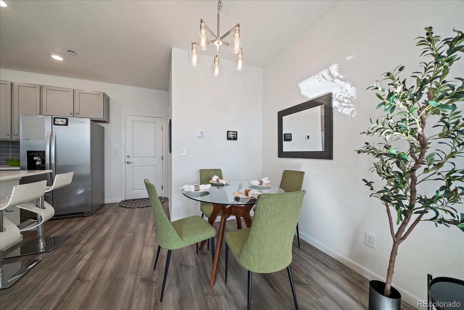 Built in 2023 and better than brand new, this move-in-ready townhome in Parker’s Anthology neighborhood pairs modern style with smart functionality throughout. The open-concept layout features luxury vinyl plank floors, a sleek tile-wall gas fireplace with custom changing colors, and east-facing windows that fill the space with morning light. The kitchen delivers a polished look with quartz countertops, tile backsplash, a gas range, Whirlpool appliances, and a roomy pantry plus a large eat-up island that is great for entertaining. Upstairs, you’ll find three comfortable bedrooms with upgraded remote-controlled Hunter ceiling fans in each room, a generous primary suite with an upgraded waterfall shower, dual sinks, an upstairs laundry room, and an upstairs landing that works perfectly as a small office or study space, plus custom blinds throughout for privacy and light control. Smart-home features include a smart garage door opener, smart thermostat, and security system through Alarm.com, plus a tankless water heater with pressure reducer for efficient comfort. Solar panels through ION help offset utility costs and support long-term energy savings, and there’s a rare bonus: a roomy crawl space that adds valuable extra storage. A two-car attached garage, fenced front yard (ideal for pets), and HOA that maintains landscaping in common areas keep day-to-day living simple, and a VA assumable loan creates an additional opportunity for the next buyer. Anthology offers a community pool, clubhouse, playground, and trail network, giving you plenty of options to get outside without leaving the neighborhood. On Parker’s west side, you’re a short drive to downtown Parker’s historic main street, local restaurants, coffee shops, and year-round events. Nearby recreation options like the Parker Recreation Center and PACE Center add classes, concerts, and cultural events to your weekly routine while the Rueter-Hess Reservoir is less than 10 minutes away.