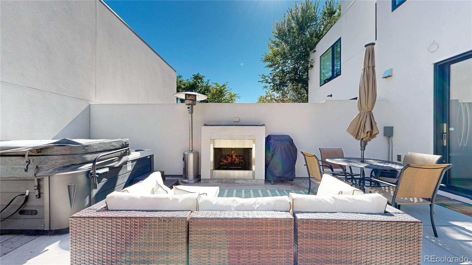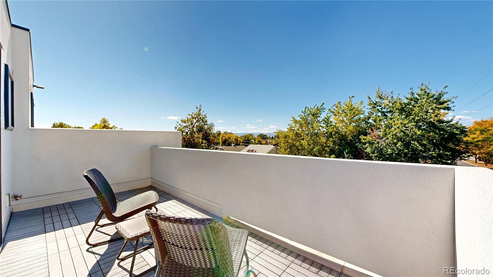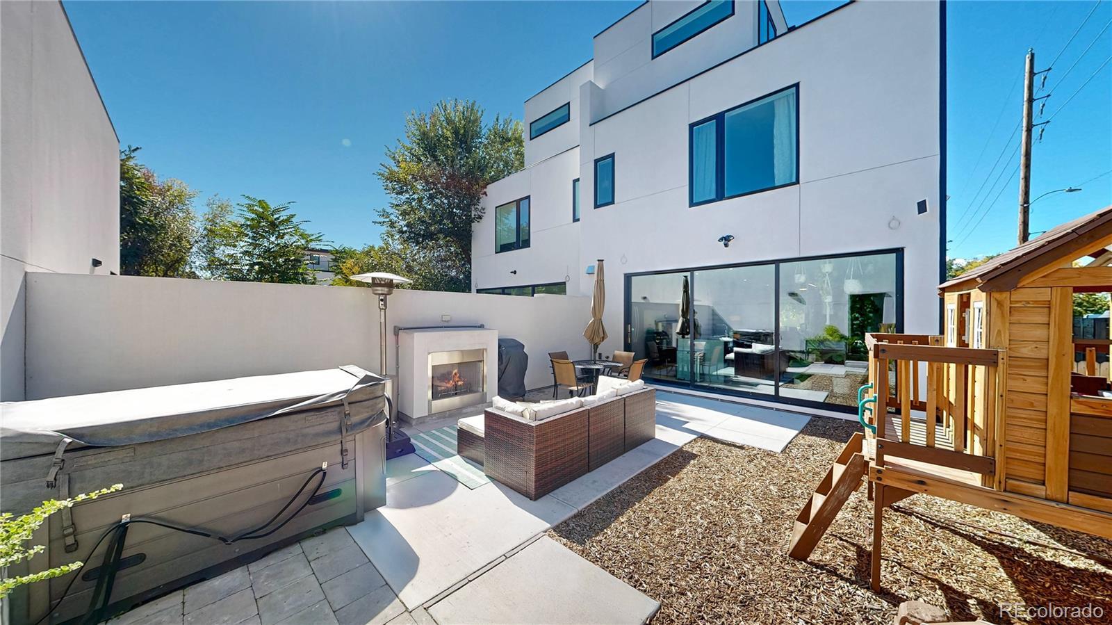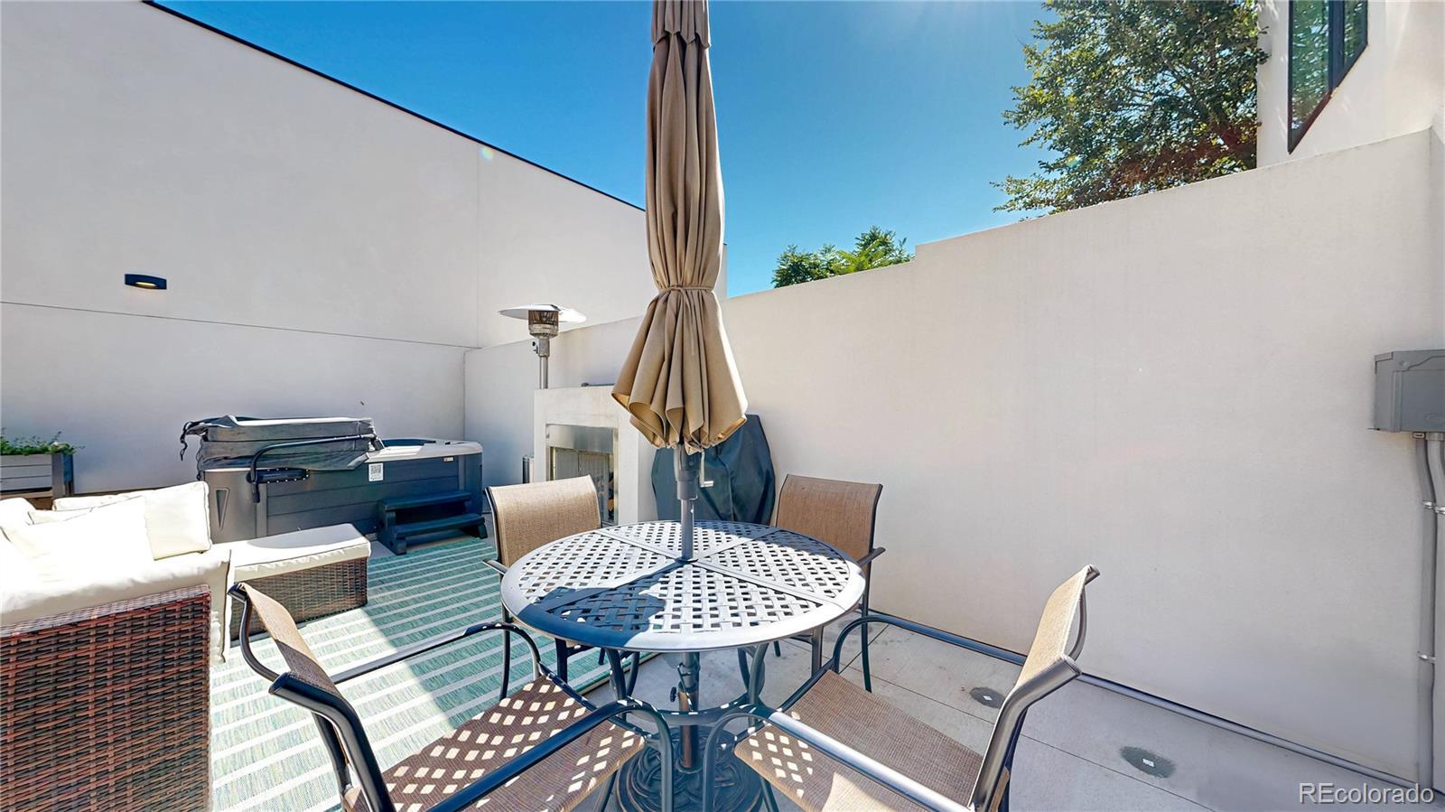 AMAZING PRICE! The perfect, like-new contemporary townhome with striking mountain views and sunsets from the private rooftop patio and retreat room with a wet bar and a secluded bedroom with murphy bed ideal for guests or use as office on the private 3rd floor! The open concept main floor plan includes a gourmet kitchen open to dining and living area with quartz composite counters, 5 burner gas stove/convection oven, pantry with pullout drawers and an over-sized island with breakfast bar and waterfall edge. Full height sliding glass door opens to wonderfully spacious private and secluded outdoor patio and backyard with built-in gas fireplace to keep you cozy on those cool nights. Patio and backyard also includes a hot tub, raised garden bed plus a playhouse and sand box for the kids and a storage shed. Second floor spacious primary suite with sitting area is a retreat from the outside world with spacious 5-piece bath complete with soaking tub and oversized frameless glass shower! There are two more bedrooms with full height glass windows overlooking front yard and served by a full bath and a convenient laundry closet in the hall. This home is conveniently located 1/2 block from Rosedale and City of Kunming parks and 2 1/2 blocks from Harvard Gulch Park with soccer fields, volleyball, neighborhood pool, 9-hole golf course, playground and walking/running paths and it is also only blocks away to multiple restaurants and shops on Old South Pearl St in Platt Park. First floor also includes a sunny office/studio in the front with full height glass that overlooks the fenced front yard. Recently painted and custom 2-way blinds (2022), carpeted (2024). Built-in wiring for high-speed internet and audio/visual. Sprinkler system in raised garden bed, front and side.