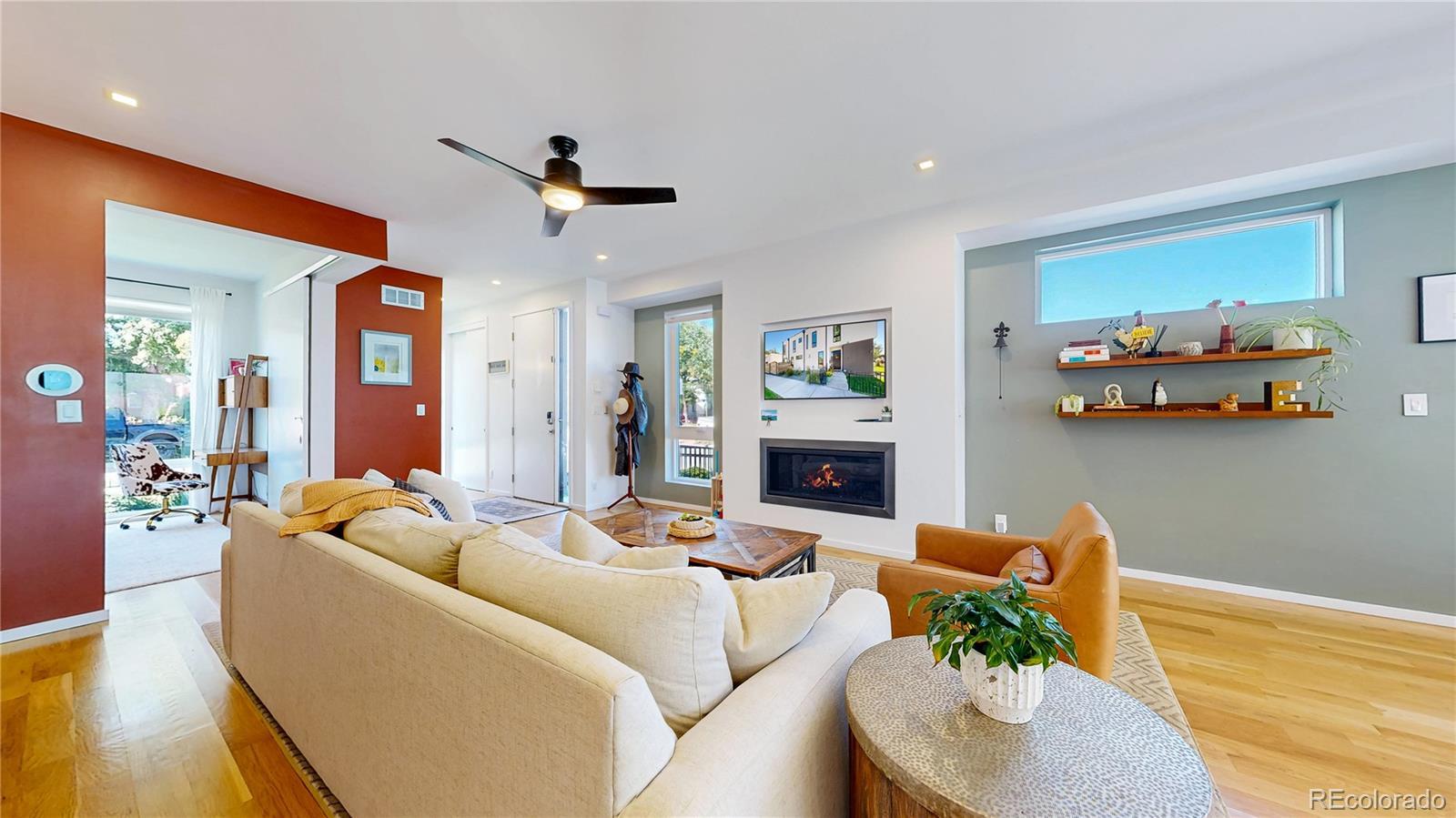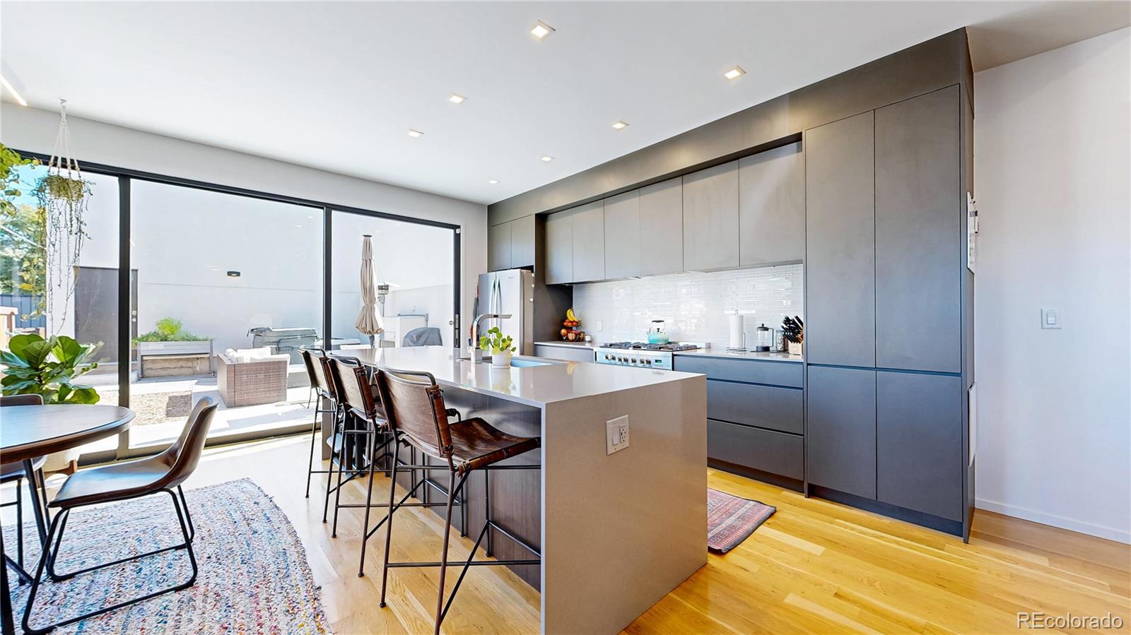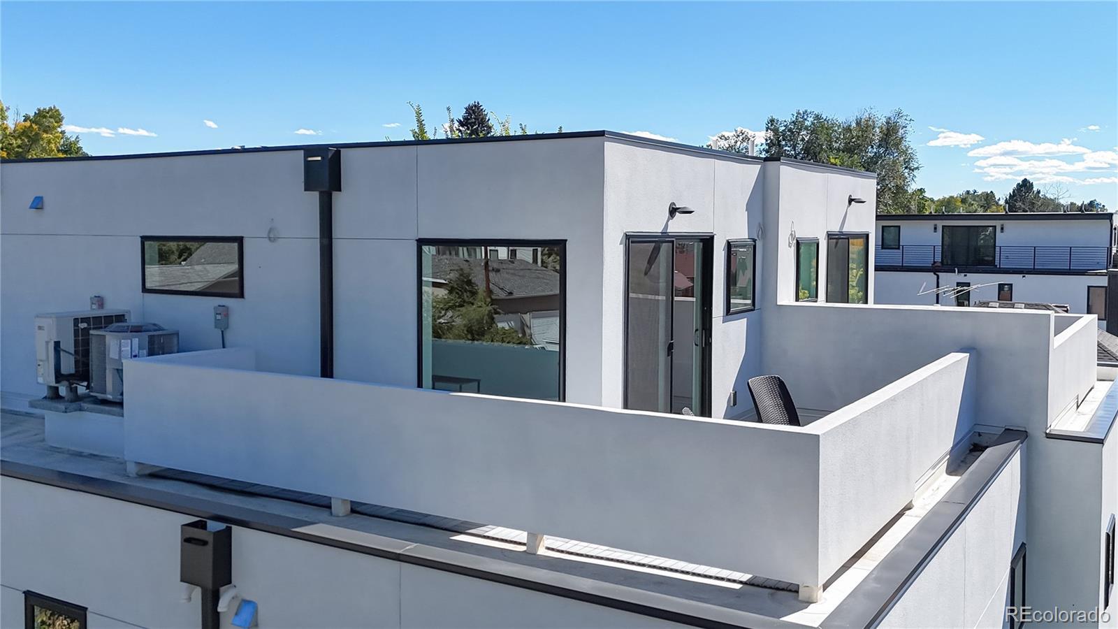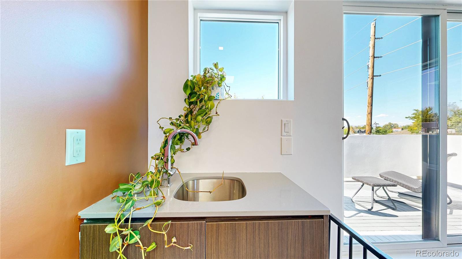 AMAZING PRICE! The perfect, like-new contemporary townhome with striking mountain views and sunsets from the private rooftop patio and retreat room with a wet bar and a secluded bedroom with murphy bed ideal for guests or use as office on the private 3rd floor! The open concept main floor plan includes a gourmet kitchen open to dining and living area with quartz composite counters, 5 burner gas stove/convection oven, pantry with pullout drawers and an over-sized island with breakfast bar and waterfall edge. Full height sliding glass door opens to wonderfully spacious private and secluded outdoor patio and backyard with built-in gas fireplace to keep you cozy on those cool nights. Patio and backyard also includes a hot tub, raised garden bed plus a playhouse and sand box for the kids and a storage shed. Second floor spacious primary suite with sitting area is a retreat from the outside world with spacious 5-piece bath complete with soaking tub and oversized frameless glass shower! There are two more bedrooms with full height glass windows overlooking front yard and served by a full bath and a convenient laundry closet in the hall. This home is conveniently located 1/2 block from Rosedale and City of Kunming parks and 2 1/2 blocks from Harvard Gulch Park with soccer fields, volleyball, neighborhood pool, 9-hole golf course, playground and walking/running paths and it is also only blocks away to multiple restaurants and shops on Old South Pearl St in Platt Park. First floor also includes a sunny office/studio in the front with full height glass that overlooks the fenced front yard. Recently painted and custom 2-way blinds (2022), carpeted (2024). Built-in wiring for high-speed internet and audio/visual. Sprinkler system in raised garden bed, front and side.