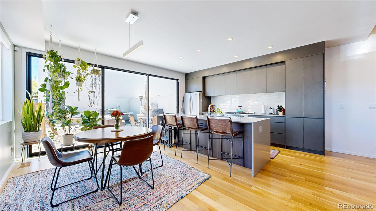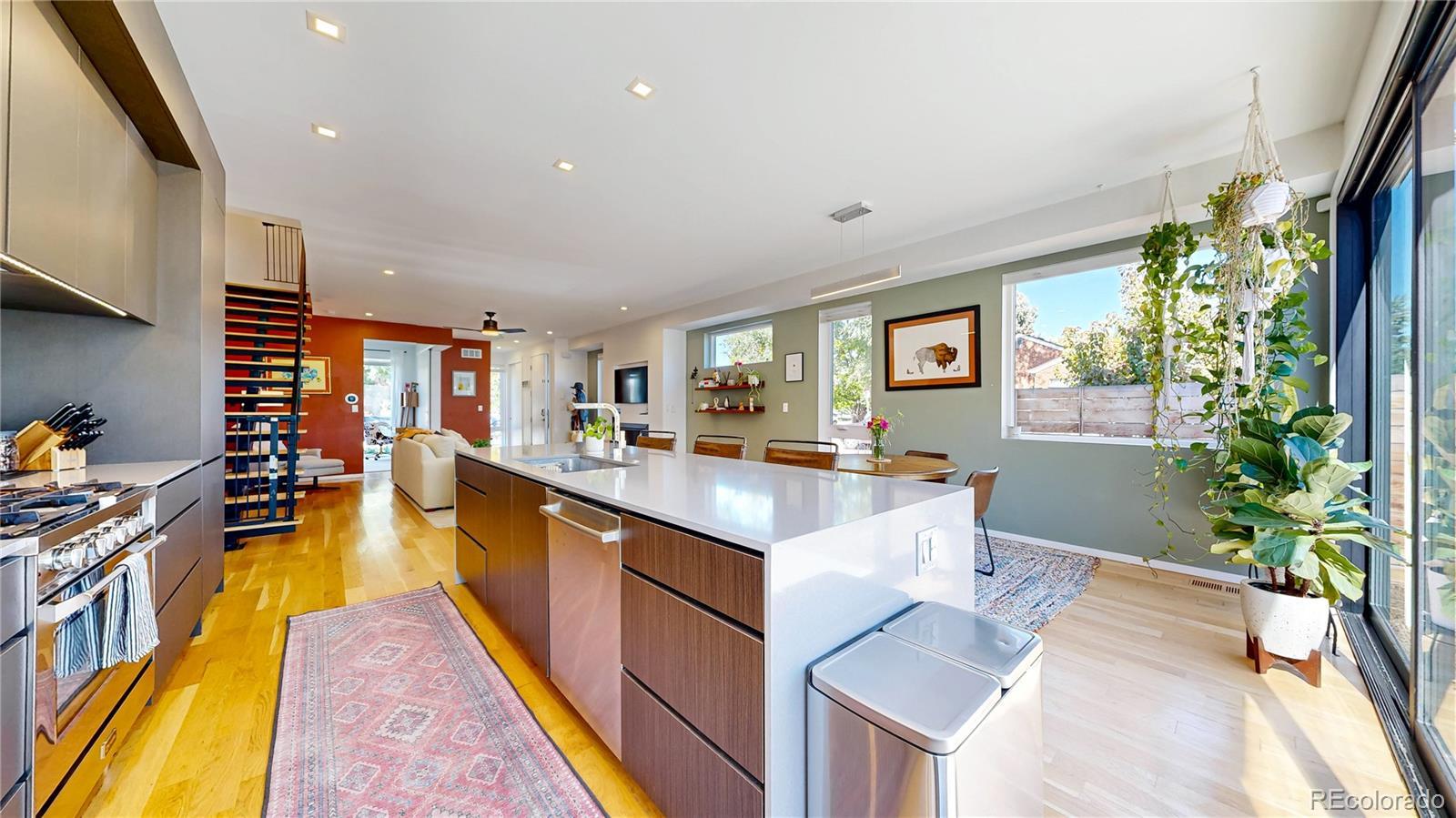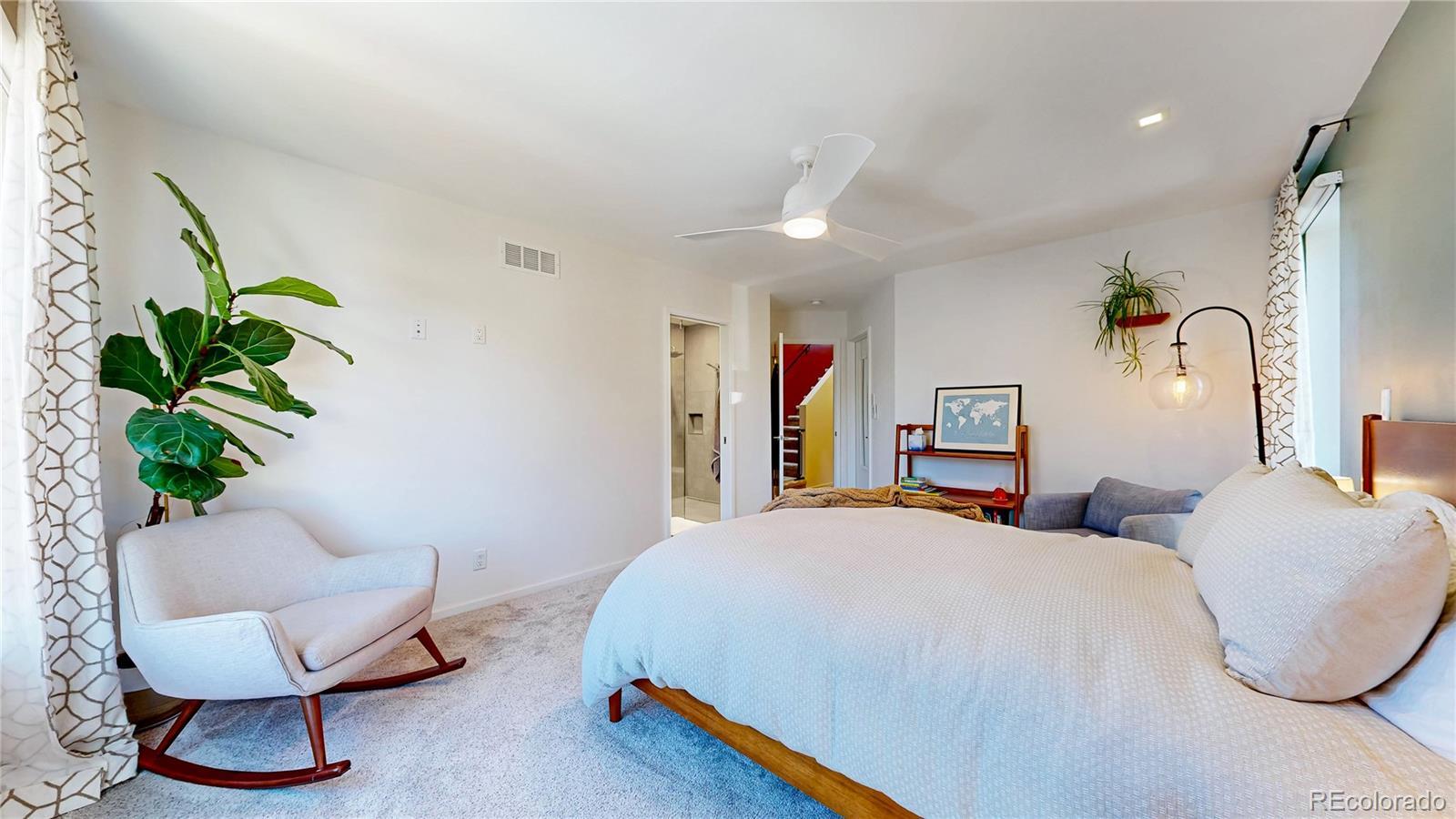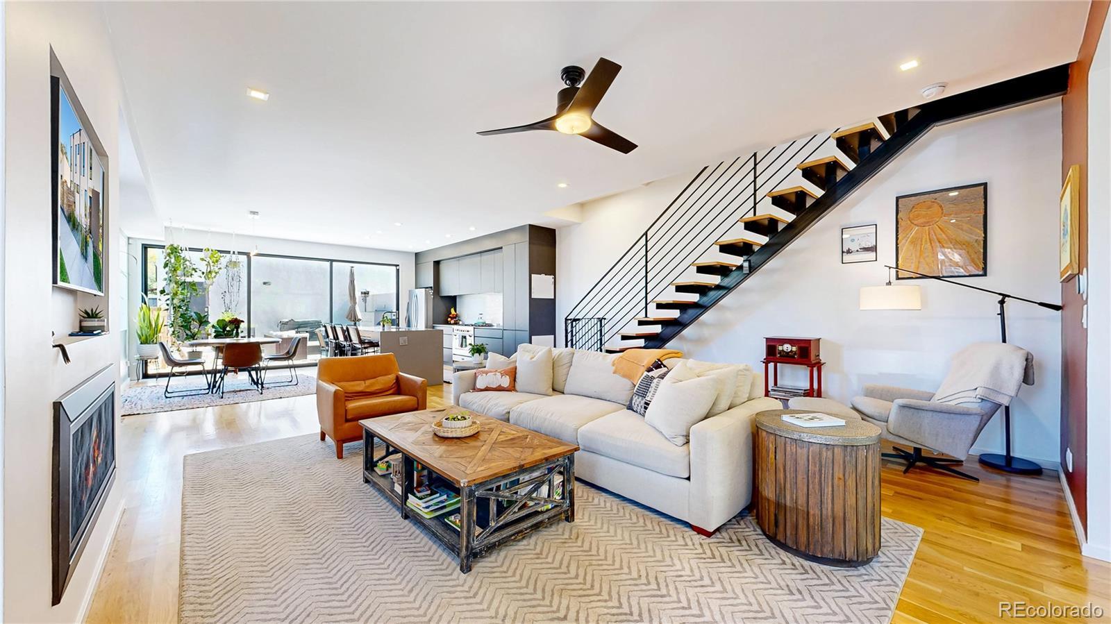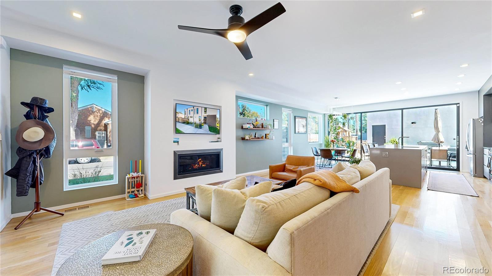 AMAZING PRICE! The perfect, like-new contemporary townhome with striking mountain views and sunsets from the private rooftop patio and retreat room with a wet bar and a secluded bedroom with murphy bed ideal for guests or use as office on the private 3rd floor! The open concept main floor plan includes a gourmet kitchen open to dining and living area with quartz composite counters, 5 burner gas stove/convection oven, pantry with pullout drawers and an over-sized island with breakfast bar and waterfall edge. Full height sliding glass door opens to wonderfully spacious private and secluded outdoor patio and backyard with built-in gas fireplace to keep you cozy on those cool nights. Patio and backyard also includes a hot tub, raised garden bed plus a playhouse and sand box for the kids and a storage shed. Second floor spacious primary suite with sitting area is a retreat from the outside world with spacious 5-piece bath complete with soaking tub and oversized frameless glass shower! There are two more bedrooms with full height glass windows overlooking front yard and served by a full bath and a convenient laundry closet in the hall. This home is conveniently located 1/2 block from Rosedale and City of Kunming parks and 2 1/2 blocks from Harvard Gulch Park with soccer fields, volleyball, neighborhood pool, 9-hole golf course, playground and walking/running paths and it is also only blocks away to multiple restaurants and shops on Old South Pearl St in Platt Park. First floor also includes a sunny office/studio in the front with full height glass that overlooks the fenced front yard. Recently painted and custom 2-way blinds (2022), carpeted (2024). Built-in wiring for high-speed internet and audio/visual. Sprinkler system in raised garden bed, front and side.