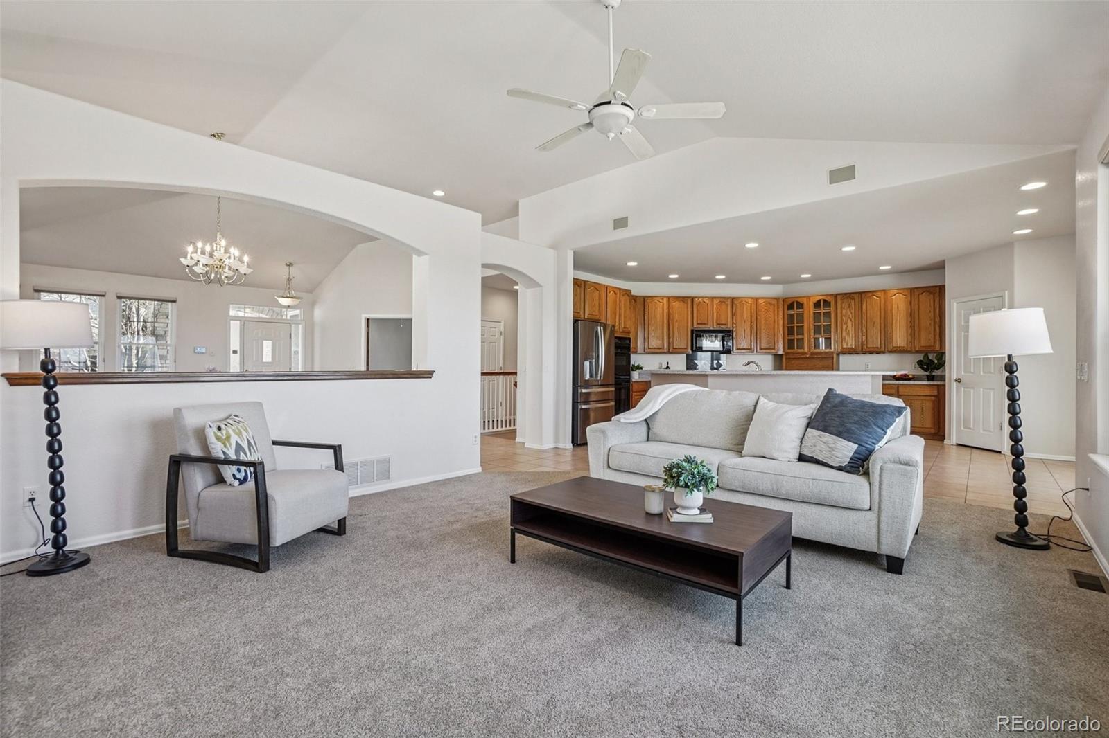 Welcome to 6333 S Sicily Way in Aurora, Colorado, a 4 bedroom 3 bathroom ranch style home boasting a finished walkout basement and 3 car garage, perfectly positioned on the Saddle Rock Golf Course with breathtaking panoramic mountain views! Located in the highly sought after Saddle Rock community in Southeast Aurora, this home has been lovingly maintained by the original owner and is now ready for the next chapter! Backing directly to the fairway, you’ll enjoy unobstructed golf course views and spectacular sunsets over the Rocky Mountains from the expansive deck and lower level patio a truly rare setting. The easy living floor plan is filled with natural light, featuring a formal living and dining room and spacious family room with large picture windows that frame the stunning views. The kitchen is thoughtfully designed for both entertaining and everyday living, offering abundant cabinetry, generous counter space, and a large center island that anchors the heart of the home. The main-floor primary suite provides the ease of true ranch-style living, complete with a well appointed en-suite bath, walk-in closet and west facing views. The finished walkout basement expands the home’s versatility, offering substantial additional living space ideal for a guest retreat, recreation room, home theater, fitness area, or multi generational living. The three car attached garage provides ample storage and convenience, while the home’s location within the award winning Cherry Creek School District adds to its appeal. Other features include newer roof, a tankless water heater and convenient awnings at the elevated deck. Just minutes from Southlands shopping and dining, parks, and easy access to E-470, this property combines tranquility with accessibility. Ranch homes backing to the Saddle Rock Golf Course with walkout basements and panoramic mountain views are a rare opportunity in today’s Aurora real estate market, this is Colorado living!