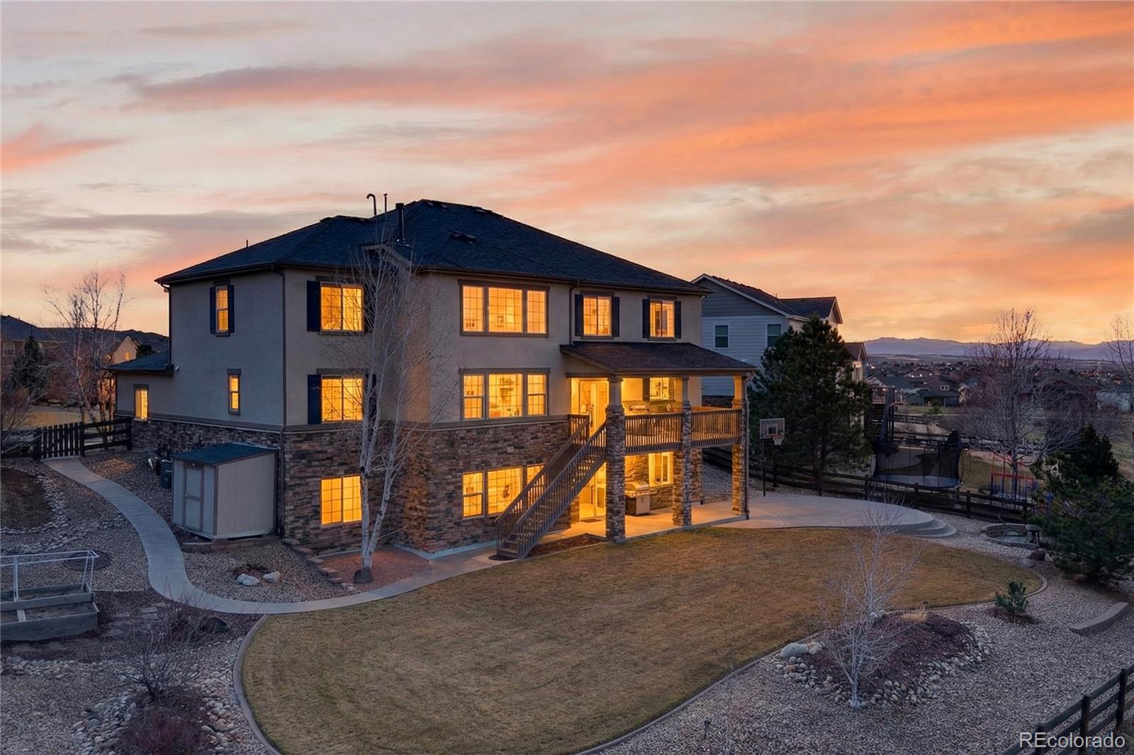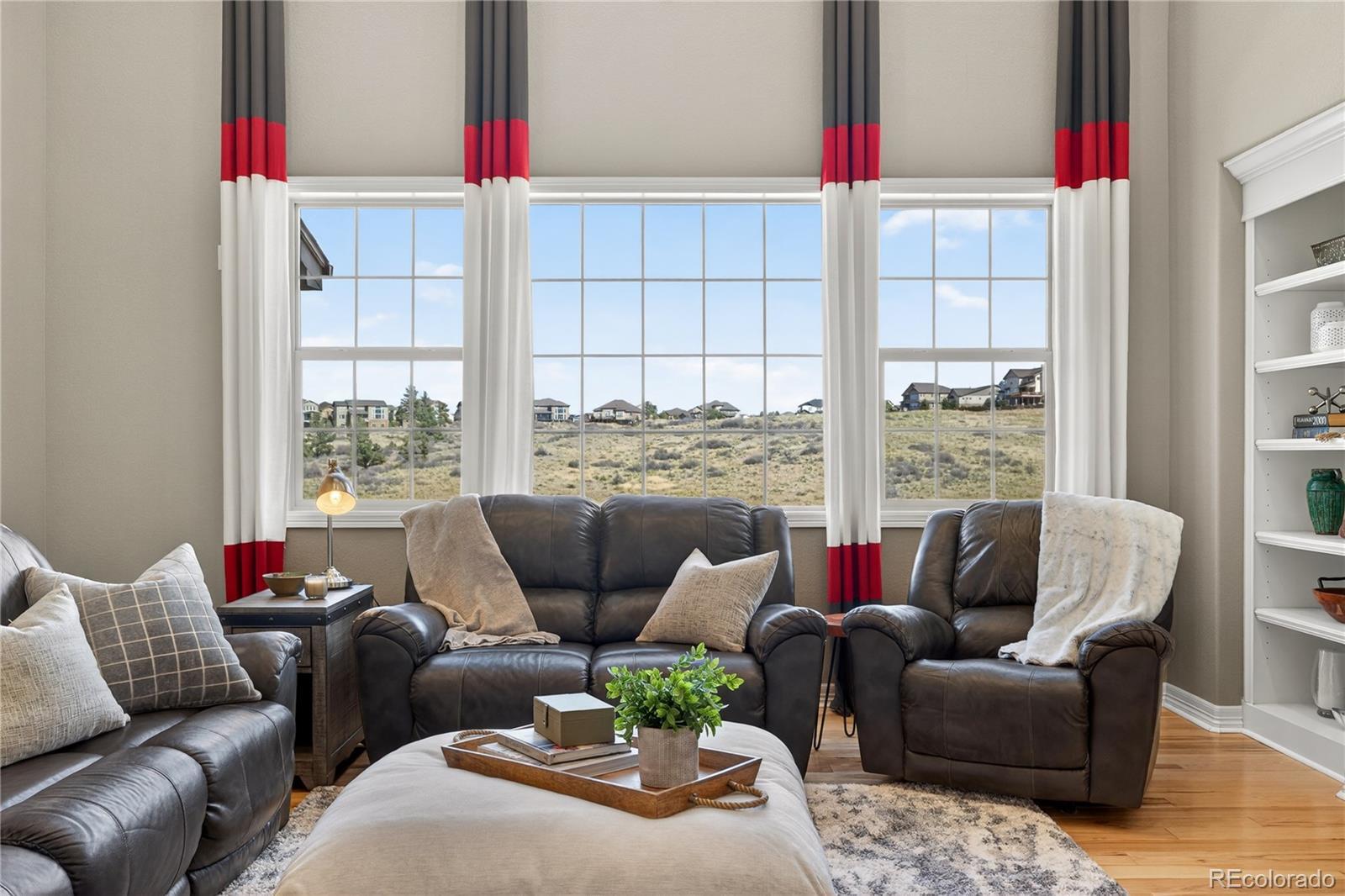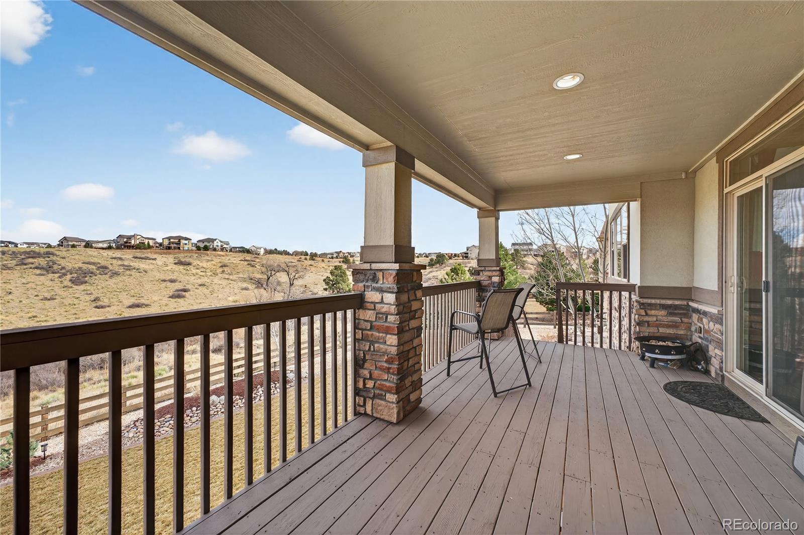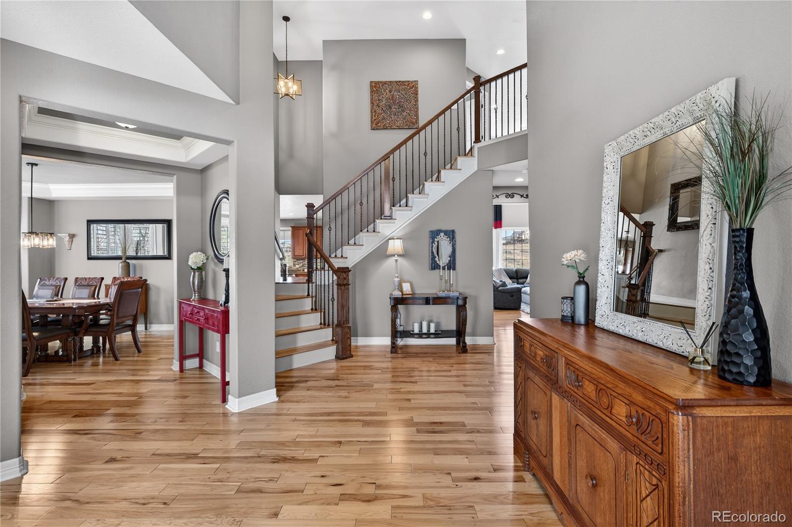 Welcome to an exceptional south-facing home perfectly positioned on a large lot backing to open space with sweeping city & mountain views. Located in a quiet neighborhood known for community events, a pool & clubhouse, & top-rated schools within walking distance, this home offers the ideal balance of privacy, connection, & convenience with easy access to trails & minimal traffic. A grand two-story entry showcases a stunning wrought iron staircase & extensive hardwood flooring, while newer carpet in the main floor bedroom & upstairs bedrooms in 2024 adds a fresh & luxurious feel. Plantation shutters, bay windows in the living & dining rooms, soaring two-story ceilings in the family room, living room, & entry, & elegant architectural details including crown molding & a coffered ceiling in the formal dining room create a refined yet welcoming atmosphere. The gourmet kitchen features granite countertops, stainless steel appliances, a large island, & seamless flow into the two-story family room filled with natural light. A designated office & a secondary primary suite on the main floor with its own bathroom & walk-in closet provide flexibility for guests or multigenerational living. Upstairs, the expansive primary suite offers dual vanities, a large soaking tub, & a generous walk-in closet. Every bedroom includes a walk-in closet, enhancing both function & storage throughout. The walk-out basement is designed for entertaining with a massive media & game room, wet bar, additional bedroom, & ample storage. Enjoy Colorado living at its finest from the covered deck or patio & basketball court, all surrounded by upgraded landscaping & open space views. Additional highlights include a mudroom with built-ins, a laundry room with cabinets & sink, high-impact roof shingles, two 50-gallon water heaters, & two HVAC units for comfort year-round. This is an exceptional opportunity to own a home that checks every box & then some!