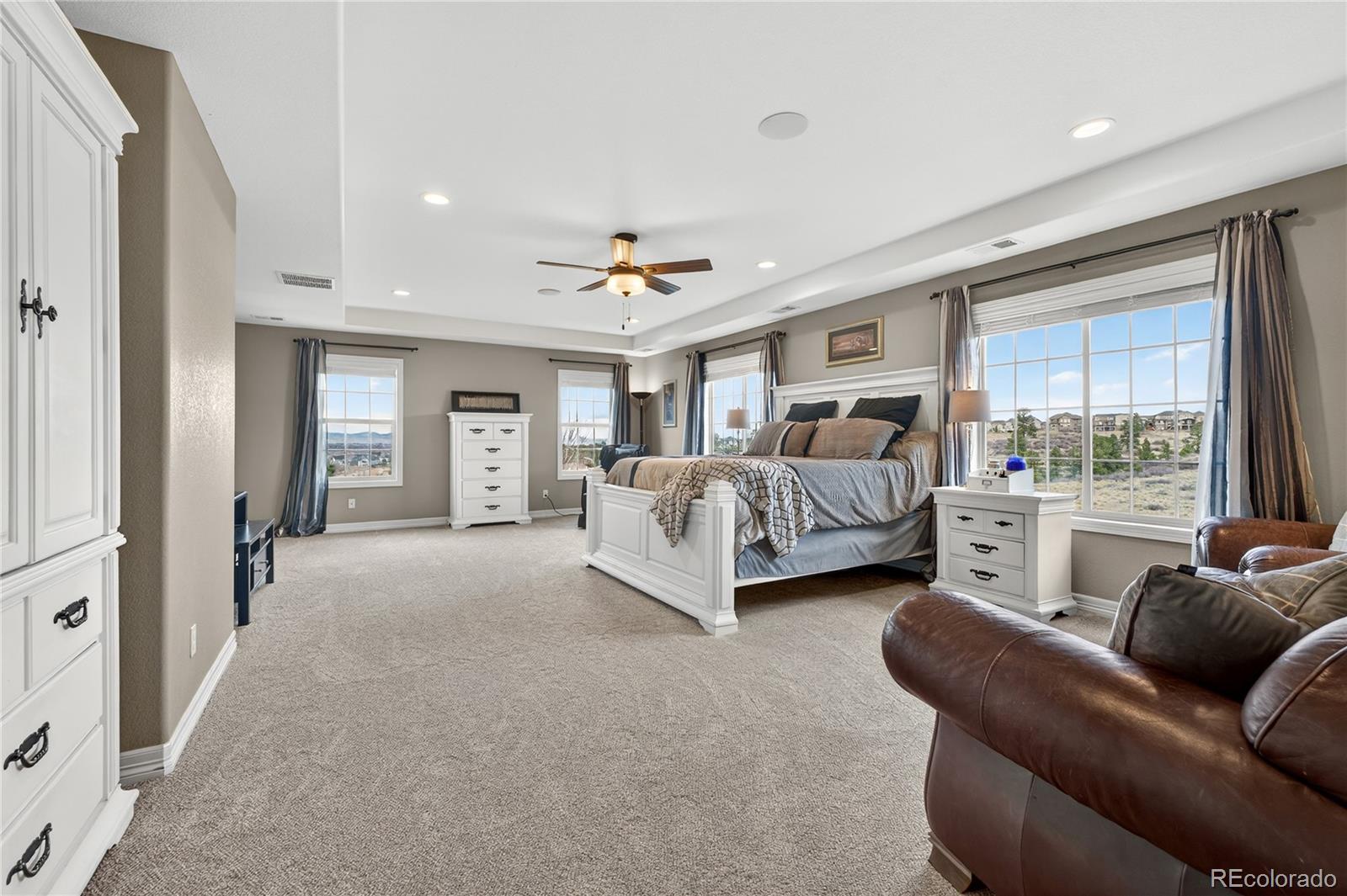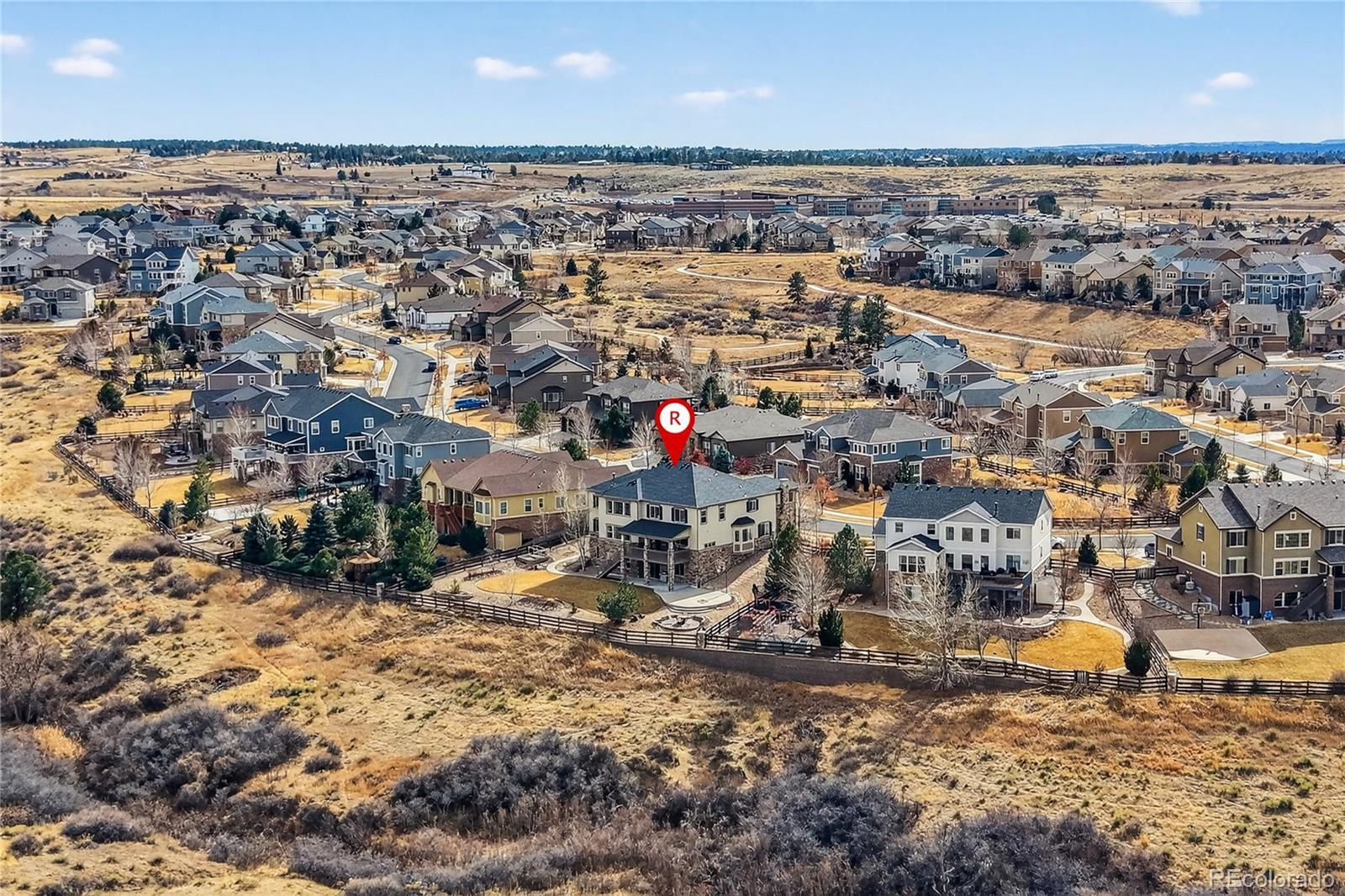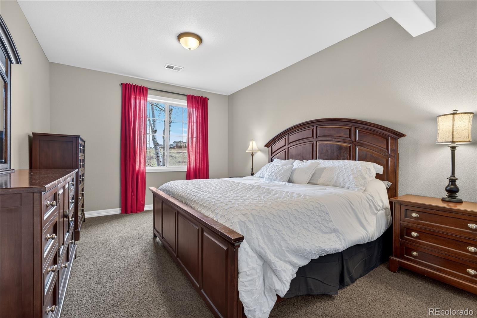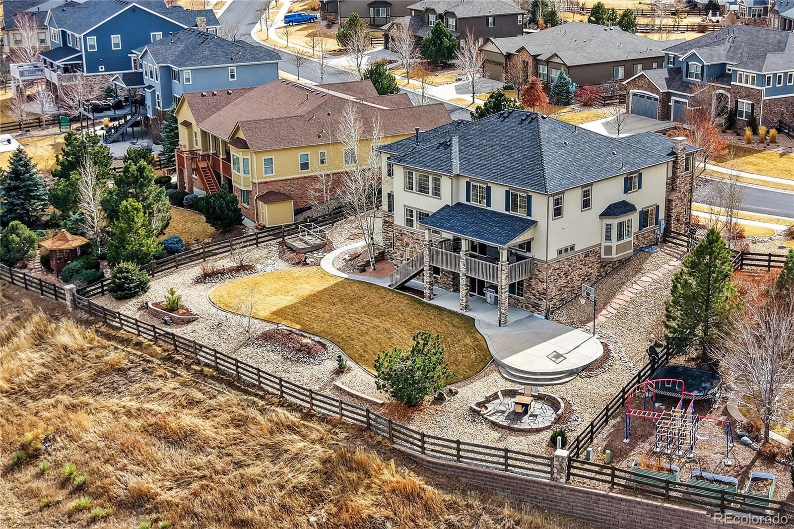 Welcome to an exceptional south-facing home perfectly positioned on a large lot backing to open space with sweeping city & mountain views. Located in a quiet neighborhood known for community events, a pool & clubhouse, & top-rated schools within walking distance, this home offers the ideal balance of privacy, connection, & convenience with easy access to trails & minimal traffic. A grand two-story entry showcases a stunning wrought iron staircase & extensive hardwood flooring, while newer carpet in the main floor bedroom & upstairs bedrooms in 2024 adds a fresh & luxurious feel. Plantation shutters, bay windows in the living & dining rooms, soaring two-story ceilings in the family room, living room, & entry, & elegant architectural details including crown molding & a coffered ceiling in the formal dining room create a refined yet welcoming atmosphere. The gourmet kitchen features granite countertops, stainless steel appliances, a large island, & seamless flow into the two-story family room filled with natural light. A designated office & a secondary primary suite on the main floor with its own bathroom & walk-in closet provide flexibility for guests or multigenerational living. Upstairs, the expansive primary suite offers dual vanities, a large soaking tub, & a generous walk-in closet. Every bedroom includes a walk-in closet, enhancing both function & storage throughout. The walk-out basement is designed for entertaining with a massive media & game room, wet bar, additional bedroom, & ample storage. Enjoy Colorado living at its finest from the covered deck or patio & basketball court, all surrounded by upgraded landscaping & open space views. Additional highlights include a mudroom with built-ins, a laundry room with cabinets & sink, high-impact roof shingles, two 50-gallon water heaters, & two HVAC units for comfort year-round. This is an exceptional opportunity to own a home that checks every box & then some!