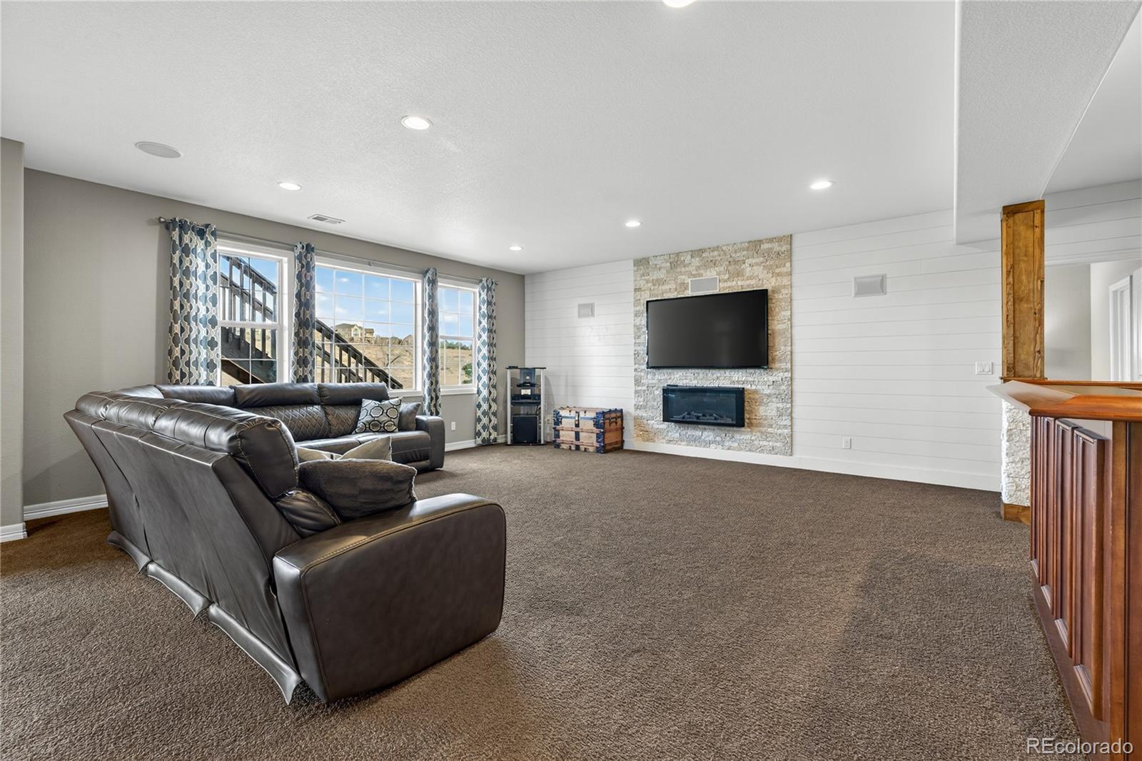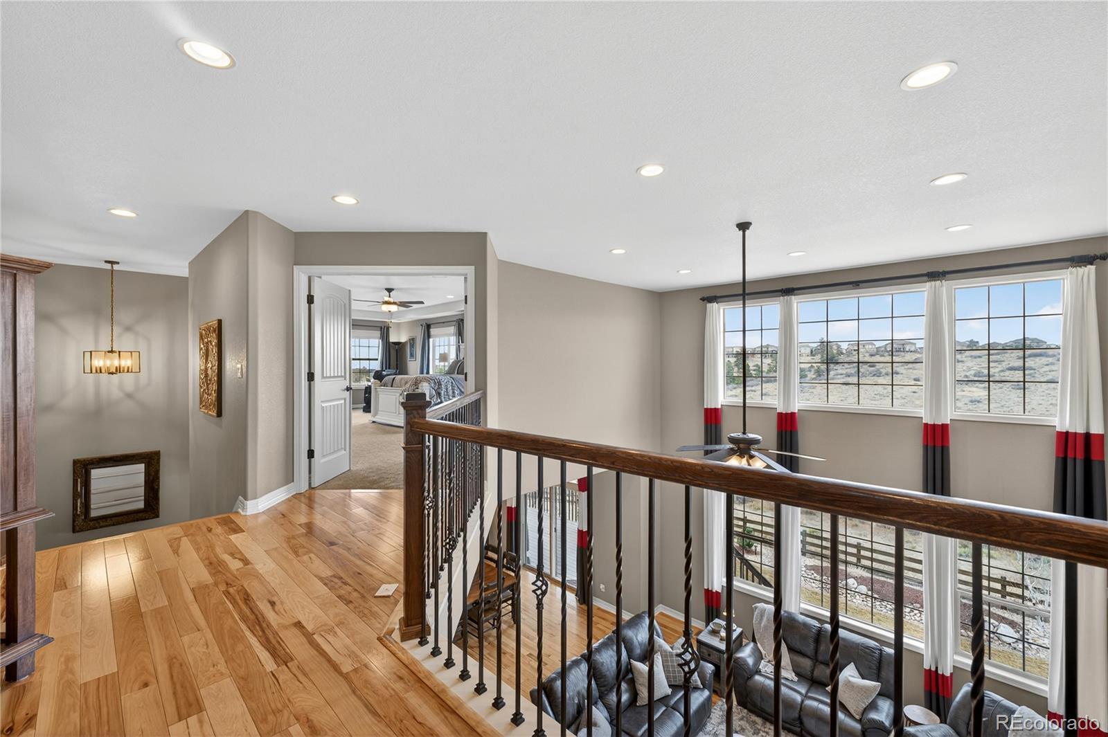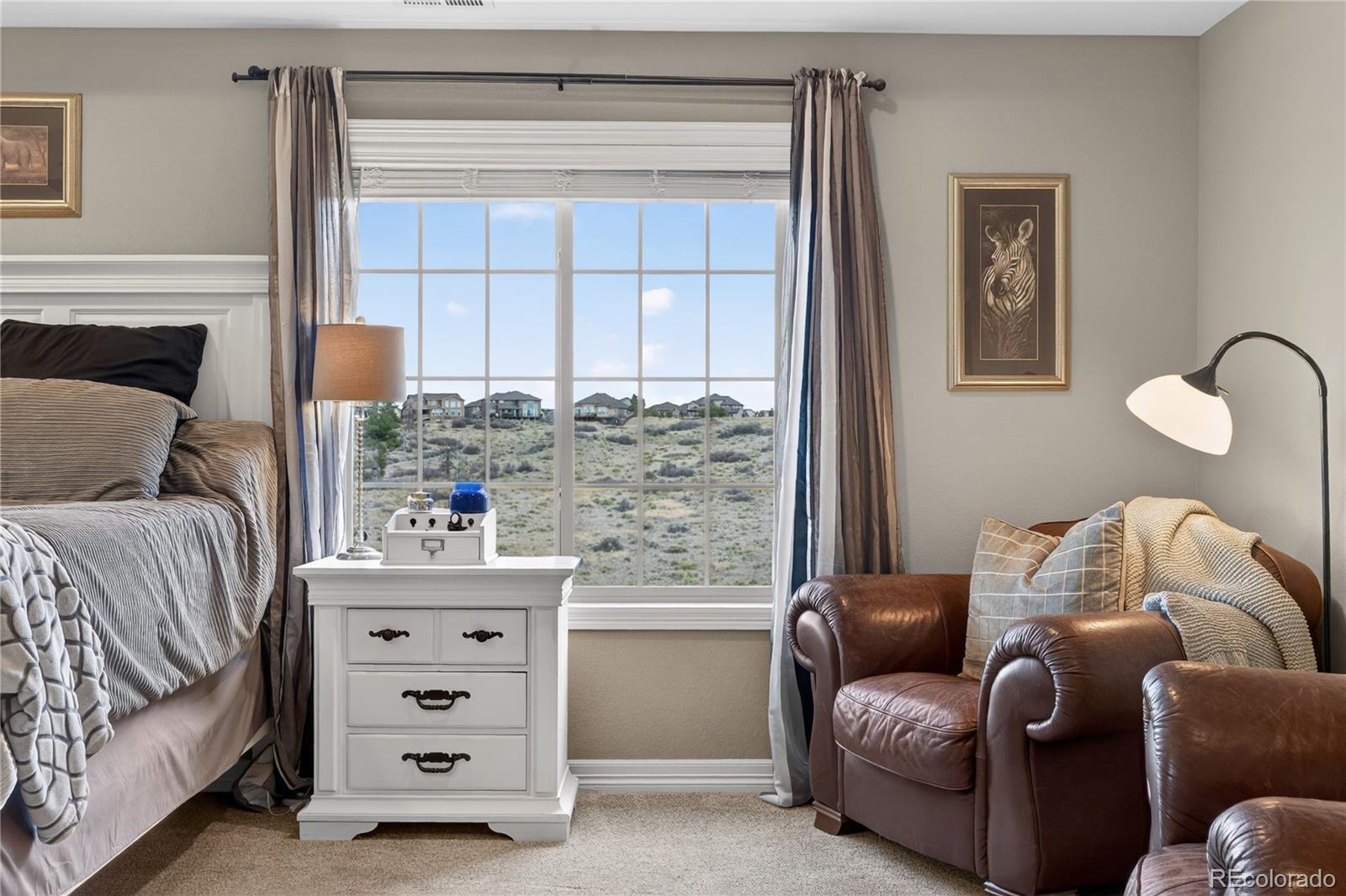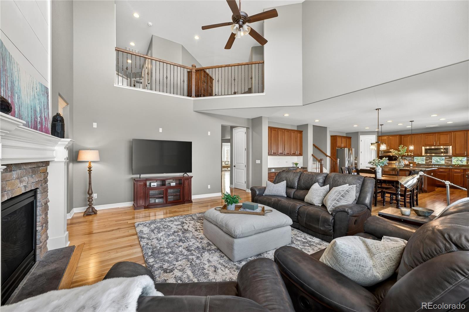 Welcome to an exceptional south-facing home perfectly positioned on a large lot backing to open space with sweeping city & mountain views. Located in a quiet neighborhood known for community events, a pool & clubhouse, & top-rated schools within walking distance, this home offers the ideal balance of privacy, connection, & convenience with easy access to trails & minimal traffic. A grand two-story entry showcases a stunning wrought iron staircase & extensive hardwood flooring, while newer carpet in the main floor bedroom & upstairs bedrooms in 2024 adds a fresh & luxurious feel. Plantation shutters, bay windows in the living & dining rooms, soaring two-story ceilings in the family room, living room, & entry, & elegant architectural details including crown molding & a coffered ceiling in the formal dining room create a refined yet welcoming atmosphere. The gourmet kitchen features granite countertops, stainless steel appliances, a large island, & seamless flow into the two-story family room filled with natural light. A designated office & a secondary primary suite on the main floor with its own bathroom & walk-in closet provide flexibility for guests or multigenerational living. Upstairs, the expansive primary suite offers dual vanities, a large soaking tub, & a generous walk-in closet. Every bedroom includes a walk-in closet, enhancing both function & storage throughout. The walk-out basement is designed for entertaining with a massive media & game room, wet bar, additional bedroom, & ample storage. Enjoy Colorado living at its finest from the covered deck or patio & basketball court, all surrounded by upgraded landscaping & open space views. Additional highlights include a mudroom with built-ins, a laundry room with cabinets & sink, high-impact roof shingles, two 50-gallon water heaters, & two HVAC units for comfort year-round. This is an exceptional opportunity to own a home that checks every box & then some!