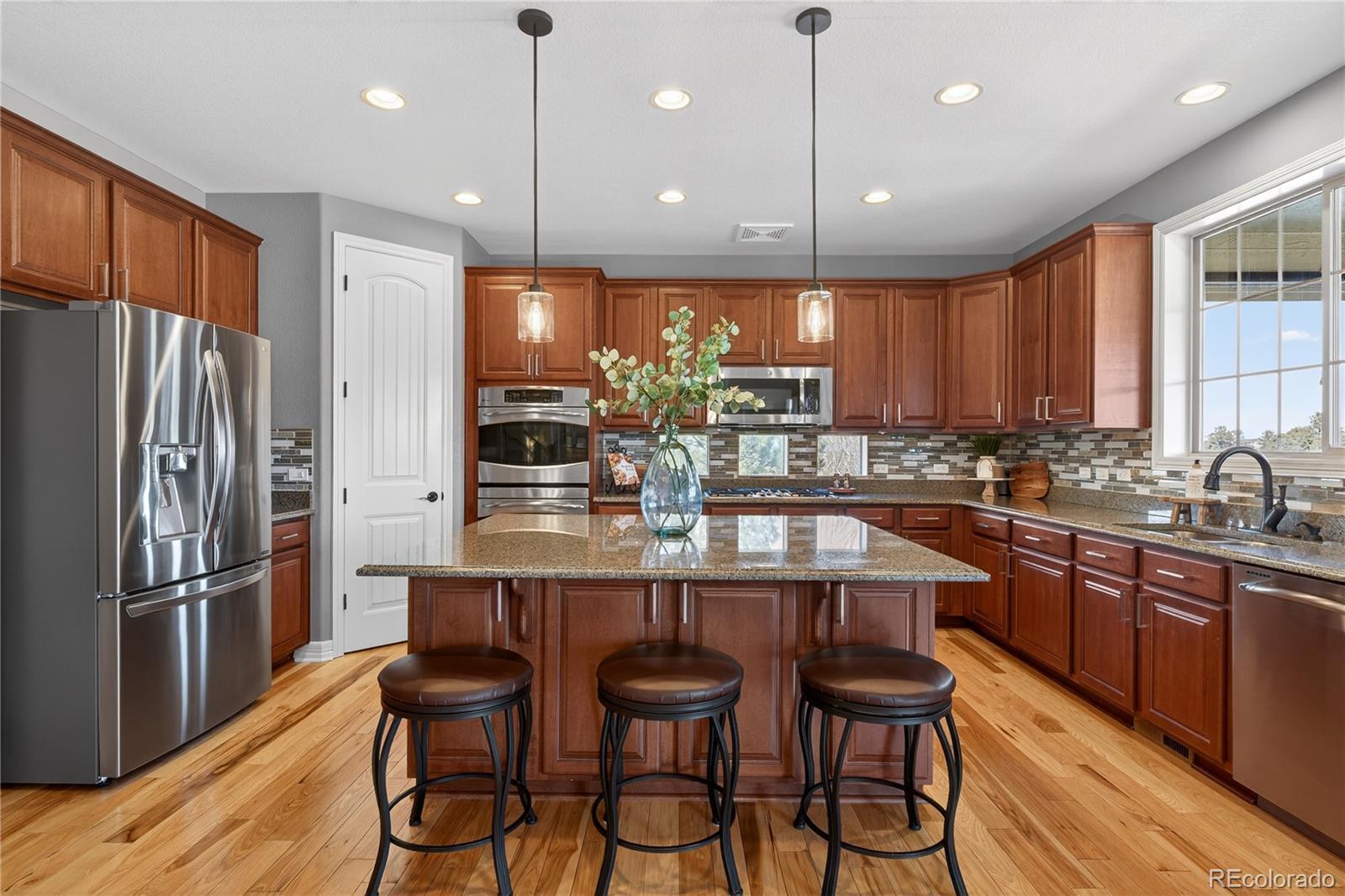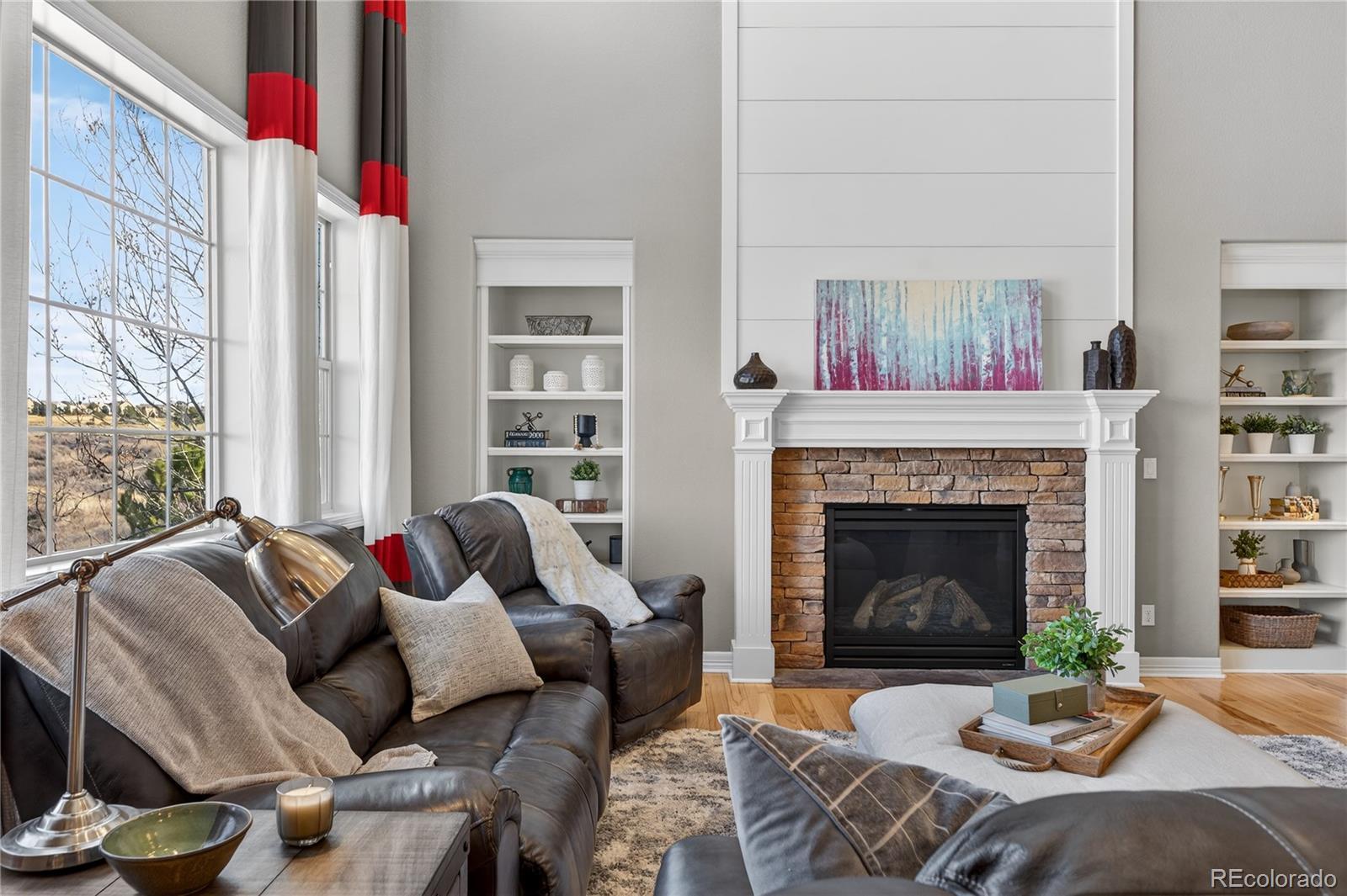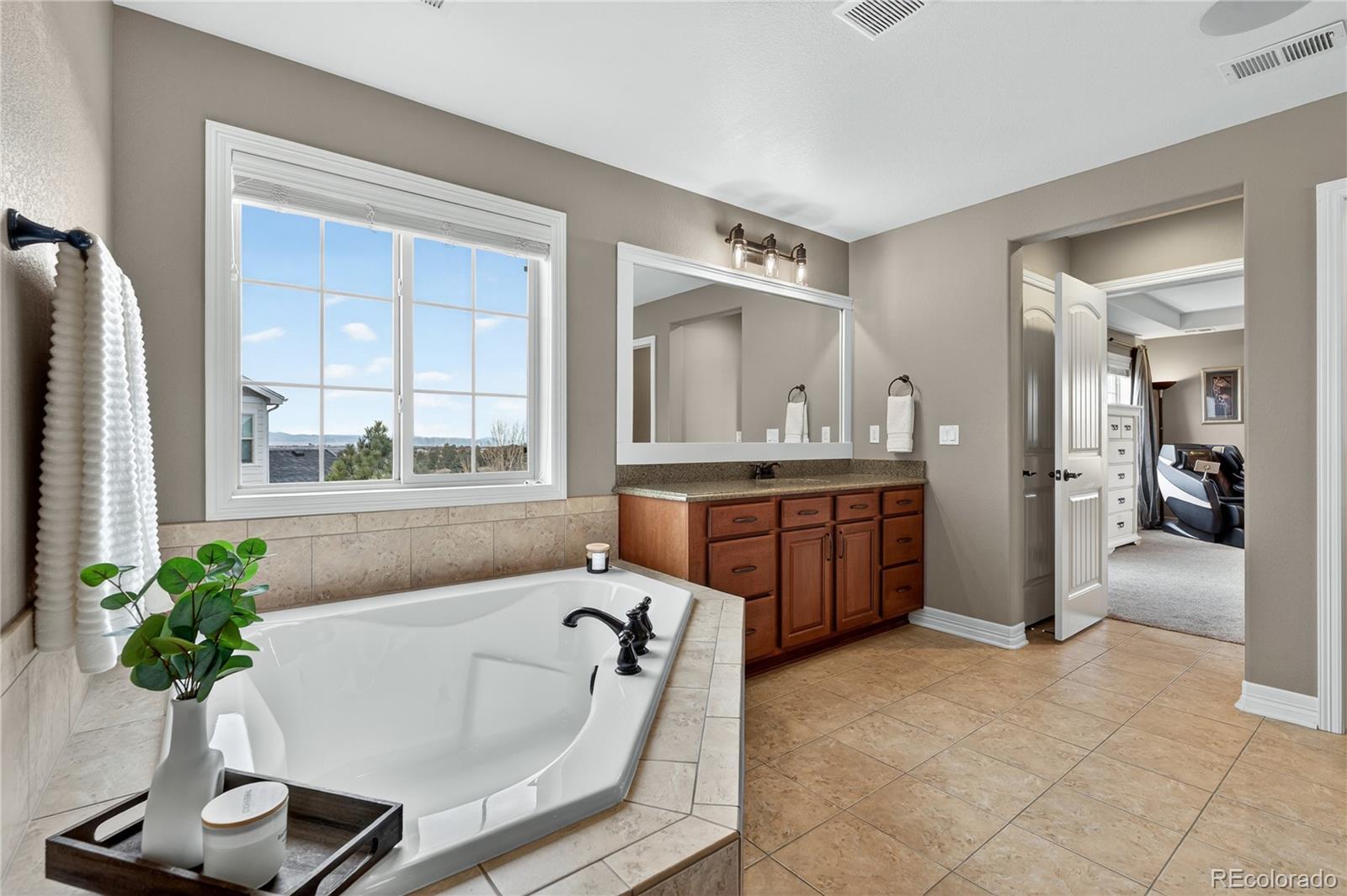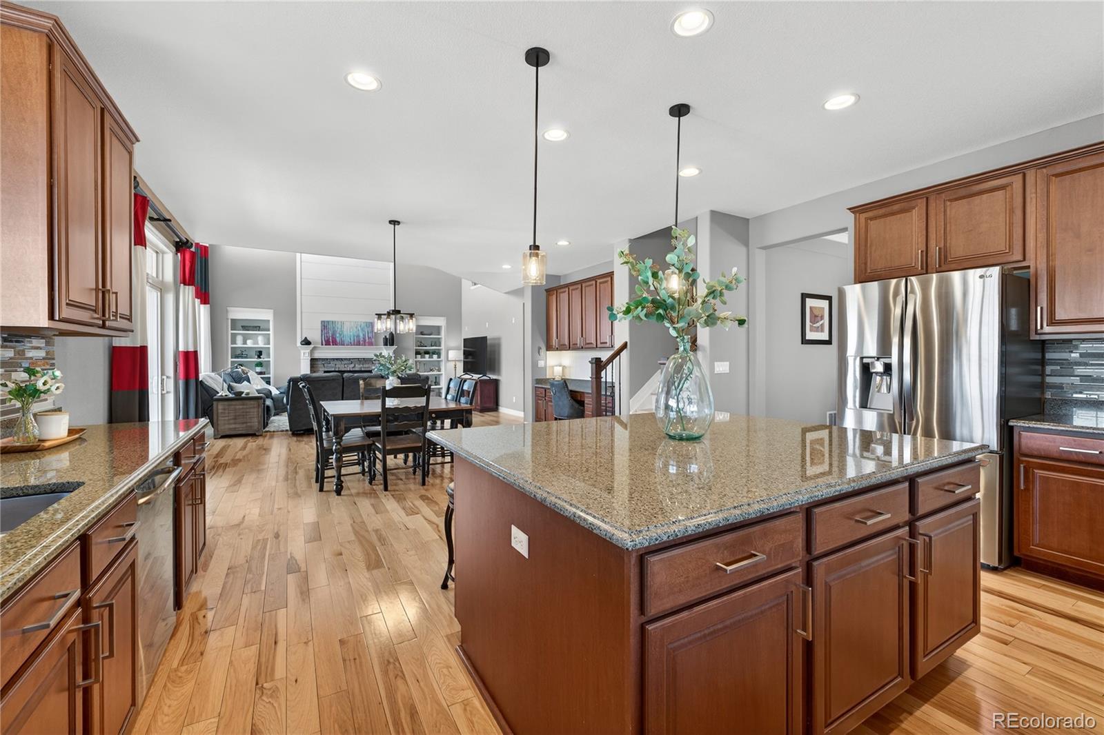 Welcome to an exceptional south-facing home perfectly positioned on a large lot backing to open space with sweeping city & mountain views. Located in a quiet neighborhood known for community events, a pool & clubhouse, & top-rated schools within walking distance, this home offers the ideal balance of privacy, connection, & convenience with easy access to trails & minimal traffic. A grand two-story entry showcases a stunning wrought iron staircase & extensive hardwood flooring, while newer carpet in the main floor bedroom & upstairs bedrooms in 2024 adds a fresh & luxurious feel. Plantation shutters, bay windows in the living & dining rooms, soaring two-story ceilings in the family room, living room, & entry, & elegant architectural details including crown molding & a coffered ceiling in the formal dining room create a refined yet welcoming atmosphere. The gourmet kitchen features granite countertops, stainless steel appliances, a large island, & seamless flow into the two-story family room filled with natural light. A designated office & a secondary primary suite on the main floor with its own bathroom & walk-in closet provide flexibility for guests or multigenerational living. Upstairs, the expansive primary suite offers dual vanities, a large soaking tub, & a generous walk-in closet. Every bedroom includes a walk-in closet, enhancing both function & storage throughout. The walk-out basement is designed for entertaining with a massive media & game room, wet bar, additional bedroom, & ample storage. Enjoy Colorado living at its finest from the covered deck or patio & basketball court, all surrounded by upgraded landscaping & open space views. Additional highlights include a mudroom with built-ins, a laundry room with cabinets & sink, high-impact roof shingles, two 50-gallon water heaters, & two HVAC units for comfort year-round. This is an exceptional opportunity to own a home that checks every box & then some!