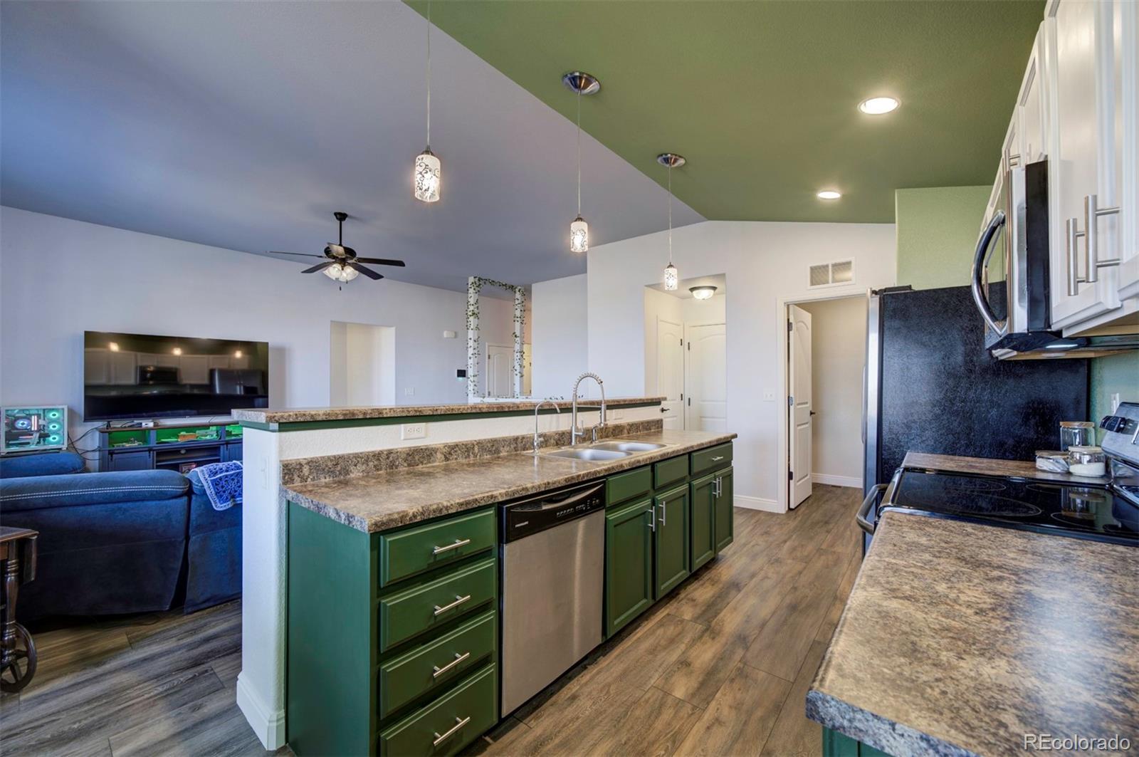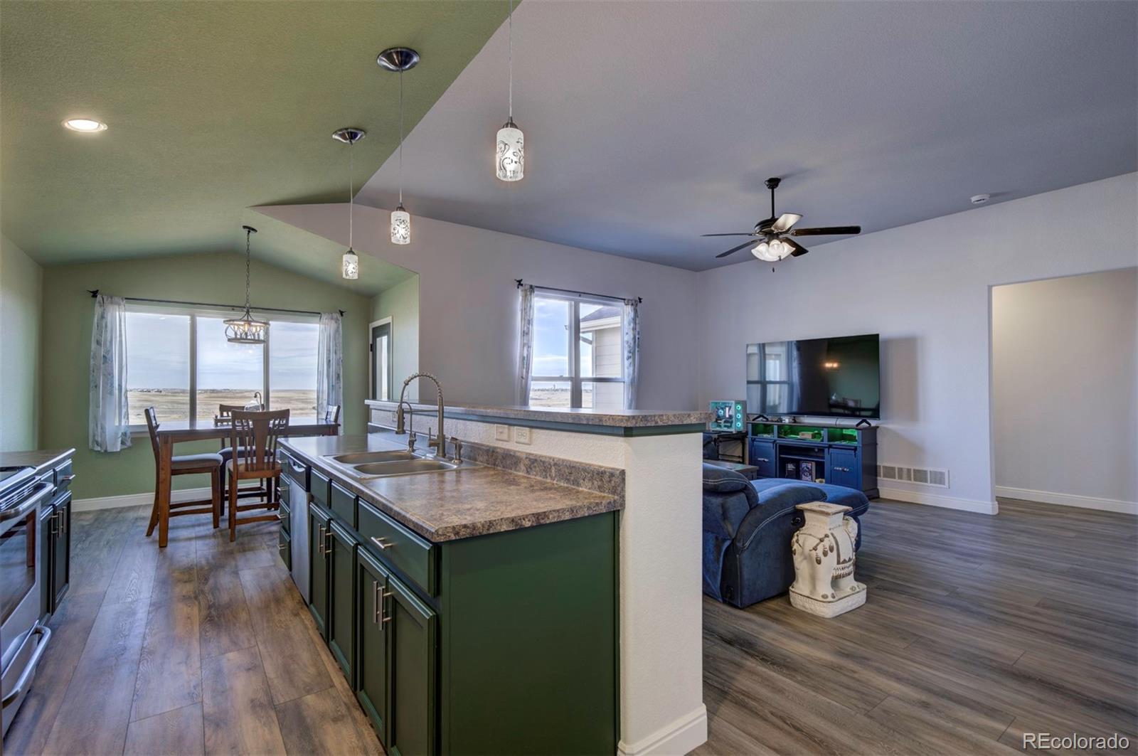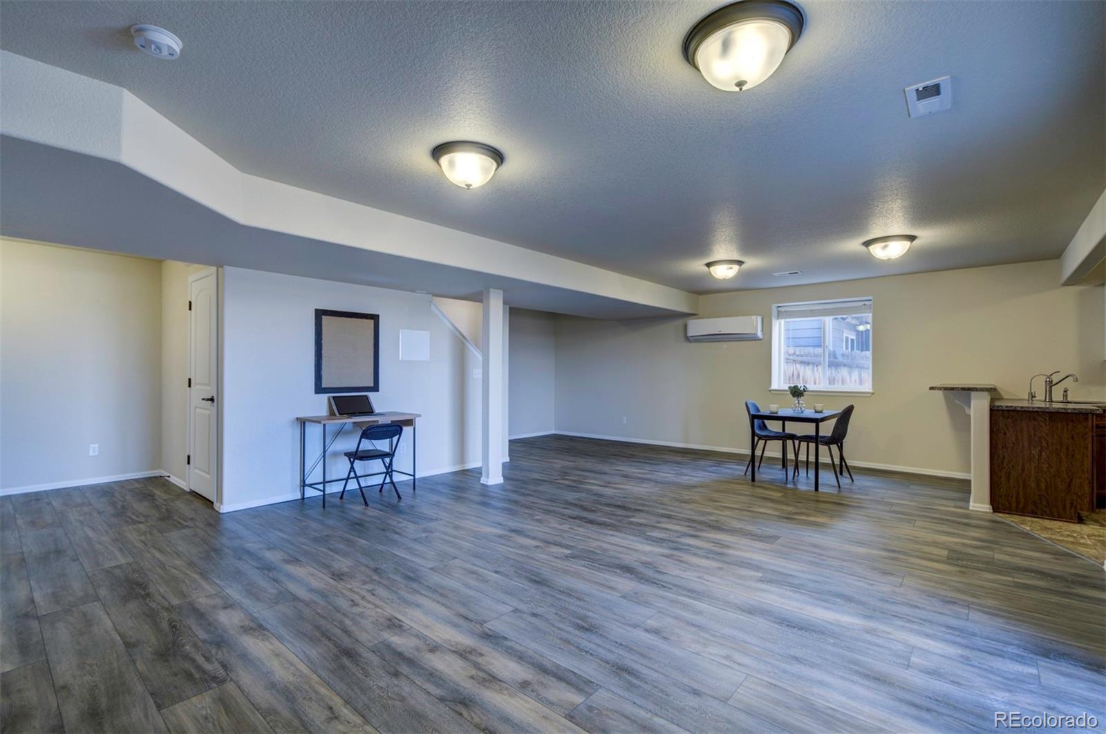 Beautiful Ranch-Style Home with Walkout Basement and Stunning Views! Welcome to this spacious 5-bedroom, 3-bath ranch home located in the desirable Painted Sky at Waterview community. Thoughtfully designed for comfort and functionality, this home offers both main-level living and a beautifully finished walkout basement—perfect for multi-generational living or entertaining. The main level features a bright, open layout with luxury vinyl flooring throughout, a large living room, and a dining area with a walkout to a wooden deck offering unobstructed views of open space and Big Johnson Reservoir. The kitchen is equipped with stainless steel appliances, a pantry, and a breakfast bar for casual dining. The primary suite includes an adjoining full bath and walk-in closet, while two additional bedrooms and another full bath complete the main level. A separate laundry room with shelving, a coat closet, and a welcoming foyer add to the convenience. The finished walkout basement is an entertainer’s dream, featuring a spacious family room with a mini split system and media/projector wiring, a kitchenette/wet bar, and direct access to a concrete patio. The basement also includes one bedroom with a full bath, a non-conforming bedroom with a large walk-in closet, and under-stair storage. Additional highlights include central air, ceiling fans, auto sprinkler system, sump pump, radon mitigation system, mini split with inverter heat pump, new luxury vinyl flooring, added cabinetry and shelving, and a newer storm door. Enjoy the peaceful setting with no rear neighbors while still being conveniently located near Fort Carson, Peterson AFB, Schriever AFB, Colorado Springs Airport, and the Powers Corridor, offering easy access to shopping, restaurants, and entertainment. Don’t miss the opportunity to own this well-maintained, move-in ready home with incredible views and versatile living space!