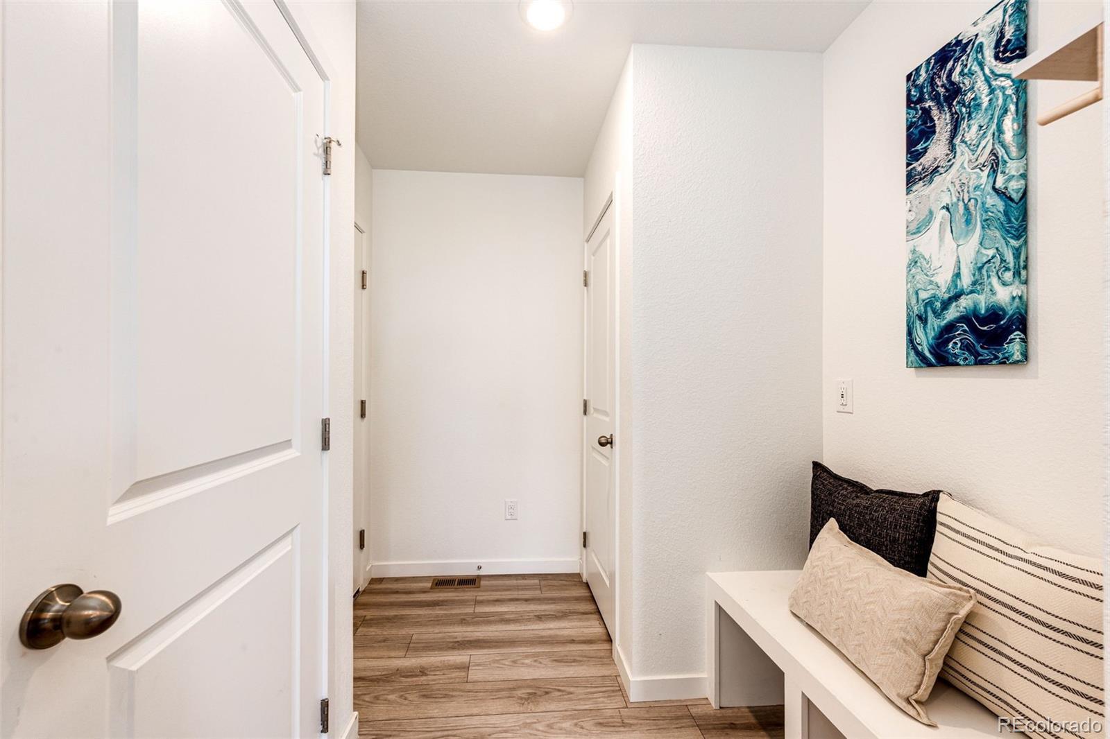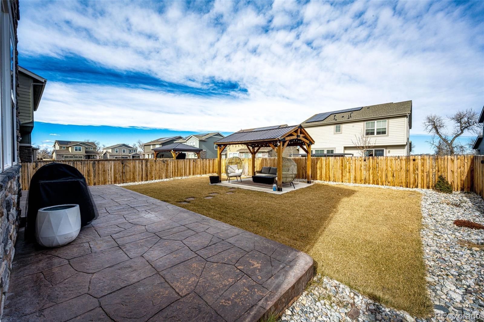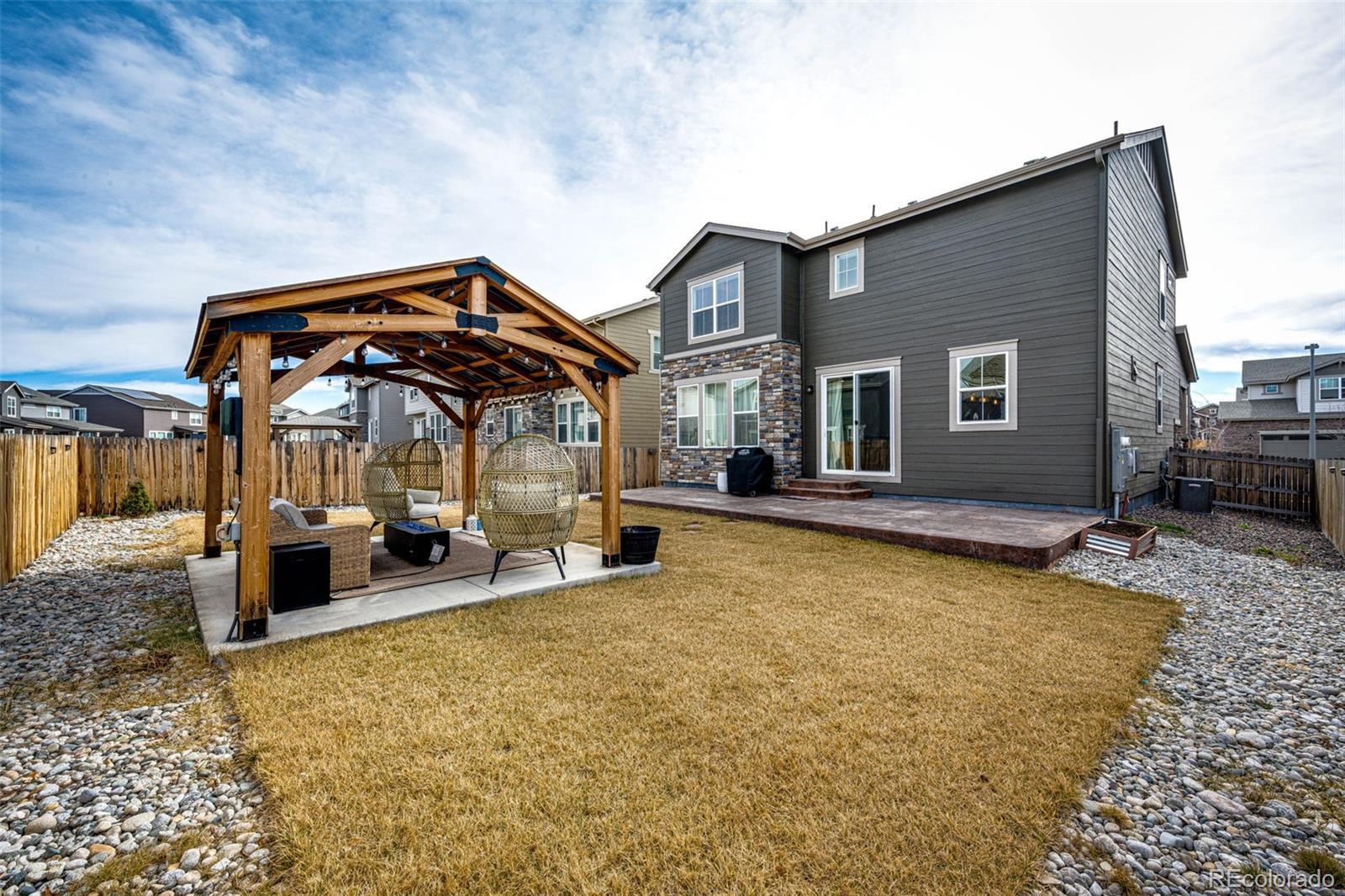 Welcome to this better-than-new two-story home, ideally located in the quiet Waterstone neighborhood with nearby trails, open space, and parks. A covered front porch welcomes you into a light-filled main level interior designed for comfortable, modern living and showcases the beautifully engineered vinyl plank flooring. The gourmet kitchen is the heart of the main level, featuring quartz countertops, a stylish backsplash, and stainless steel appliances, including a gas stove. Just off the kitchen, a versatile bonus room, with a built-in desk and windows, is ready for a home office, kitchen extension, or creative space. The dining room opens to the spacious great room and provides easy access to the backyard, perfect for everyday living and entertaining. A functional mudroom area with a built-in bench and wall hooks sits just off the two-car garage, which is equipped with a universal EV charging station. A charming half bath with beadboard detailing completes the main level. Upstairs, custom design touches include a statement hallway accent wall along with additional living space. The primary bedroom offers a spacious private retreat, separated from the secondary bedrooms, with an ensuite bath featuring double quartz vanities with a built-in seating area, a step-in tiled shower, and a large walk-in closet. Three additional bedrooms and a full bath provide flexibility for guests or home office needs. Wood blinds in all privacy rooms add style and comfort while smart home features throughout provide convenience and efficiency. Additional storage is available in the 6-foot crawl space. Enjoy the thoughtfully designed backyard with an extended stamped concrete patio and covered gazebo. Like new and move-in ready with many upgrades already completed, this home is conveniently located near Buckley Space Force Base, DIA, Southlands Mall, and I-70/E-470.