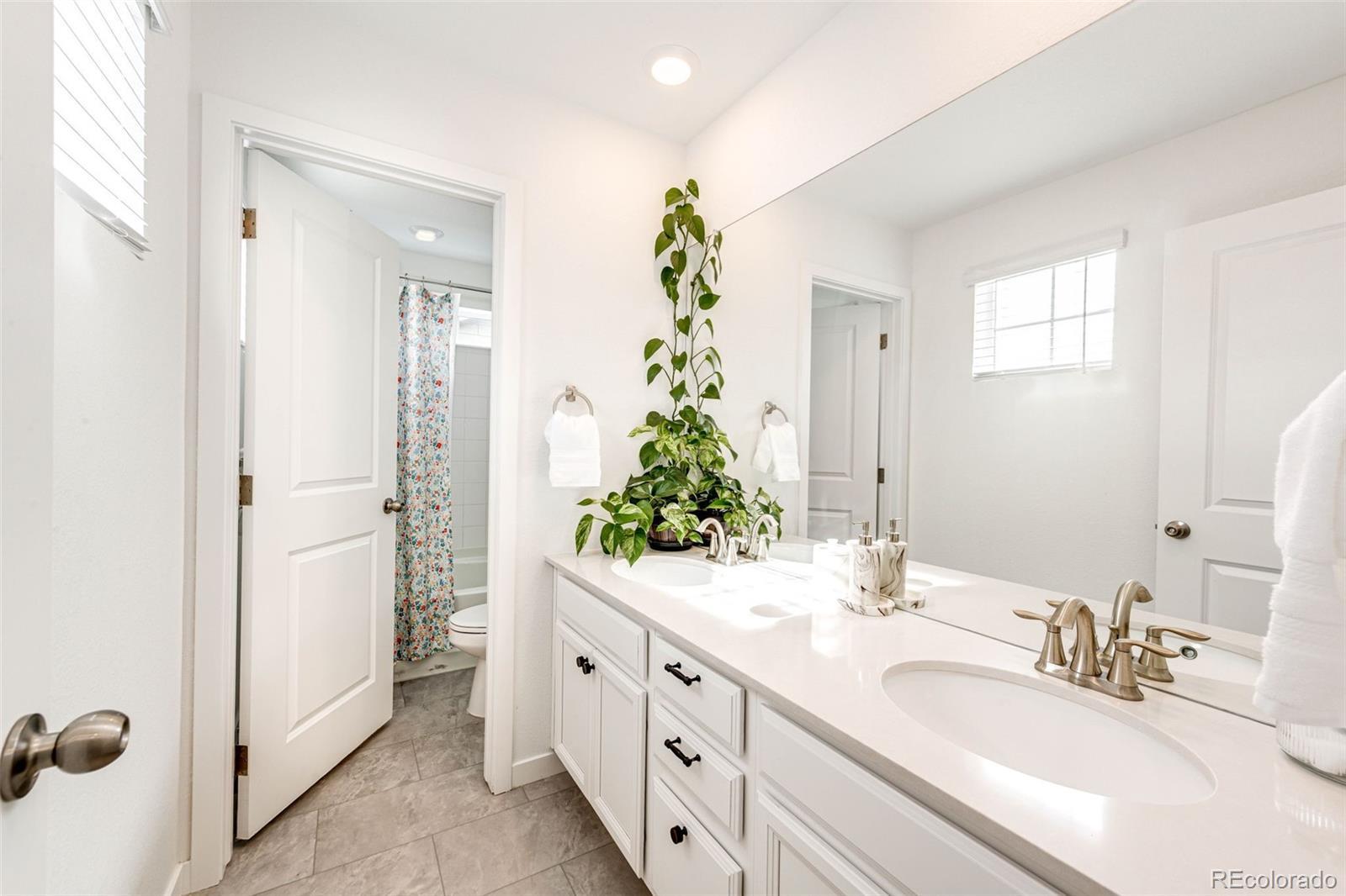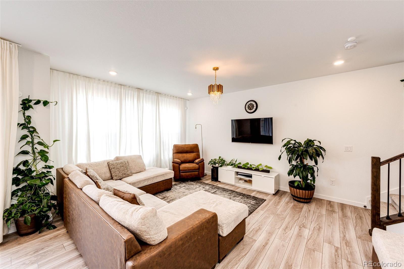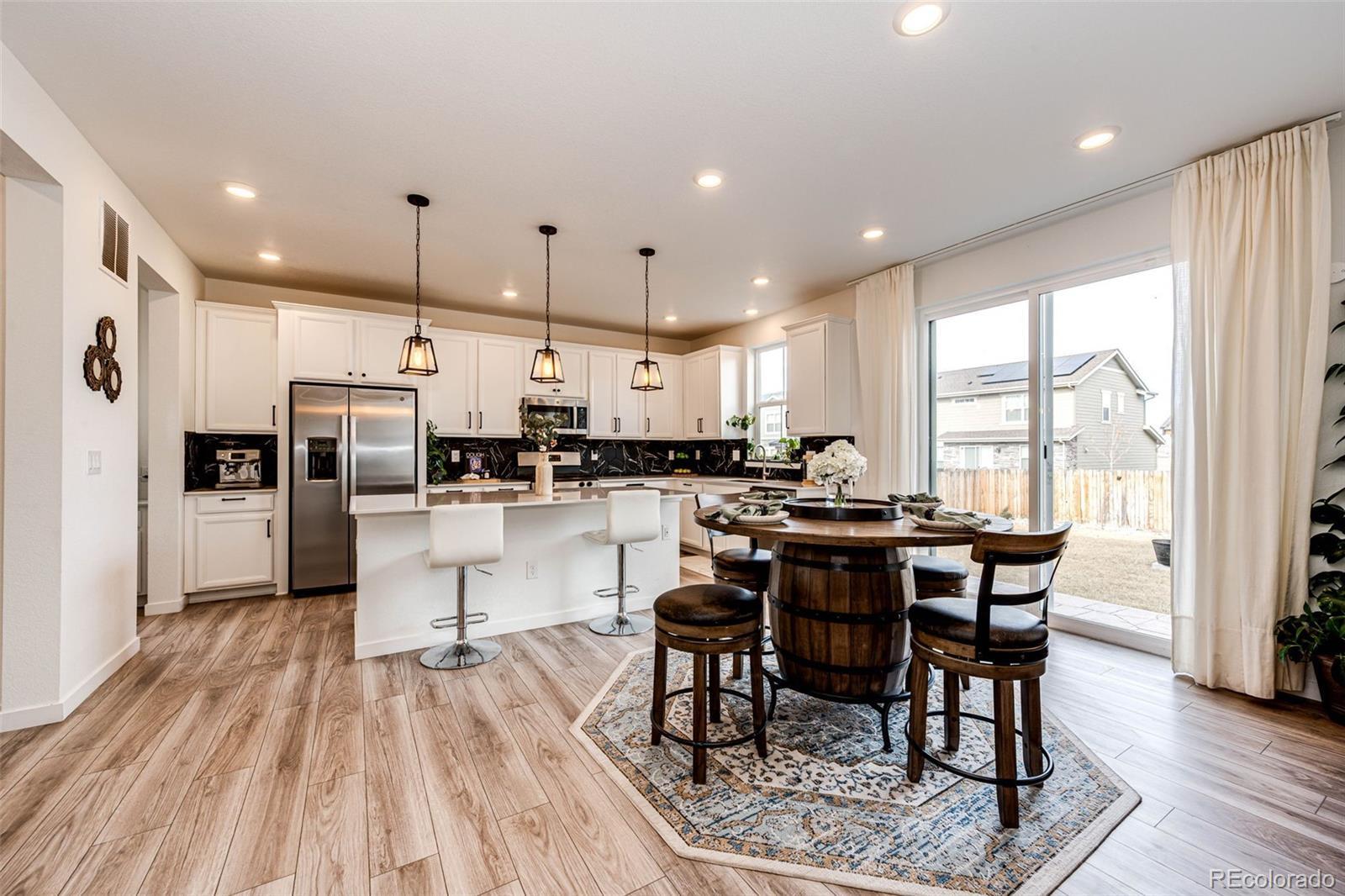 Welcome to this better-than-new two-story home, ideally located in the quiet Waterstone neighborhood with nearby trails, open space, and parks. A covered front porch welcomes you into a light-filled main level interior designed for comfortable, modern living and showcases the beautifully engineered vinyl plank flooring. The gourmet kitchen is the heart of the main level, featuring quartz countertops, a stylish backsplash, and stainless steel appliances, including a gas stove. Just off the kitchen, a versatile bonus room, with a built-in desk and windows, is ready for a home office, kitchen extension, or creative space. The dining room opens to the spacious great room and provides easy access to the backyard, perfect for everyday living and entertaining. A functional mudroom area with a built-in bench and wall hooks sits just off the two-car garage, which is equipped with a universal EV charging station. A charming half bath with beadboard detailing completes the main level. Upstairs, custom design touches include a statement hallway accent wall along with additional living space. The primary bedroom offers a spacious private retreat, separated from the secondary bedrooms, with an ensuite bath featuring double quartz vanities with a built-in seating area, a step-in tiled shower, and a large walk-in closet. Three additional bedrooms and a full bath provide flexibility for guests or home office needs. Wood blinds in all privacy rooms add style and comfort while smart home features throughout provide convenience and efficiency. Additional storage is available in the 6-foot crawl space. Enjoy the thoughtfully designed backyard with an extended stamped concrete patio and covered gazebo. Like new and move-in ready with many upgrades already completed, this home is conveniently located near Buckley Space Force Base, DIA, Southlands Mall, and I-70/E-470.