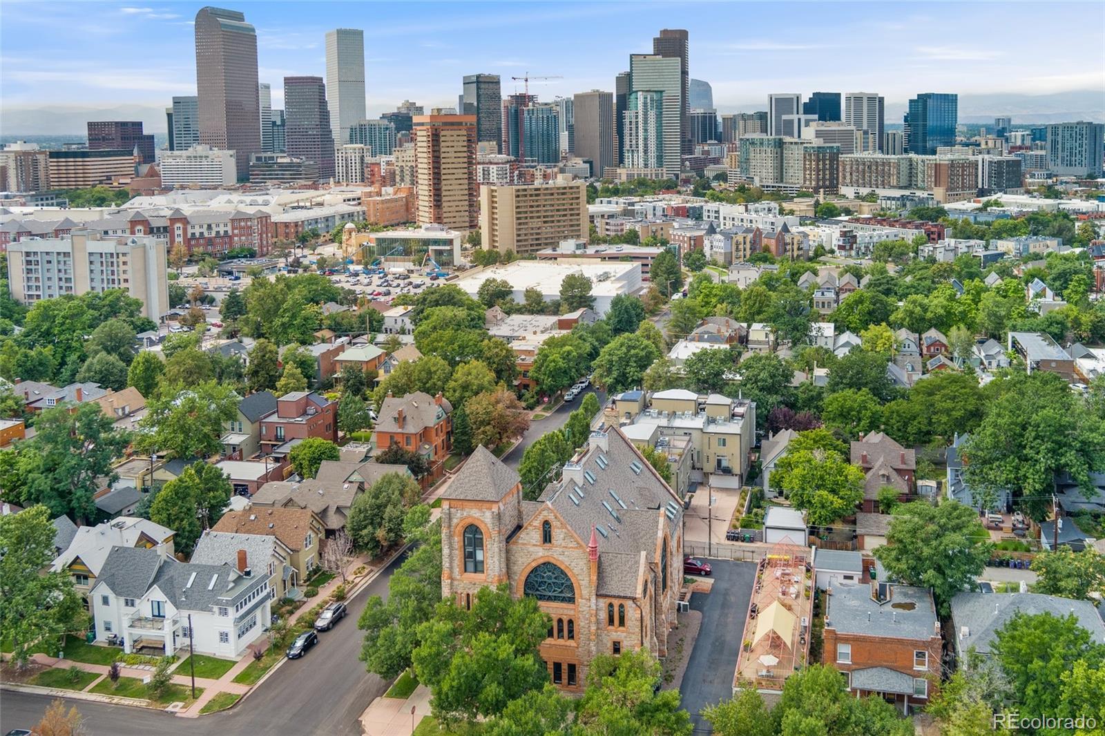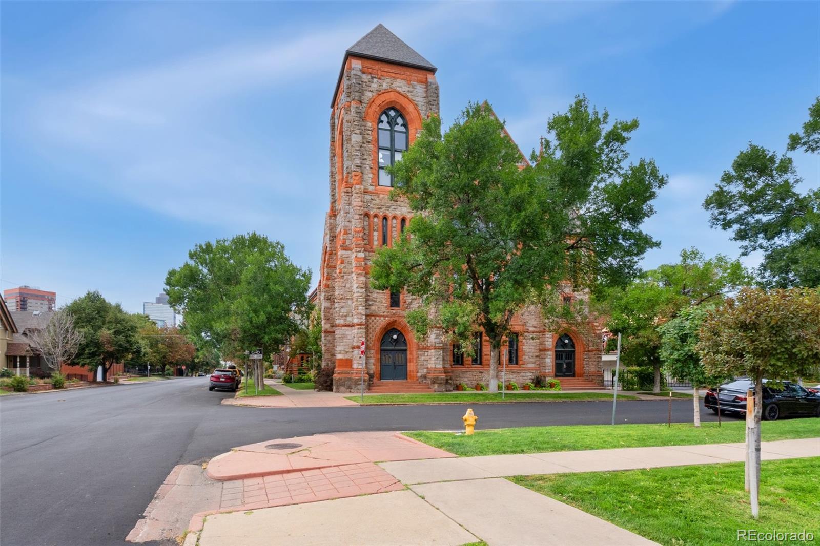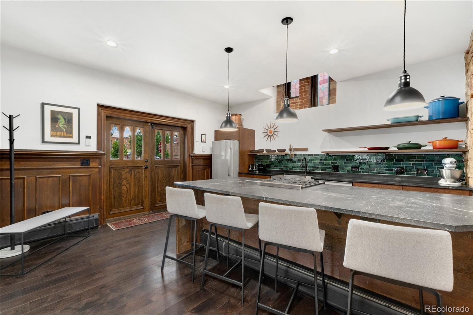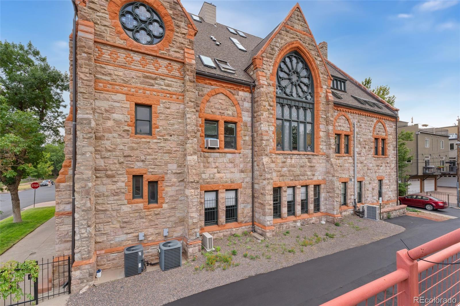 Discover this one-of-a-kind condo on the first floor of a historic church built in 1889, located in Denver’s sought-after San Rafael neighborhood! With its own private entrance, 14-foot ceilings, and 7-foot windows, this remarkable home blends timeless architecture with modern living. Enter through the original double church doors to find the expansive kitchen complete with high-end appliances, a large island with stone countertops and seating, a built-in hutch, and striking stained glass windows that make the space both functional and breathtaking. Continue into the sunken living room to find soaring ceilings adorned with belt-driven fans, natural stone walls, and light-filled spaces that highlight the church’s original beauty. Off of the spacious living room you'll find a tucked-away office/library nook with a built-in bookcase that offers the perfect work-from-home or reading space. Down the hall, the character carries through to the bedroom with high ceilings and stone details, while a walk-in closet and loft area provide ample storage. A stylish 3/4 bath with in-unit laundry adds everyday convenience. Beyond the walls of the home, enjoy the shared rooftop patio complete with lounge areas, fireplace, and gardens—an urban oasis in the heart of the city. One gated, exclusive-use parking space makes coming and going a breeze, and additional storage is available in the basement of the building for your convenience. With its stunning historic architecture, private entrance, incredible natural light, and unbeatable location near Denver’s best dining, parks, and entertainment, this rare condo offers a truly extraordinary living experience!