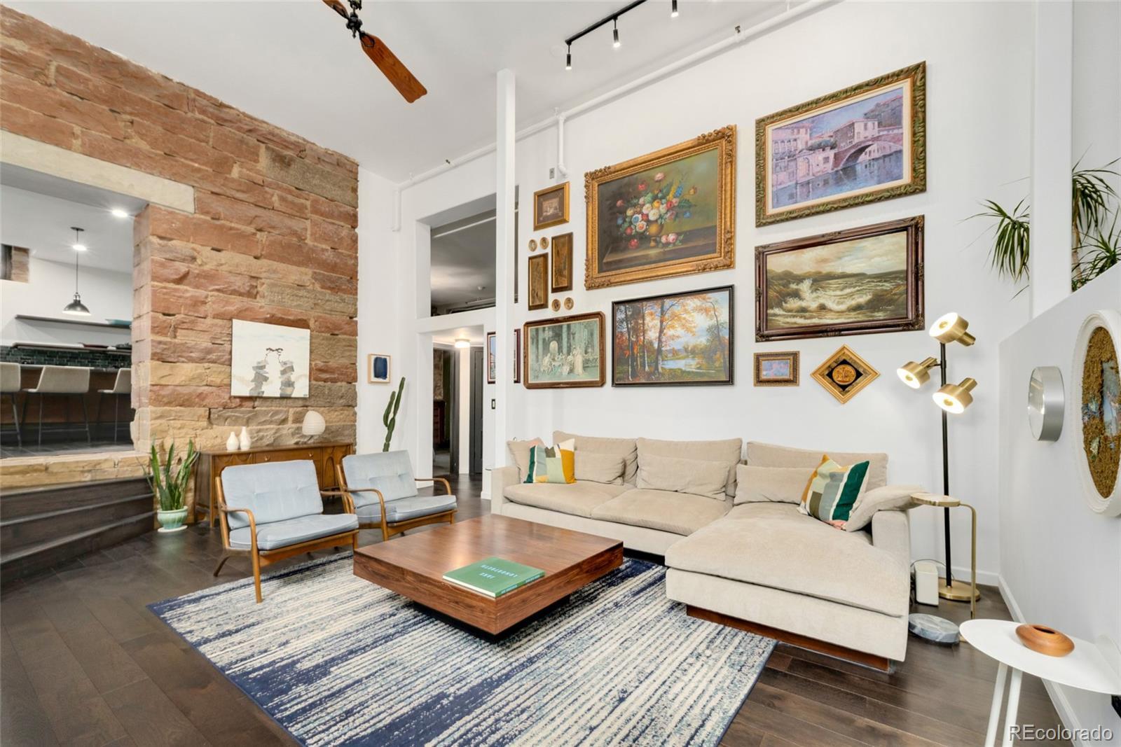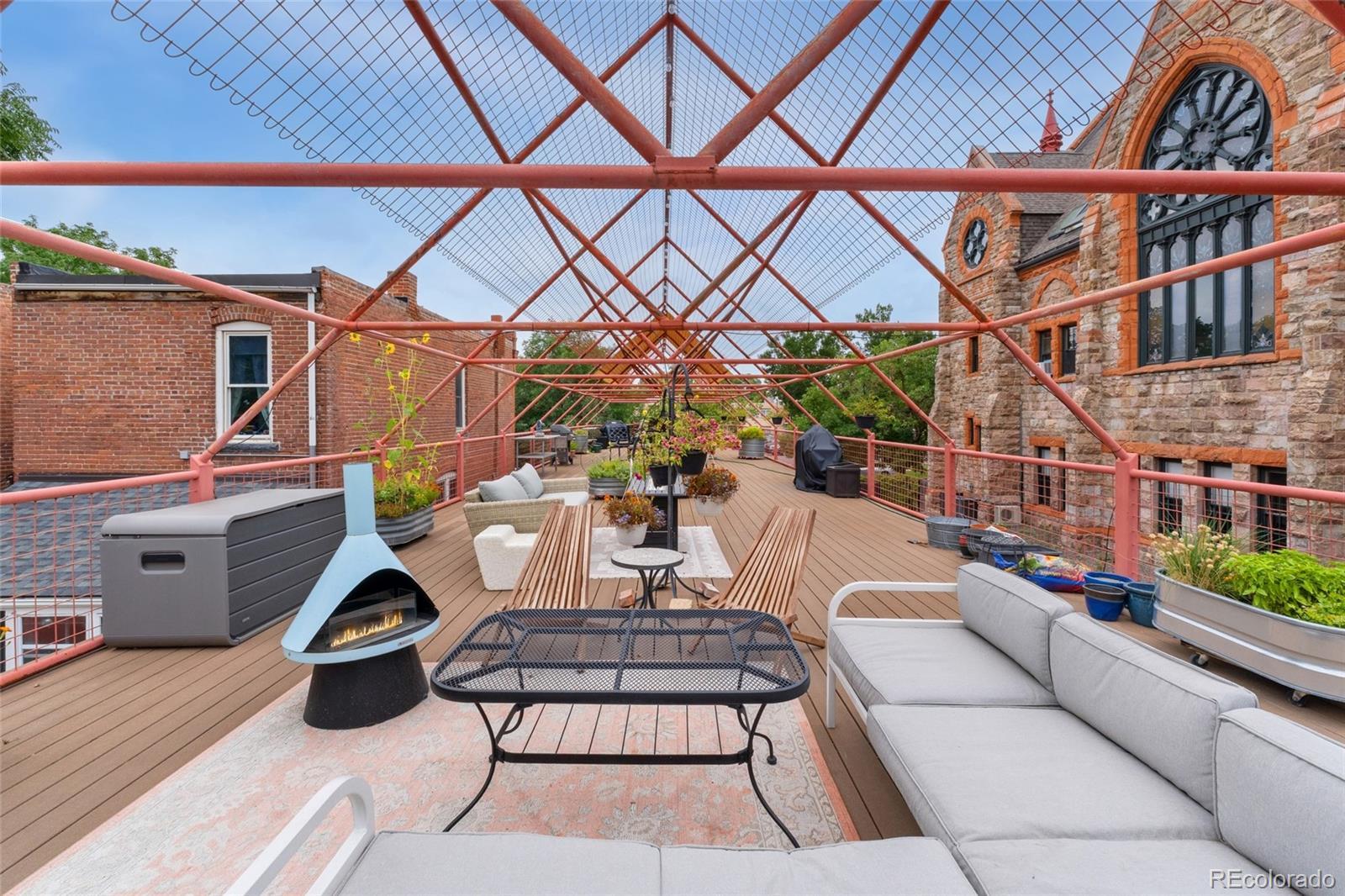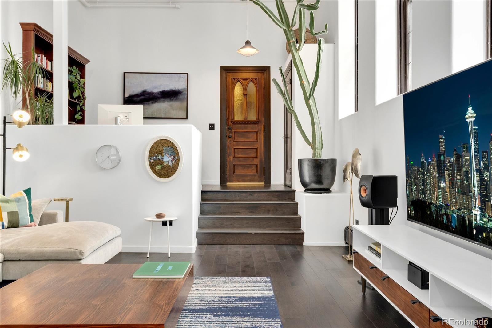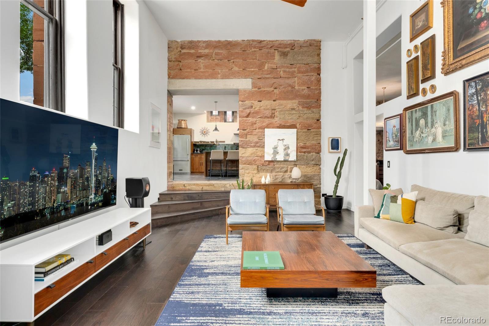 Discover this one-of-a-kind condo on the first floor of a historic church built in 1889, located in Denver’s sought-after San Rafael neighborhood! With its own private entrance, 14-foot ceilings, and 7-foot windows, this remarkable home blends timeless architecture with modern living. Enter through the original double church doors to find the expansive kitchen complete with high-end appliances, a large island with stone countertops and seating, a built-in hutch, and striking stained glass windows that make the space both functional and breathtaking. Continue into the sunken living room to find soaring ceilings adorned with belt-driven fans, natural stone walls, and light-filled spaces that highlight the church’s original beauty. Off of the spacious living room you'll find a tucked-away office/library nook with a built-in bookcase that offers the perfect work-from-home or reading space. Down the hall, the character carries through to the bedroom with high ceilings and stone details, while a walk-in closet and loft area provide ample storage. A stylish 3/4 bath with in-unit laundry adds everyday convenience. Beyond the walls of the home, enjoy the shared rooftop patio complete with lounge areas, fireplace, and gardens—an urban oasis in the heart of the city. One gated, exclusive-use parking space makes coming and going a breeze, and additional storage is available in the basement of the building for your convenience. With its stunning historic architecture, private entrance, incredible natural light, and unbeatable location near Denver’s best dining, parks, and entertainment, this rare condo offers a truly extraordinary living experience!