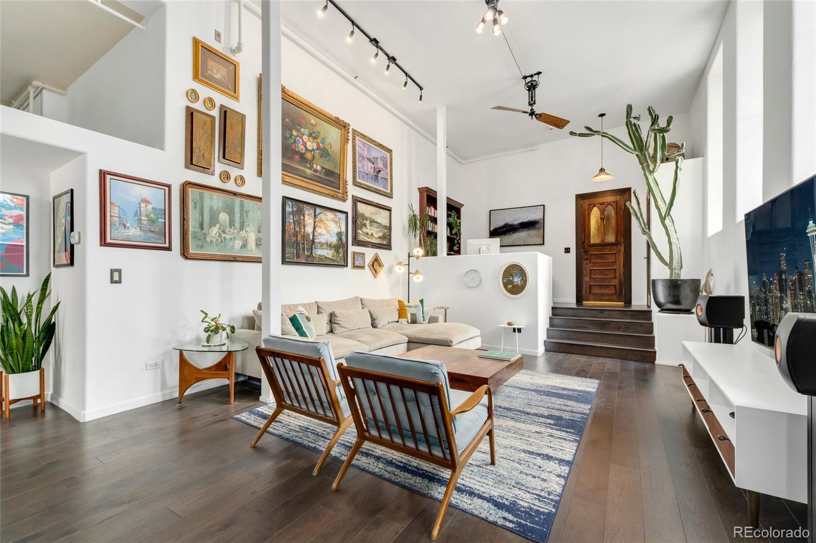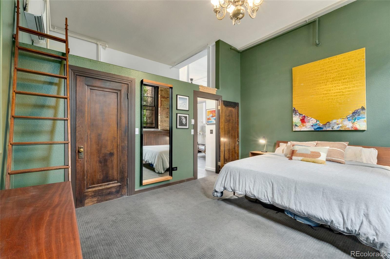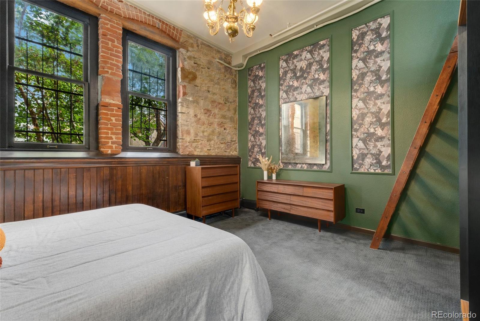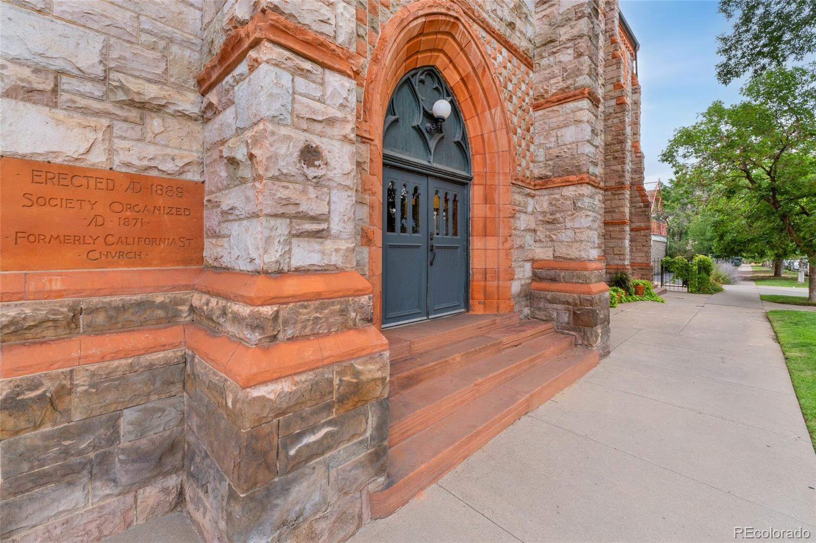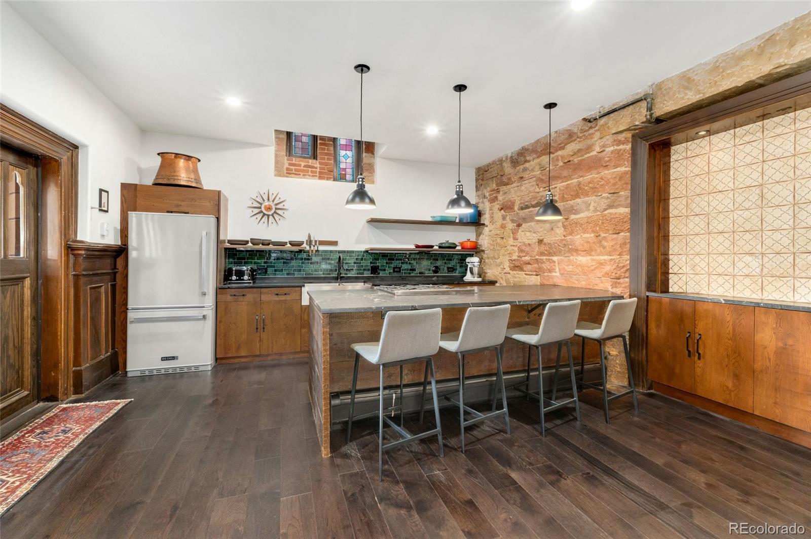 Discover this one-of-a-kind condo on the first floor of a historic church built in 1889, located in Denver’s sought-after San Rafael neighborhood! With its own private entrance, 14-foot ceilings, and 7-foot windows, this remarkable home blends timeless architecture with modern living. Enter through the original double church doors to find the expansive kitchen complete with high-end appliances, a large island with stone countertops and seating, a built-in hutch, and striking stained glass windows that make the space both functional and breathtaking. Continue into the sunken living room to find soaring ceilings adorned with belt-driven fans, natural stone walls, and light-filled spaces that highlight the church’s original beauty. Off of the spacious living room you'll find a tucked-away office/library nook with a built-in bookcase that offers the perfect work-from-home or reading space. Down the hall, the character carries through to the bedroom with high ceilings and stone details, while a walk-in closet and loft area provide ample storage. A stylish 3/4 bath with in-unit laundry adds everyday convenience. Beyond the walls of the home, enjoy the shared rooftop patio complete with lounge areas, fireplace, and gardens—an urban oasis in the heart of the city. One gated, exclusive-use parking space makes coming and going a breeze, and additional storage is available in the basement of the building for your convenience. With its stunning historic architecture, private entrance, incredible natural light, and unbeatable location near Denver’s best dining, parks, and entertainment, this rare condo offers a truly extraordinary living experience!