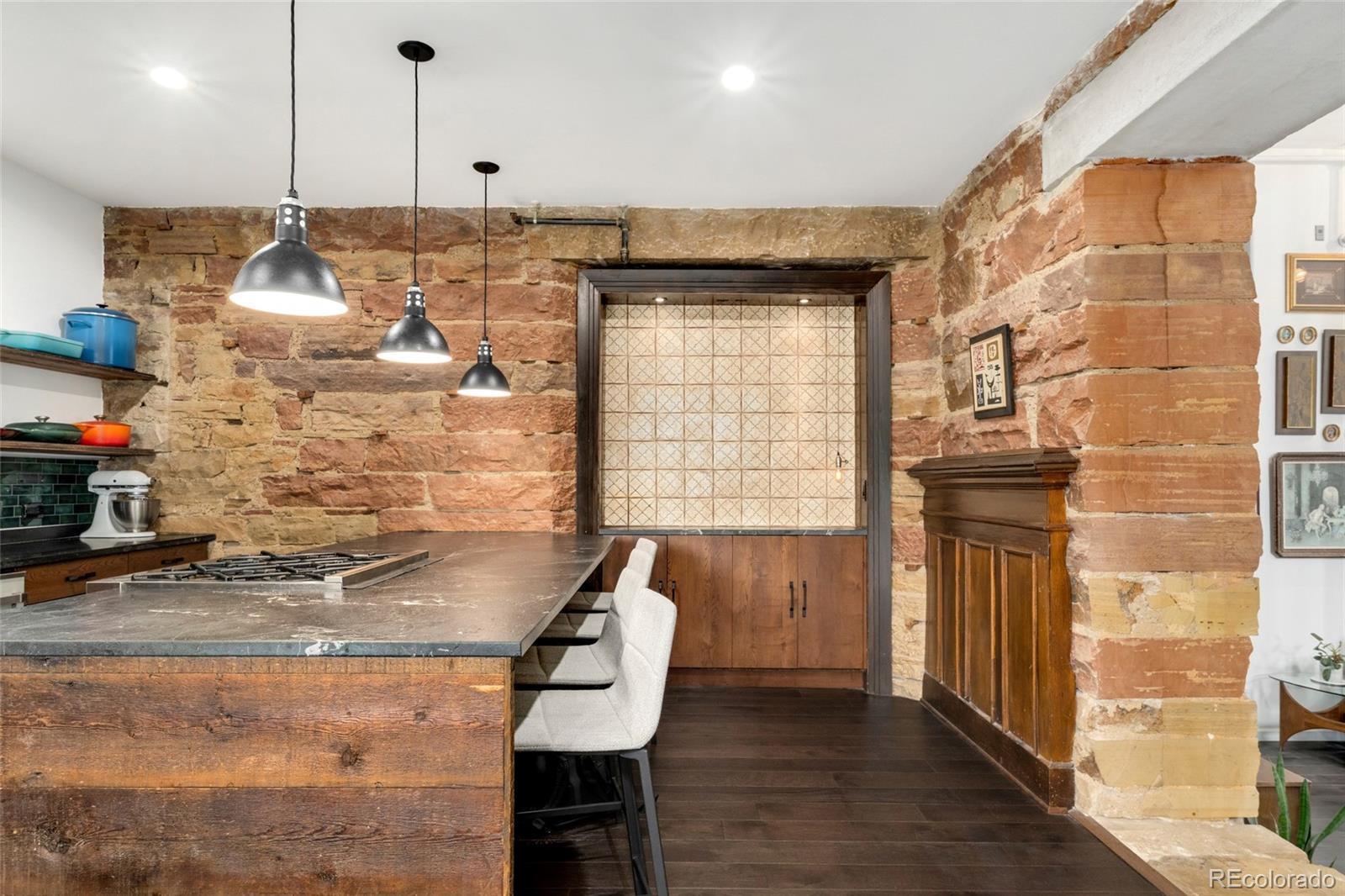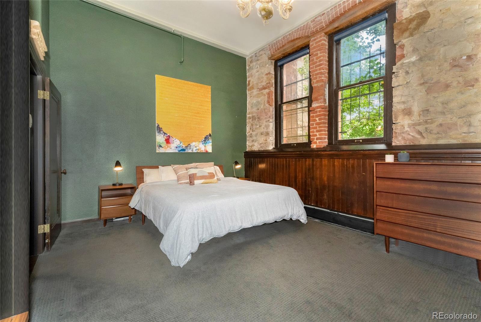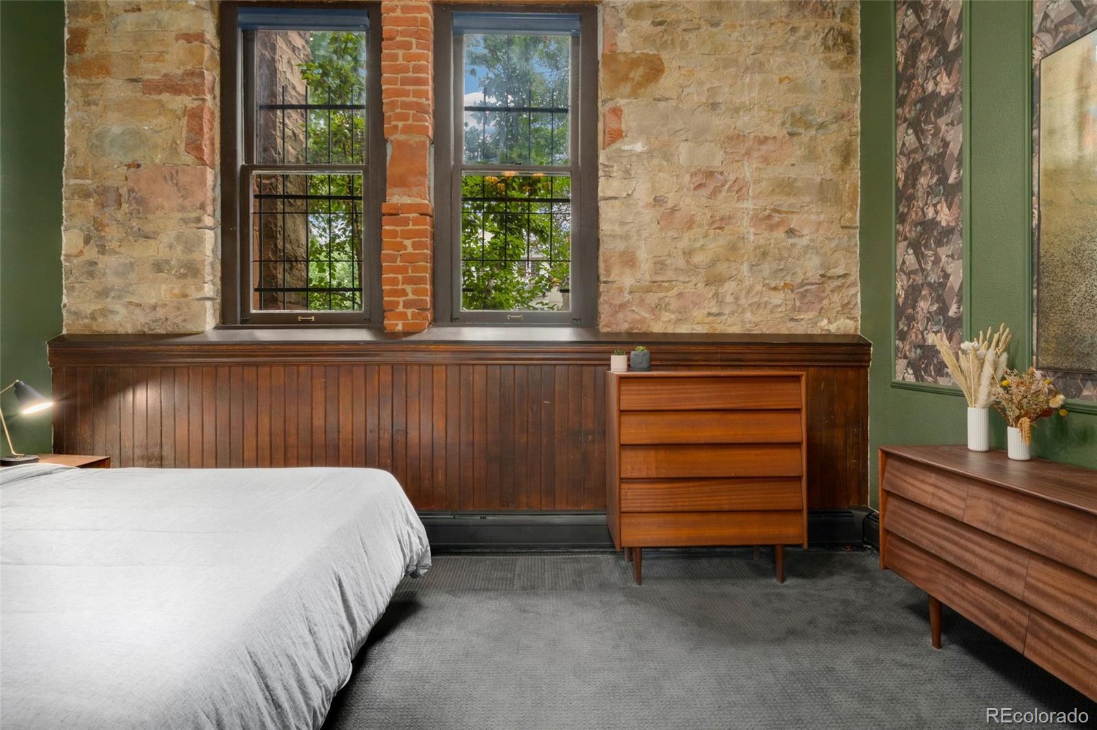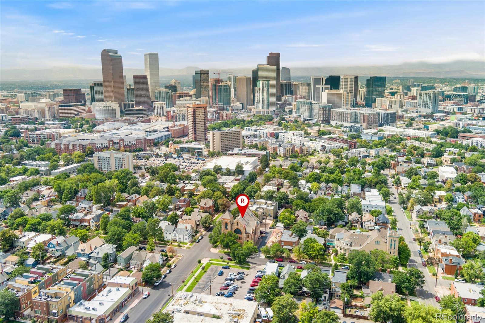 Discover this one-of-a-kind condo on the first floor of a historic church built in 1889, located in Denver’s sought-after San Rafael neighborhood! With its own private entrance, 14-foot ceilings, and 7-foot windows, this remarkable home blends timeless architecture with modern living. Enter through the original double church doors to find the expansive kitchen complete with high-end appliances, a large island with stone countertops and seating, a built-in hutch, and striking stained glass windows that make the space both functional and breathtaking. Continue into the sunken living room to find soaring ceilings adorned with belt-driven fans, natural stone walls, and light-filled spaces that highlight the church’s original beauty. Off of the spacious living room you'll find a tucked-away office/library nook with a built-in bookcase that offers the perfect work-from-home or reading space. Down the hall, the character carries through to the bedroom with high ceilings and stone details, while a walk-in closet and loft area provide ample storage. A stylish 3/4 bath with in-unit laundry adds everyday convenience. Beyond the walls of the home, enjoy the shared rooftop patio complete with lounge areas, fireplace, and gardens—an urban oasis in the heart of the city. One gated, exclusive-use parking space makes coming and going a breeze, and additional storage is available in the basement of the building for your convenience. With its stunning historic architecture, private entrance, incredible natural light, and unbeatable location near Denver’s best dining, parks, and entertainment, this rare condo offers a truly extraordinary living experience!