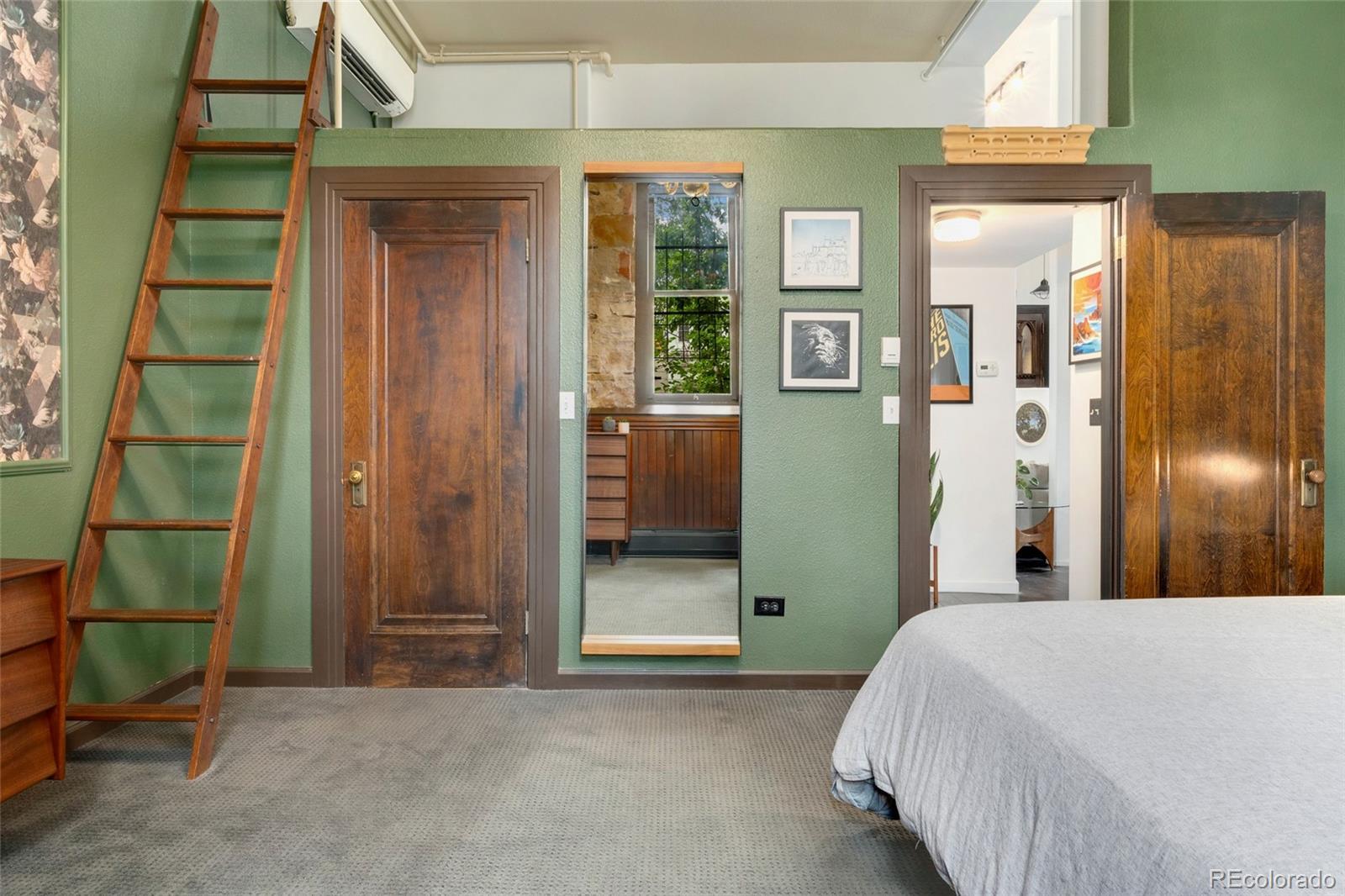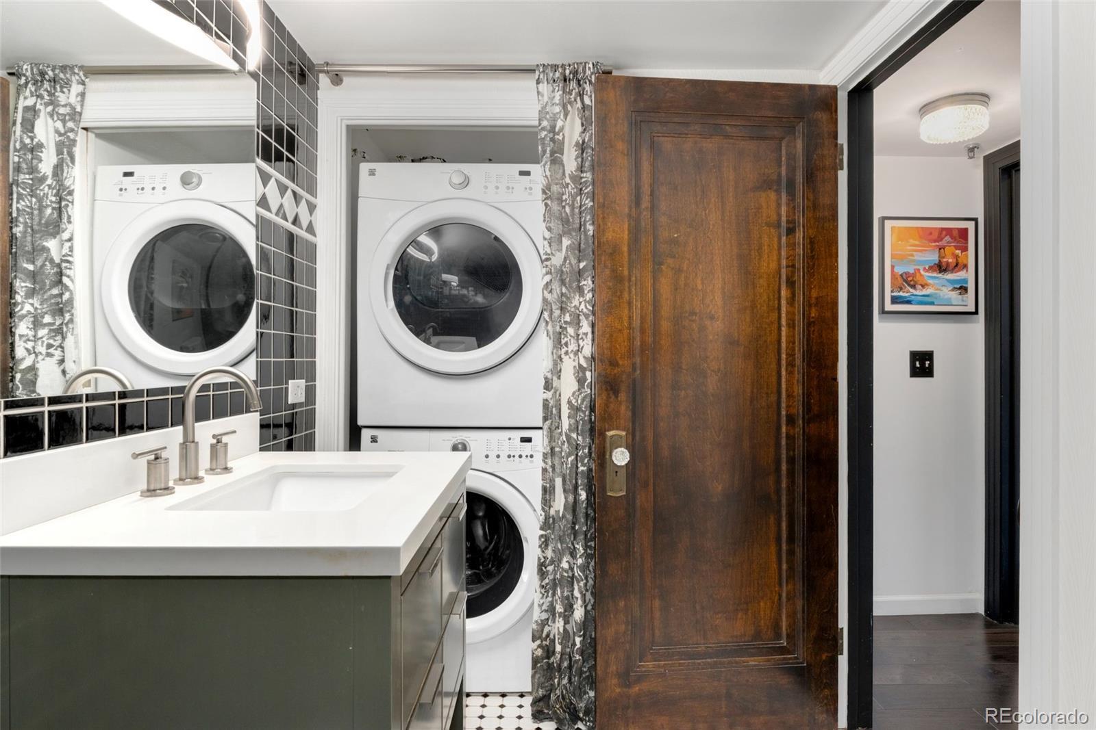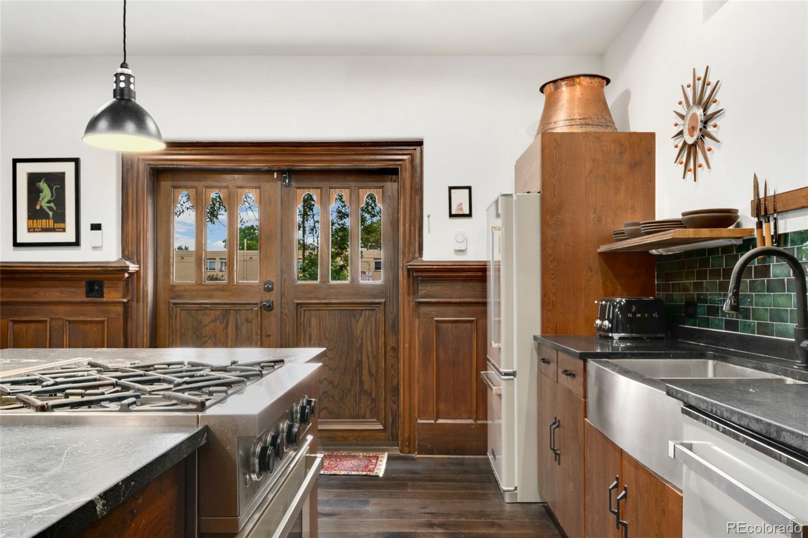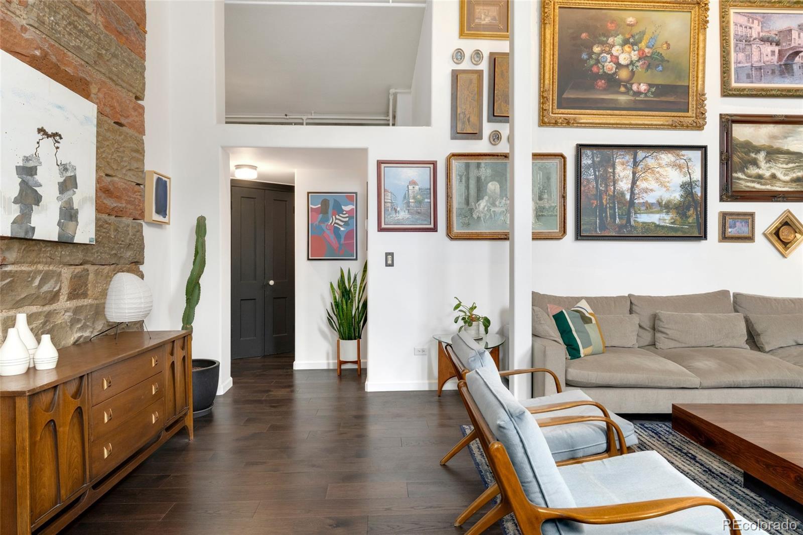 Discover this one-of-a-kind condo on the first floor of a historic church built in 1889, located in Denver’s sought-after San Rafael neighborhood! With its own private entrance, 14-foot ceilings, and 7-foot windows, this remarkable home blends timeless architecture with modern living. Enter through the original double church doors to find the expansive kitchen complete with high-end appliances, a large island with stone countertops and seating, a built-in hutch, and striking stained glass windows that make the space both functional and breathtaking. Continue into the sunken living room to find soaring ceilings adorned with belt-driven fans, natural stone walls, and light-filled spaces that highlight the church’s original beauty. Off of the spacious living room you'll find a tucked-away office/library nook with a built-in bookcase that offers the perfect work-from-home or reading space. Down the hall, the character carries through to the bedroom with high ceilings and stone details, while a walk-in closet and loft area provide ample storage. A stylish 3/4 bath with in-unit laundry adds everyday convenience. Beyond the walls of the home, enjoy the shared rooftop patio complete with lounge areas, fireplace, and gardens—an urban oasis in the heart of the city. One gated, exclusive-use parking space makes coming and going a breeze, and additional storage is available in the basement of the building for your convenience. With its stunning historic architecture, private entrance, incredible natural light, and unbeatable location near Denver’s best dining, parks, and entertainment, this rare condo offers a truly extraordinary living experience!