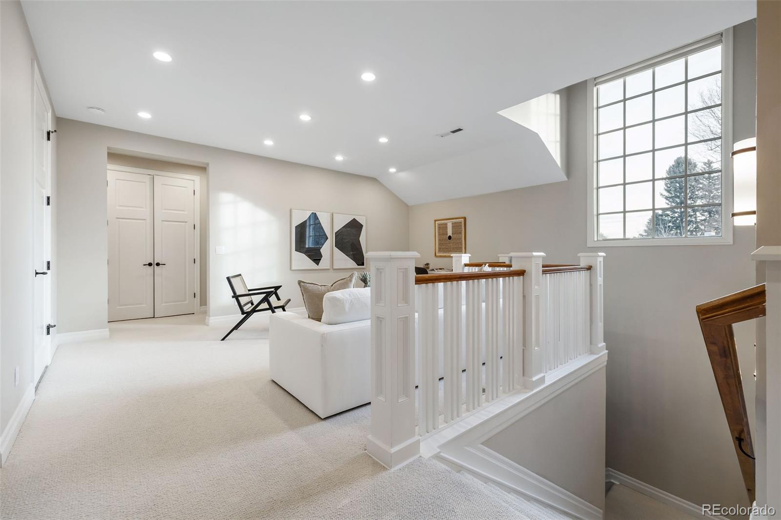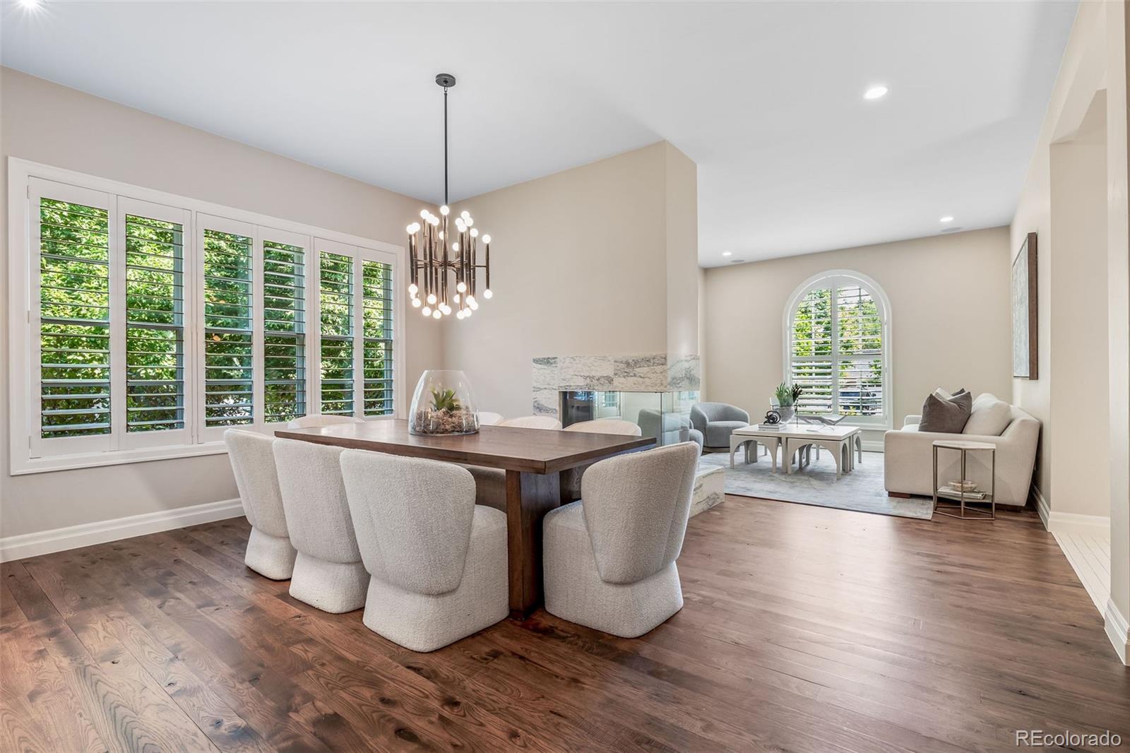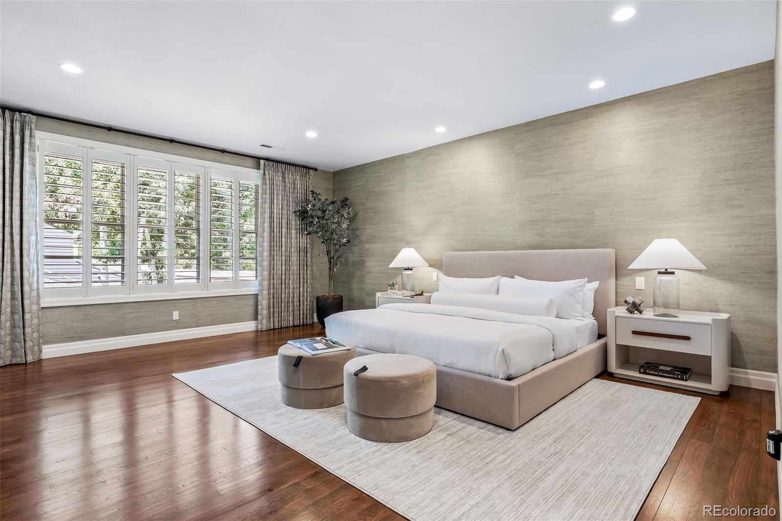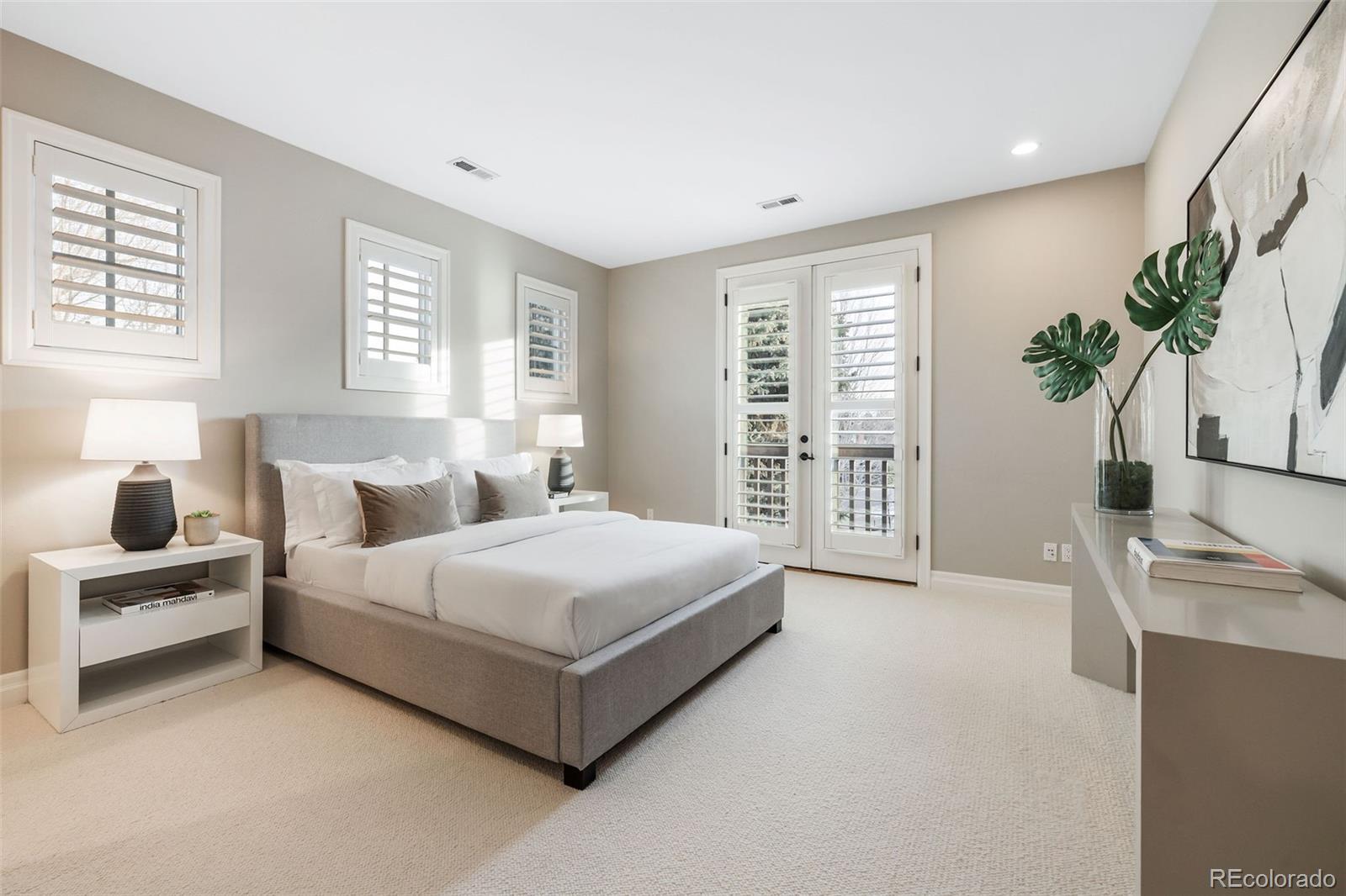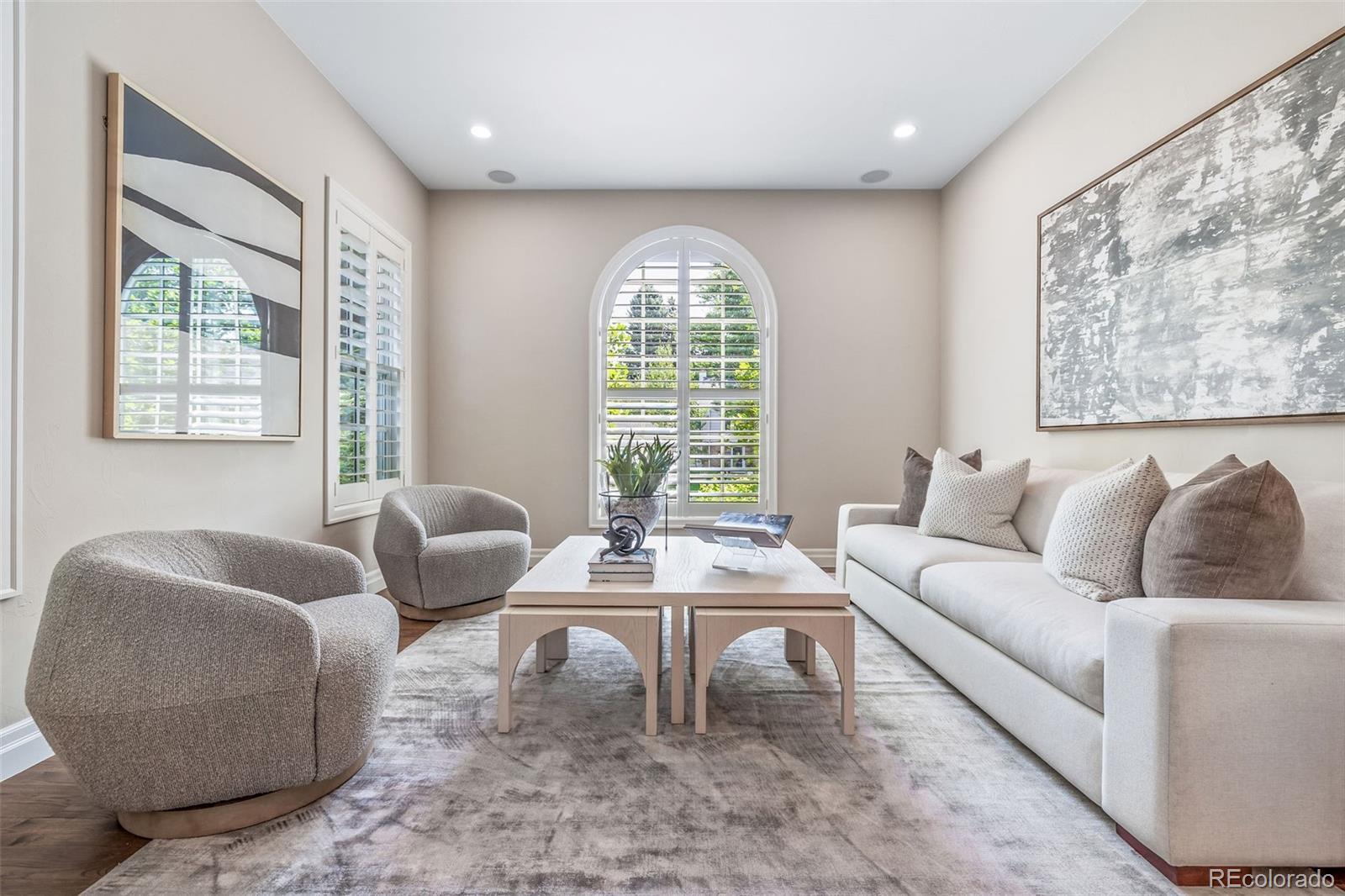 Beautifully proportioned Crestmoor residence set in an exceptionally private setting, thoughtfully updated with a new kitchen and fully renovated baths (2018–2019). Classic architecture is seamlessly paired with refined, designer-selected finishes throughout. Sun-filled interiors feature hardwood floors, soaring ceilings, elegant paint treatments, statement lighting, and plantation shutters. A gracious foyer opens to formal living and dining rooms, anchored by a marble gas fireplace. The custom Thurston kitchen is a true centerpiece, showcasing dual islands, quartzite countertops, Wolf appliances, a walk-in pantry, and butler’s pantry, flowing effortlessly into the breakfast area and family room with fireplace, built-ins, and glass doors leading to the covered patio with barbecue and firepit. The main level also includes a private study with patio access, guest suite with new ¾ bath, chic powder room, and mudroom. Upstairs, four spacious en-suite bedrooms await, highlighted by the stunning primary retreat featuring grass-cloth wallpaper, a dramatic see-through fireplace to the spa-like bath, and French doors opening to a Dasso bamboo-decked patio. The luxurious five-piece primary bath offers herringbone tile floors, steam shower, heated towel racks, and dual sink areas with private patio access. Additional bedrooms include an en-suite guest room and two bedrooms with updated vanities and shared bath. Sunny loft and convenient laundry complete the upper level. The expansive lower level is designed for entertaining, with a recreation room, game room, fitness area, new ¾ bath, and abundant storage. Enhanced with newer HVAC systems, tankless water heaters, Control4 automation, solar panels, four Tesla Powerwall batteries, and a three-car garage. Situated on a generous 12,231-square-foot lot, this exceptional home offers remarkable indoor-outdoor living and captures Denver living at its finest.