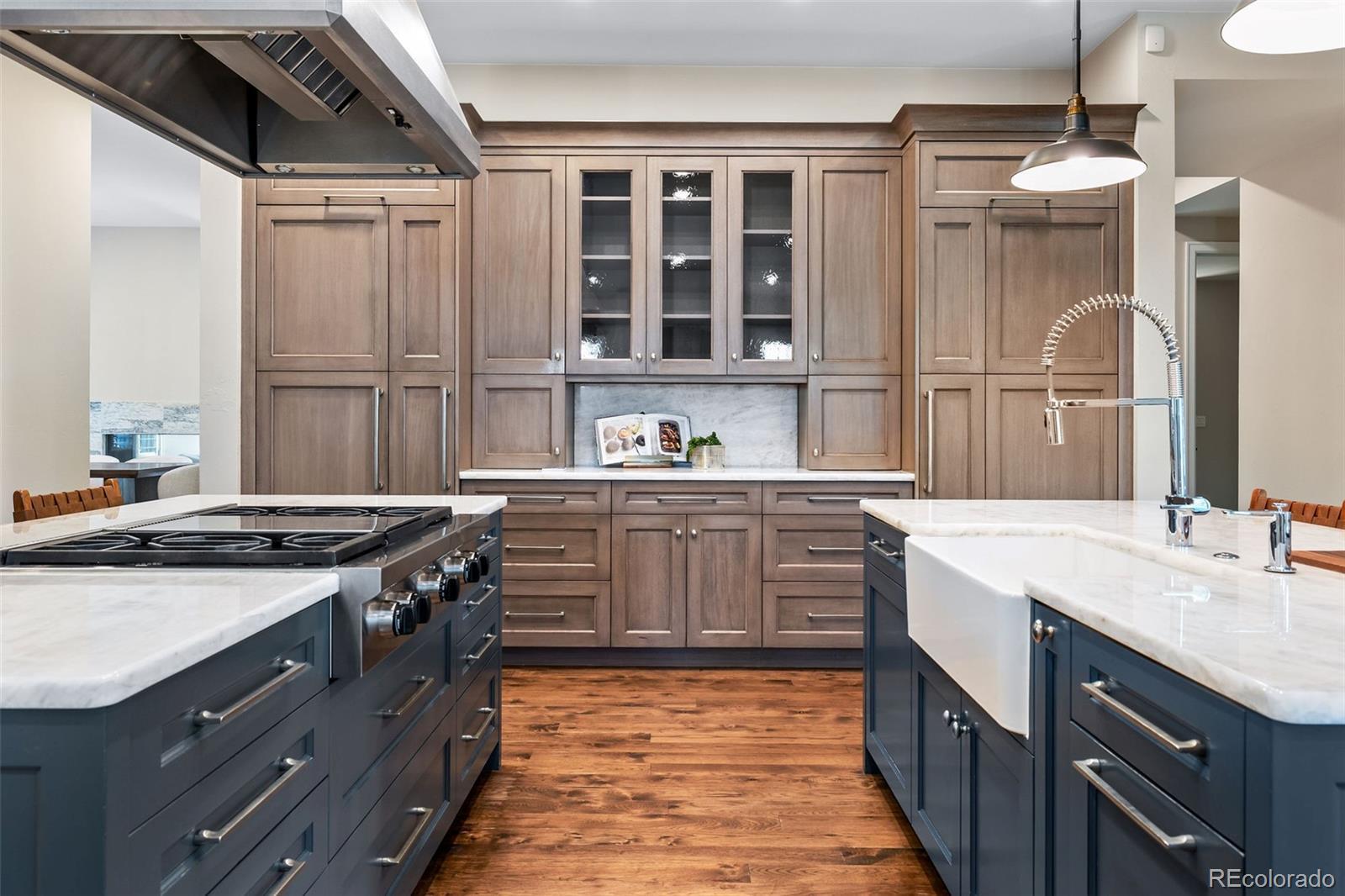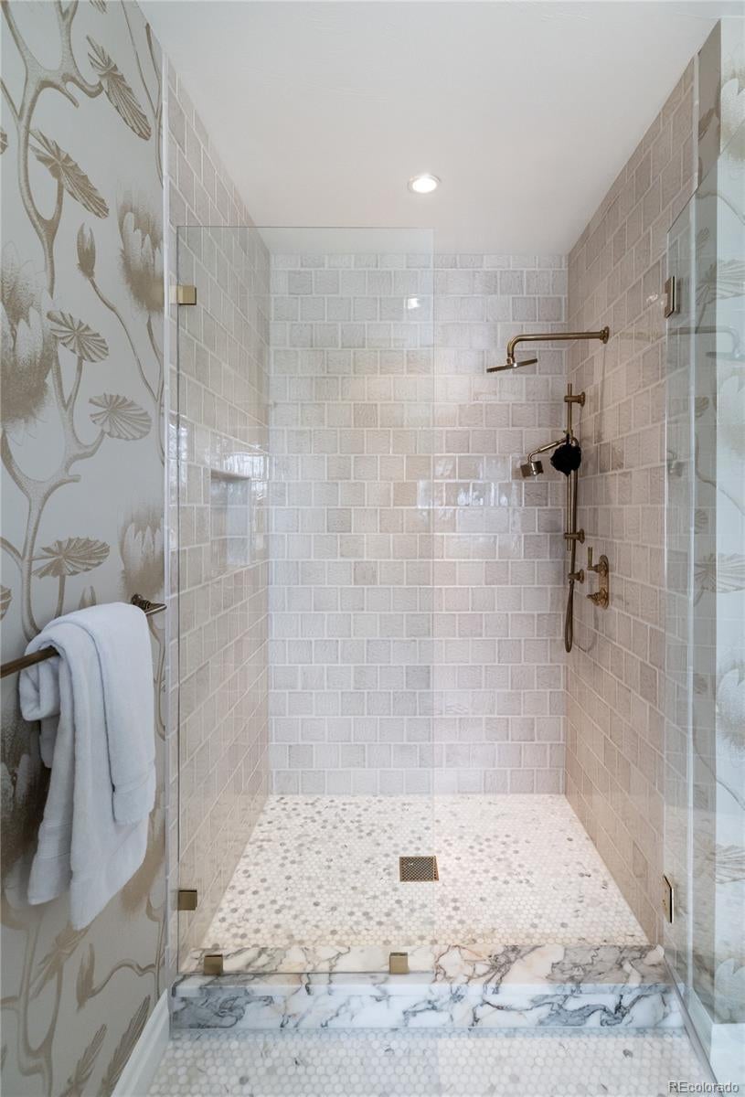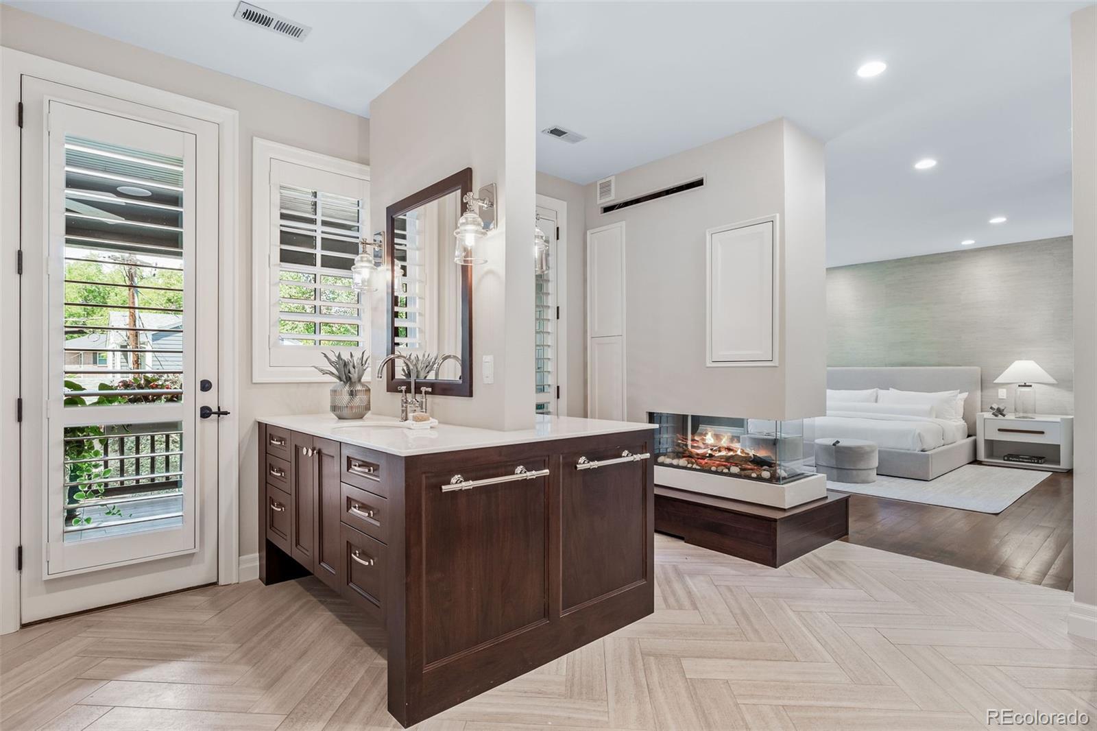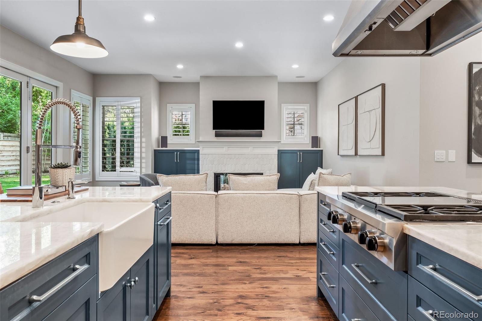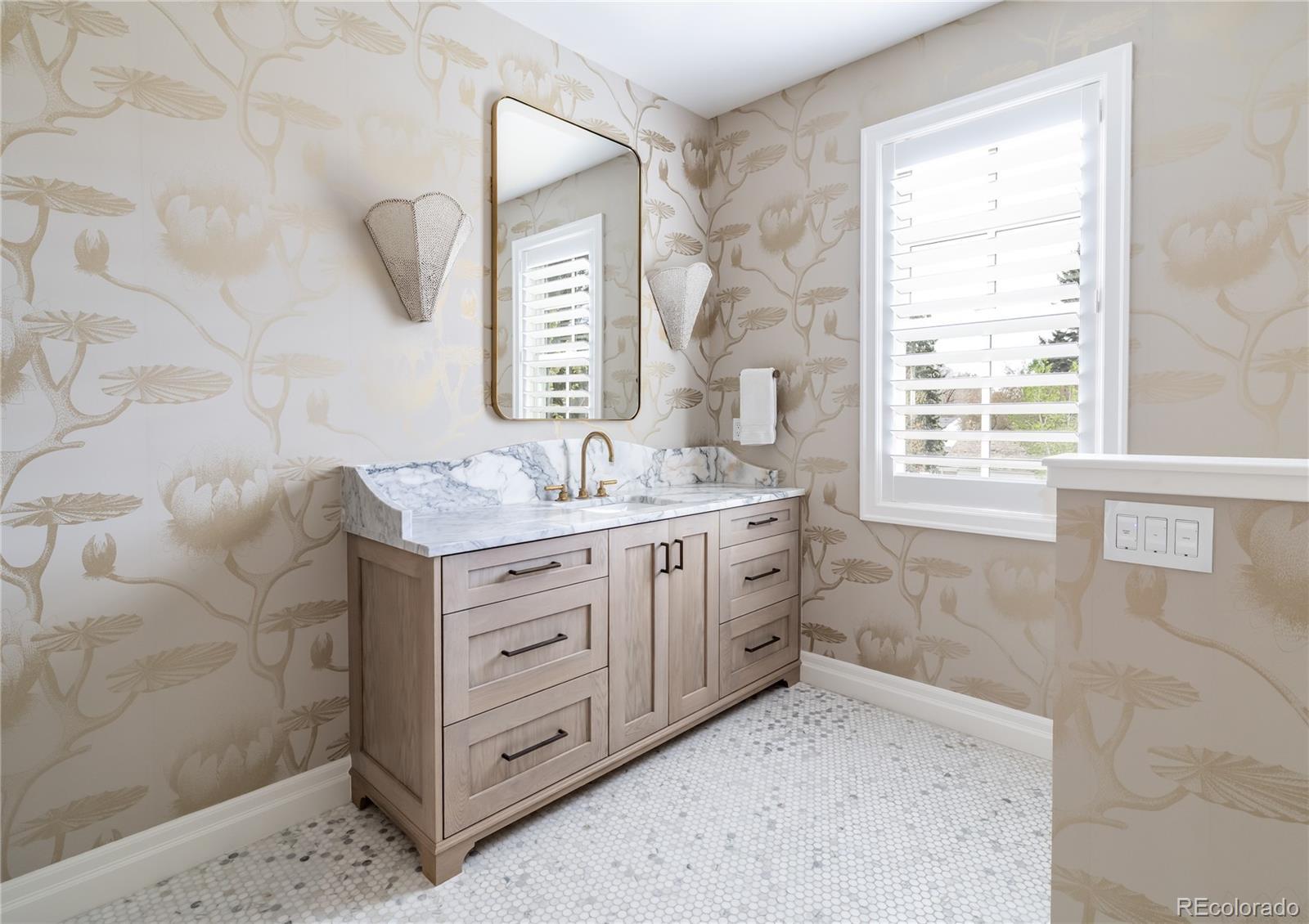 Beautifully proportioned Crestmoor residence set in an exceptionally private setting, thoughtfully updated with a new kitchen and fully renovated baths (2018–2019). Classic architecture is seamlessly paired with refined, designer-selected finishes throughout. Sun-filled interiors feature hardwood floors, soaring ceilings, elegant paint treatments, statement lighting, and plantation shutters. A gracious foyer opens to formal living and dining rooms, anchored by a marble gas fireplace. The custom Thurston kitchen is a true centerpiece, showcasing dual islands, quartzite countertops, Wolf appliances, a walk-in pantry, and butler’s pantry, flowing effortlessly into the breakfast area and family room with fireplace, built-ins, and glass doors leading to the covered patio with barbecue and firepit. The main level also includes a private study with patio access, guest suite with new ¾ bath, chic powder room, and mudroom. Upstairs, four spacious en-suite bedrooms await, highlighted by the stunning primary retreat featuring grass-cloth wallpaper, a dramatic see-through fireplace to the spa-like bath, and French doors opening to a Dasso bamboo-decked patio. The luxurious five-piece primary bath offers herringbone tile floors, steam shower, heated towel racks, and dual sink areas with private patio access. Additional bedrooms include an en-suite guest room and two bedrooms with updated vanities and shared bath. Sunny loft and convenient laundry complete the upper level. The expansive lower level is designed for entertaining, with a recreation room, game room, fitness area, new ¾ bath, and abundant storage. Enhanced with newer HVAC systems, tankless water heaters, Control4 automation, solar panels, four Tesla Powerwall batteries, and a three-car garage. Situated on a generous 12,231-square-foot lot, this exceptional home offers remarkable indoor-outdoor living and captures Denver living at its finest.