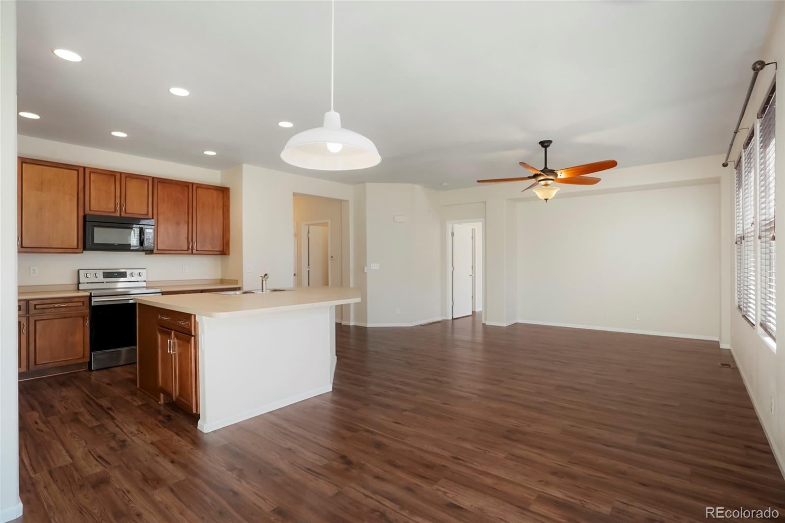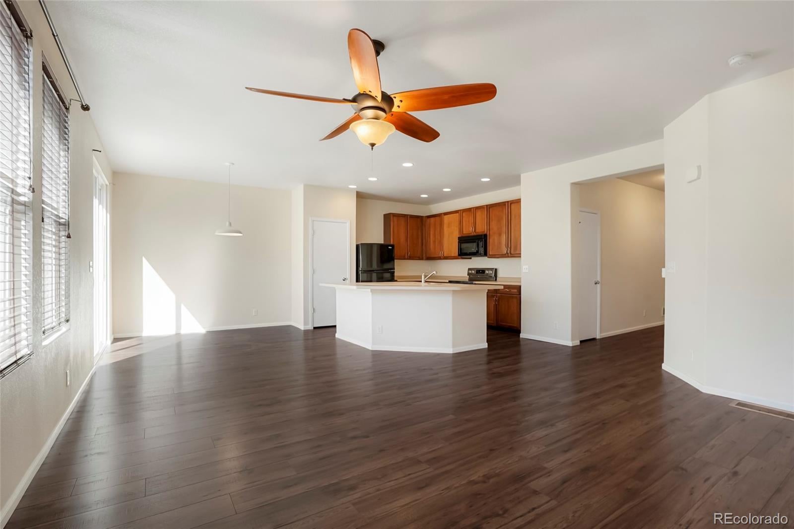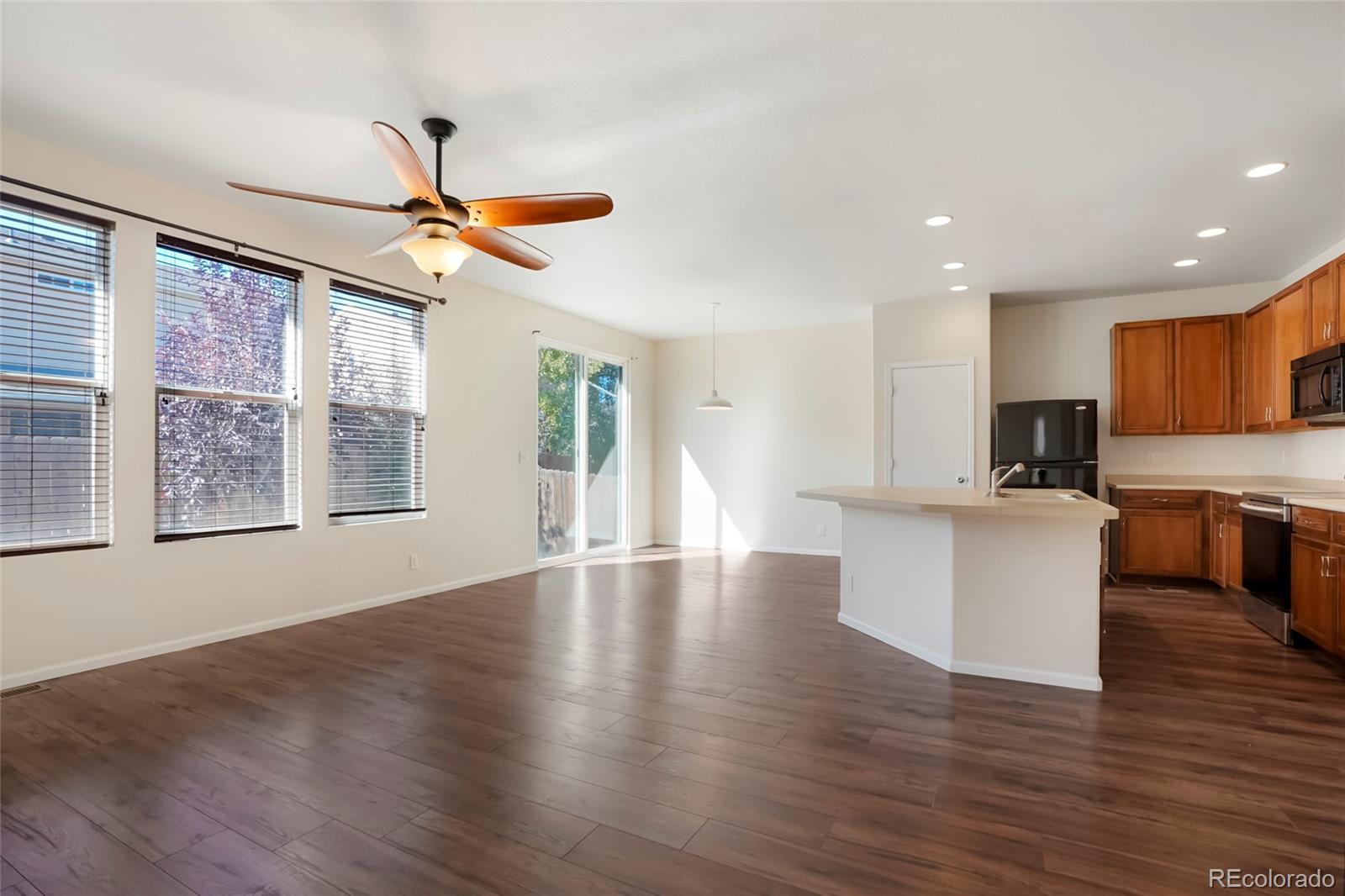 Beautiful Ranch-Style Home in the Parkfield Community! Step into this bright and spacious ranch-style home featuring an open floor plan with soaring 9’ ceilings. The main level offers 3 comfortable bedrooms, master bathroom and 3/4 bath, perfect for modern living. The chef’s kitchen showcases a large center island, ample cabinet space, and a generous pantry — seamlessly flowing into the great room and dining area for easy entertaining. Enjoy outdoor living on the new rear concrete patio, ideal for relaxing or hosting gatherings. The low-maintenance backyard and 2-car attached garage add even more convenience. The huge unfinished basement provides endless possibilities — use it for extra storage or finish it to create your dream space. Recent upgrades include brand new laminate wood flooring (installed 10/2025), a new roof with transferable warranty (10/2025), and fresh interior paint throughout. Ideally located near major highways and DIA, this home combines comfort, style, and convenience — ready for you to move right in!