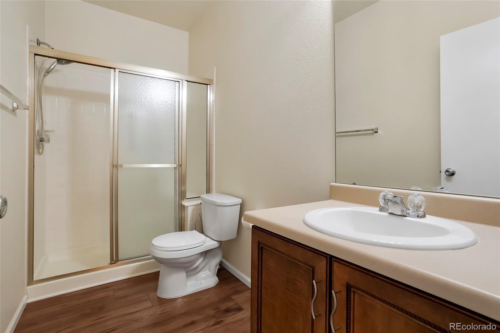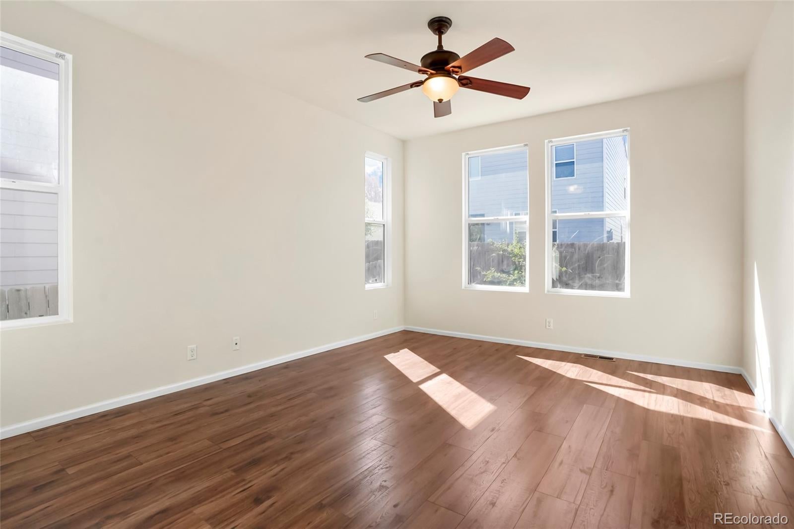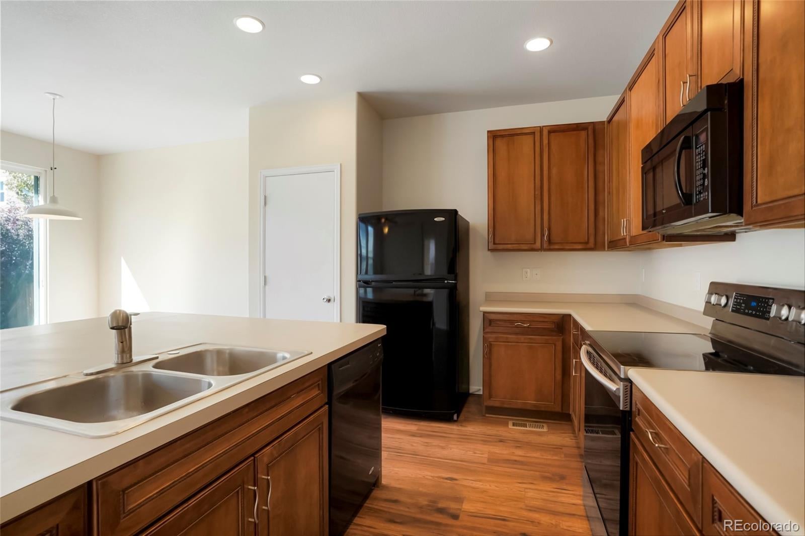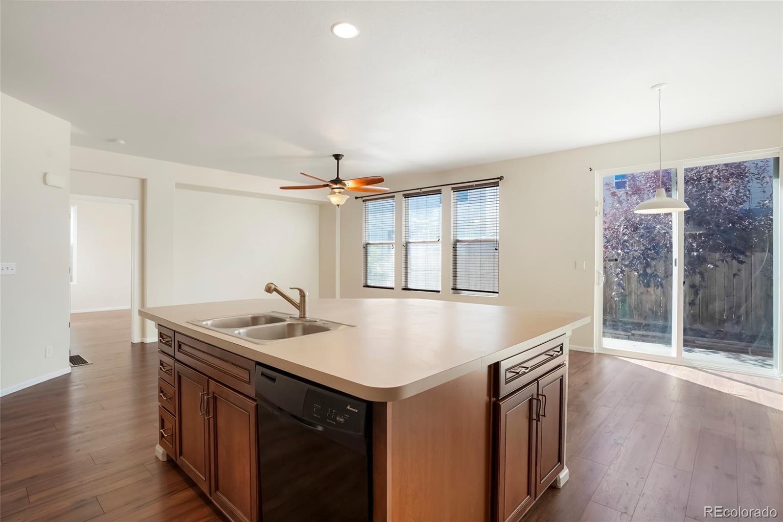 Beautiful Ranch-Style Home in the Parkfield Community! Step into this bright and spacious ranch-style home featuring an open floor plan with soaring 9’ ceilings. The main level offers 3 comfortable bedrooms, master bathroom and 3/4 bath, perfect for modern living. The chef’s kitchen showcases a large center island, ample cabinet space, and a generous pantry — seamlessly flowing into the great room and dining area for easy entertaining. Enjoy outdoor living on the new rear concrete patio, ideal for relaxing or hosting gatherings. The low-maintenance backyard and 2-car attached garage add even more convenience. The huge unfinished basement provides endless possibilities — use it for extra storage or finish it to create your dream space. Recent upgrades include brand new laminate wood flooring (installed 10/2025), a new roof with transferable warranty (10/2025), and fresh interior paint throughout. Ideally located near major highways and DIA, this home combines comfort, style, and convenience — ready for you to move right in!