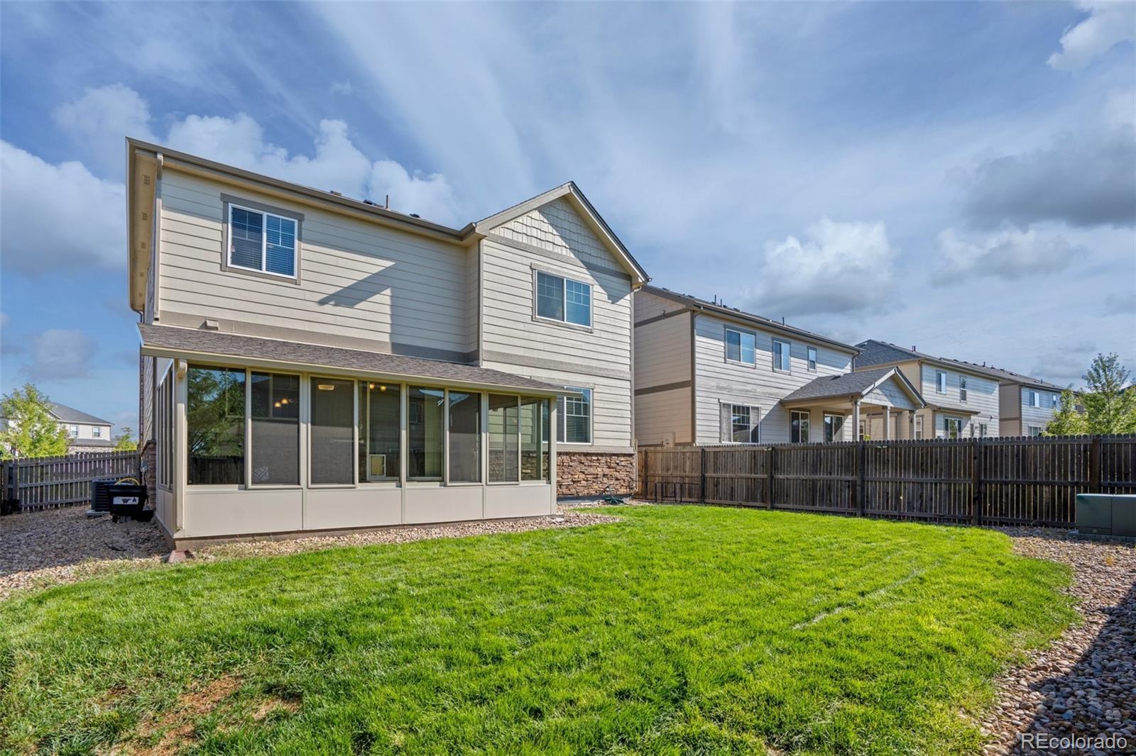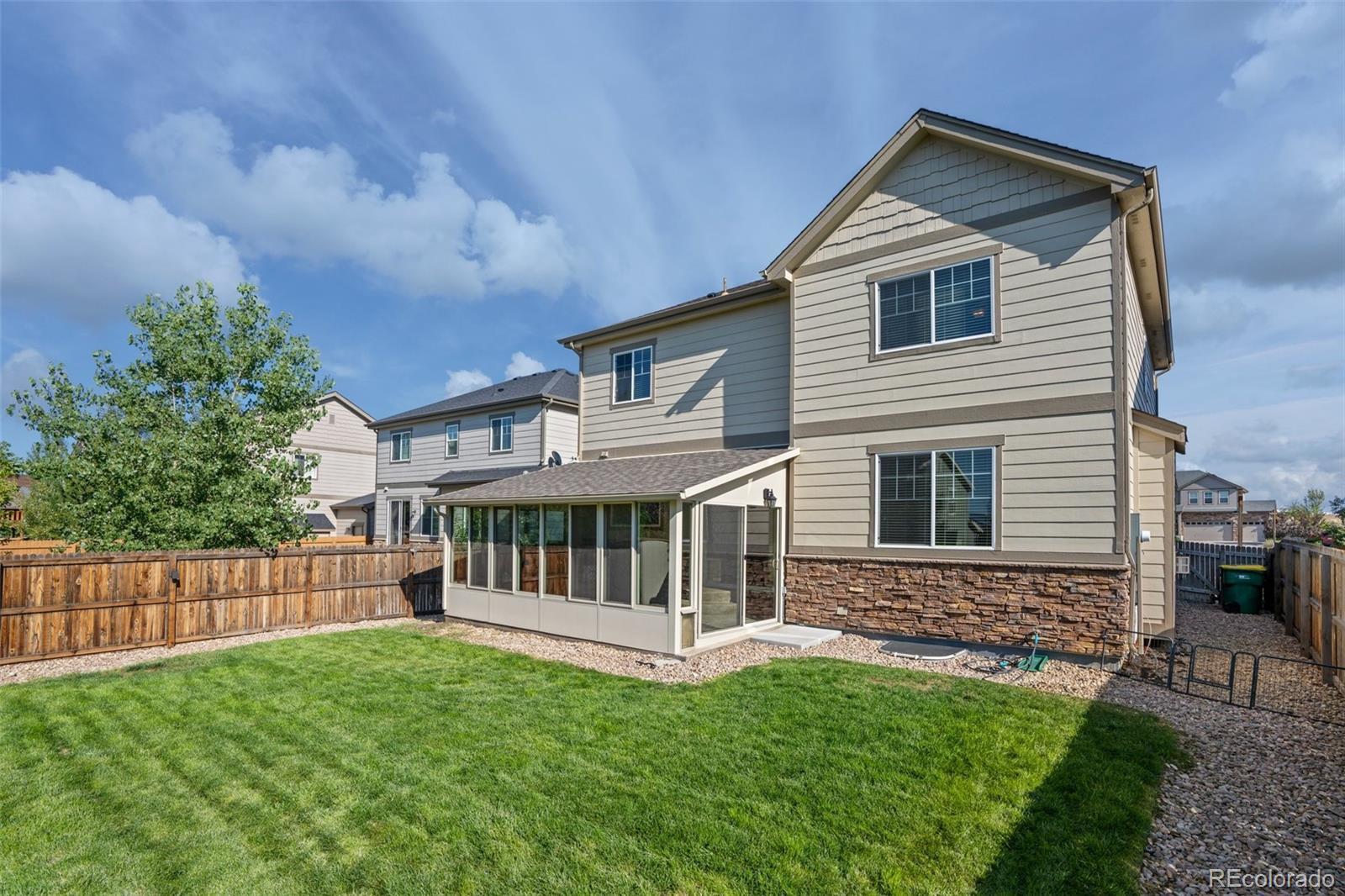 Fabulous home in Wheatlands - just a short walk to the pool, clubhouse, and Pine Ridge Elementary School! Brand new roof, gorgeous hardwood floors throughout the main floor, and a large three-season sunroom overlooking the spacious backyard are just a few highlights of this well-designed floor plan. This has all the right upgrades including granite countertops in the kitchen and all bathrooms, a fireplace, surround sound, two flex areas, a deluxe master bathroom, a convenient upstairs laundry room, intercom system, central vacuum system, and newly upgraded carpet and paint. The finished basement includes a living space with surround sound, bedroom, and full bathroom. This amazing home is just across the street from great shopping, dining, parks, and recreation. The community offers a pool, clubhouse, monthly events, and a free Y-Premium Household Membership to the newly built YMCA that boasts a gym, fitness classes, indoor pool and more! Don't miss out on this beautiful home!