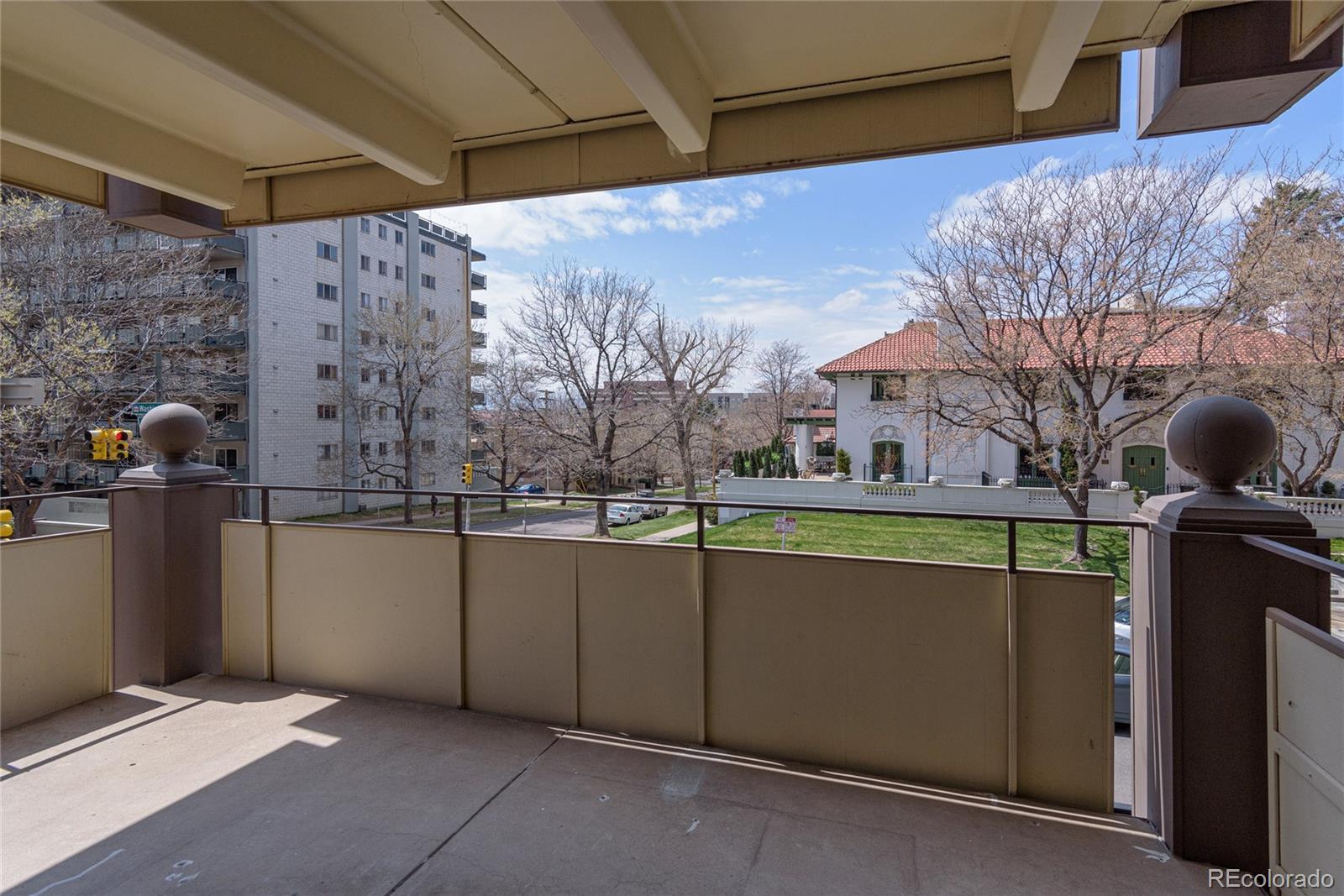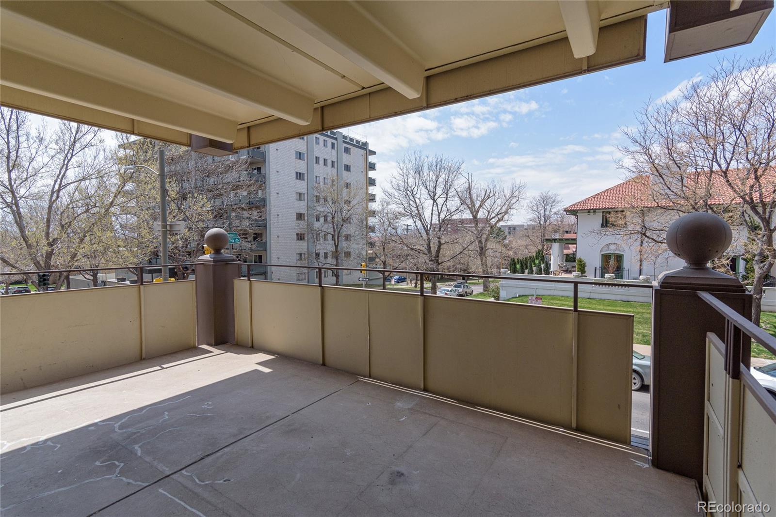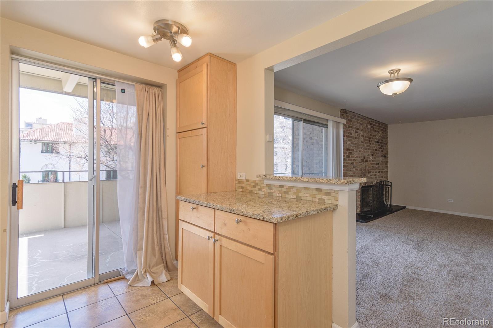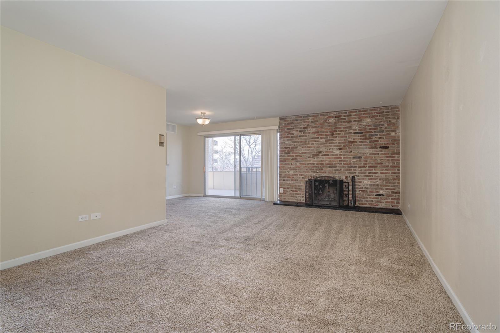 Discover this bright and spacious southwest-facing end unit, conveniently located on the second floor in the heart of Governor’s Park. Access your home easily via the lobby stairs or a secured back entrance, with two elevators also available on each floor. Inside, natural light floods the open floor plan, beginning with an inviting foyer and a large coat/storage closet. The generous living room features a classic brick fireplace with an electric insert, while the dining area offers built-in cabinetry and a wet bar—perfect for entertaining. Two sets of sliding glass doors open to a large balcony overlooking a tree-lined street, ideal for relaxing, entertaining, or enjoying a sunset. The kitchen boasts upgraded cabinetry, under-cabinet lighting, ample counter space, and a second balcony entrance for seamless indoor-outdoor flow. The primary suite includes two large closets leading to a full bath. A second bedroom with a walk-in closet is conveniently located across from the second bath. Recent updates throughout the unit include new carpet, updated tile, fresh paint, and new blinds. Parking is effortless with one deeded garage space (#21) in the secured parking area. Enjoy first-floor amenities such as an indoor pool, hot tub, sauna, steam room, private patio, fitness center, and community room, all directly below the unit. On-site management is available Monday through Friday. This prime location is just steps from shops, groceries, restaurants, parks, trails, and Trader Joe’s, with easy access to downtown and RTD. The hallway carpet on the second floor was also recently replaced.