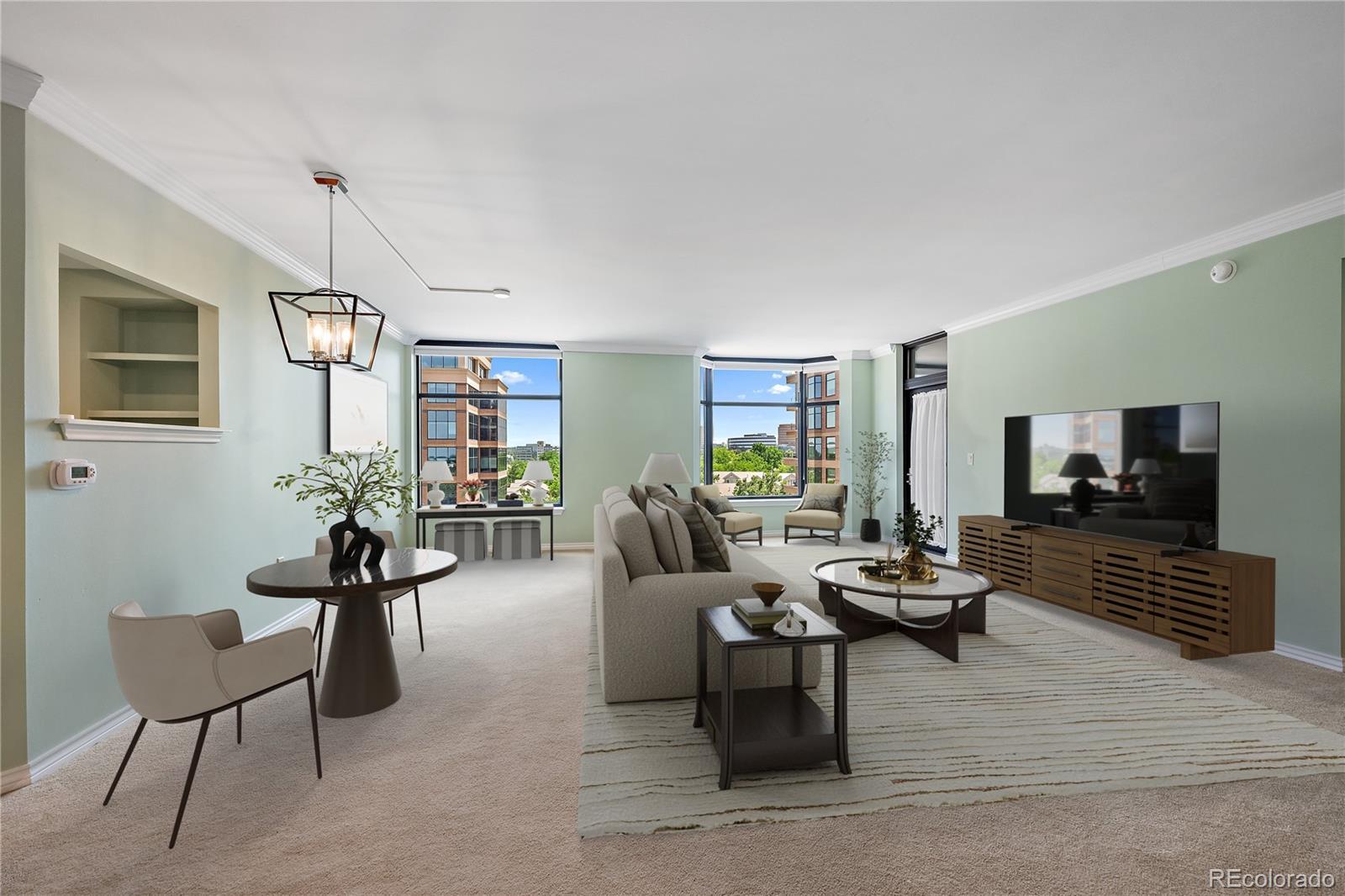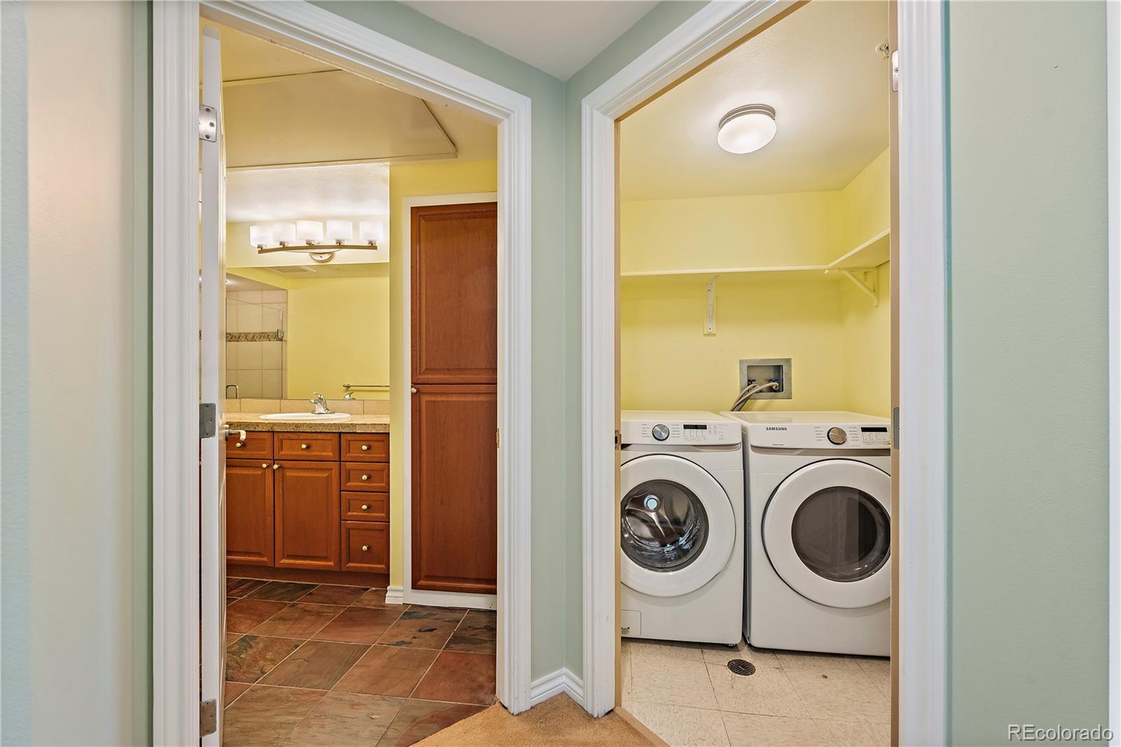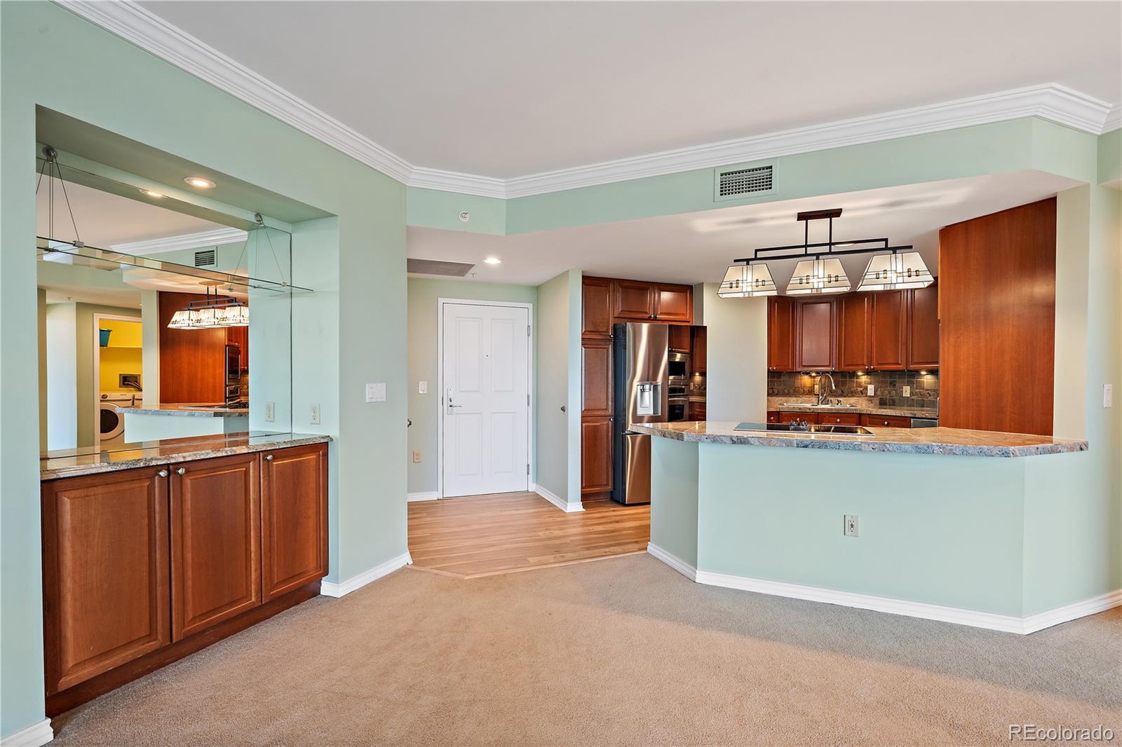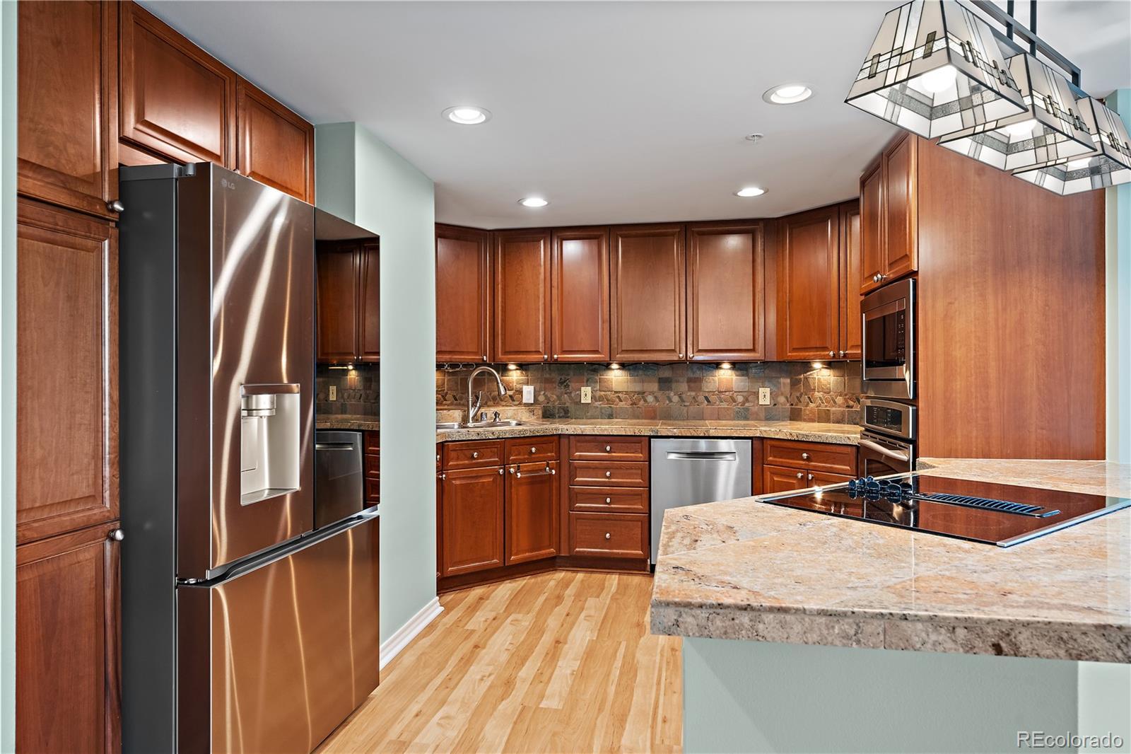 Motivated seller open to offers! New LG top of the line refrigerator with wifi. New luxury vinyl plank kitchen floor. New overhead lighting fixtures. New Samsung washer and dryer (2021). Retractable screen door between living room and balcony. Hunter Douglas automatic remote control window shades (double - opaque and fabric). Hunter Douglas slider in master bedroom. Balcony access from both living room and master bedroom. Sunny quiet side of building with minimal noise and wind. Indoor Parking Space. Storage Area. Washer & Dryer Included. Top-Notch 24/7 Amenities In This Lock & Leave Building (in house library, community room, business center, gym, outdoor terrace with grills for entertaining. New upscale restaurant coming soon to building! Very Close To Restaurants, Retail & Public Transportation. Easy Highway Access To I-25/I-225.