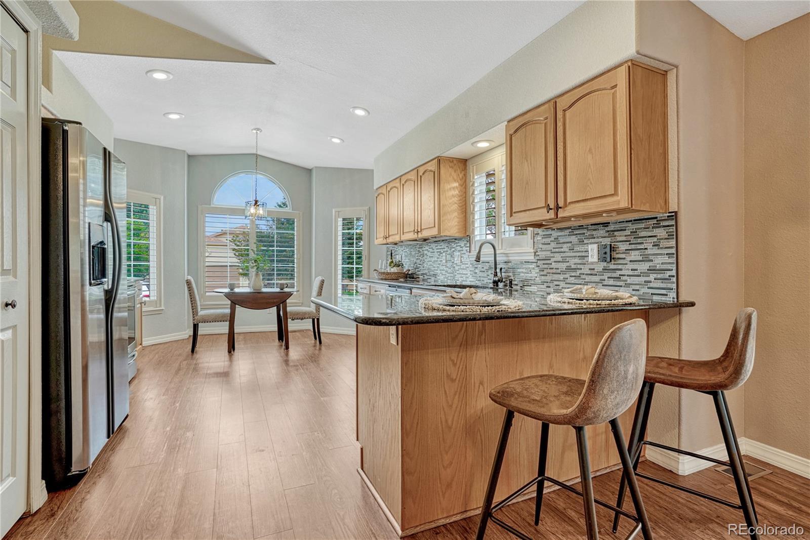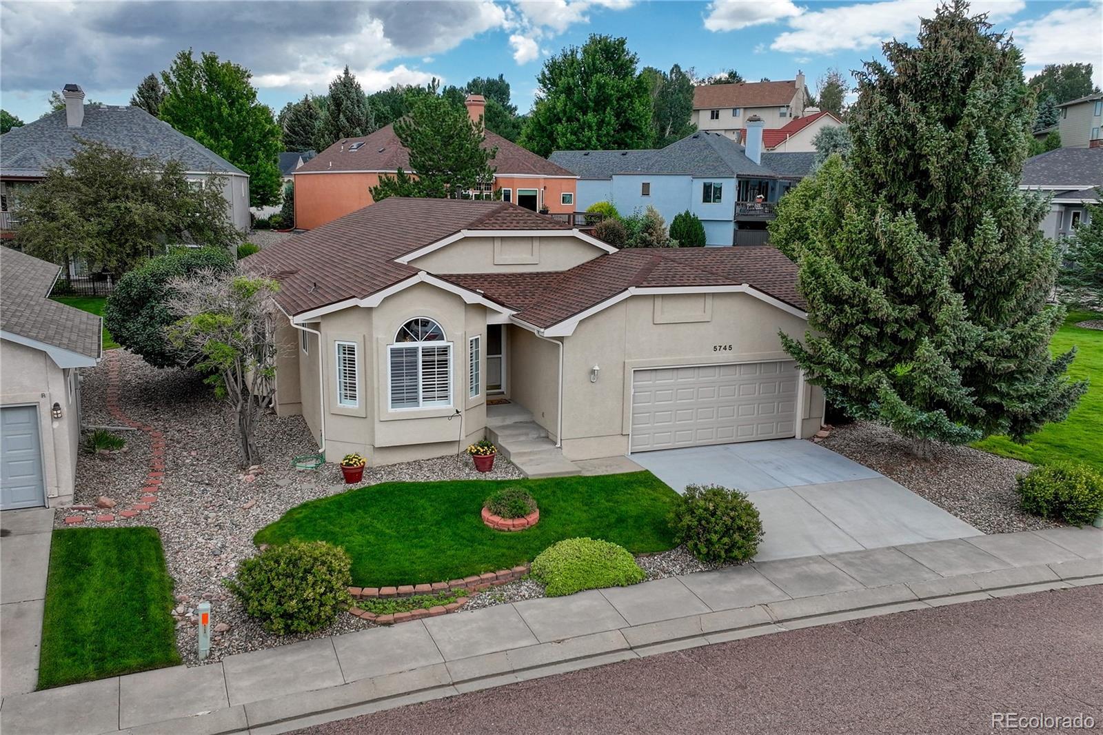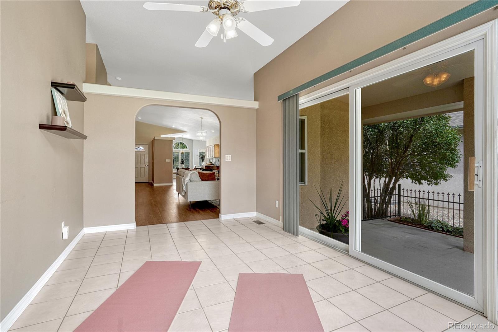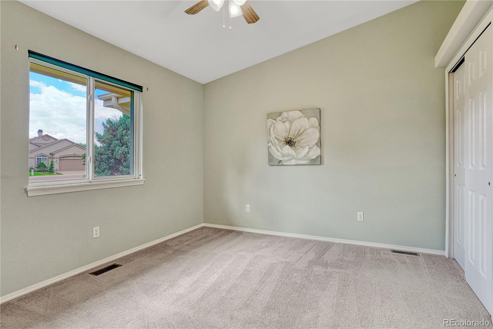 Enjoy low-maintenance main-level living in this inviting 2 bedroom, 2 bath home with oversized 2-car garage, central A/C and 1,713 sq. ft. all thoughtfully designed for comfort and convenience. Step into an open floor plan with luxury vinyl flooring and vaulted ceilings. The great room also features a gas fireplace and, in the adjacent dining area, a bay window. The large eat-in kitchen offers a Pikes Peak peek, plantation shutters, slab granite countertops, graphite sink, pantry and a counter bar. Refrigerator included! Seamlessly make your way to a fantastic flex space which would serve well as a workout space, home office, music or sitting room. Walk-out from this space to a large, covered, private patio…hot tub ready! The spacious primary bedroom features a vaulted ceiling, plantation shutters and ceiling fan. The adjoining ¾ bath has a tile floor, vaulted ceiling, double vanity, walk-in closet and abundant natural light from the skylight. The second bedroom also includes a vaulted ceiling and ceiling fan. The laundry space offers storage and includes the washer and dryer—move-in ready! A full bath will skylight and tile floor round out the space. The oversized garage offers a workbench, window and storage. Outside, enjoy a peaceful setting that opens to a large grassy adjacent lot. HOA fees cover mowing, exterior water, trash, snow removal, pruning/fertilizing and access to the Norwood Recreation Center pool, tennis and pickle ball courts. This home’s location provides access to I-25 in 10 min. and to the Powers Corridor in 7 min. making entertainment, dining, schools and shopping easy and convenient.