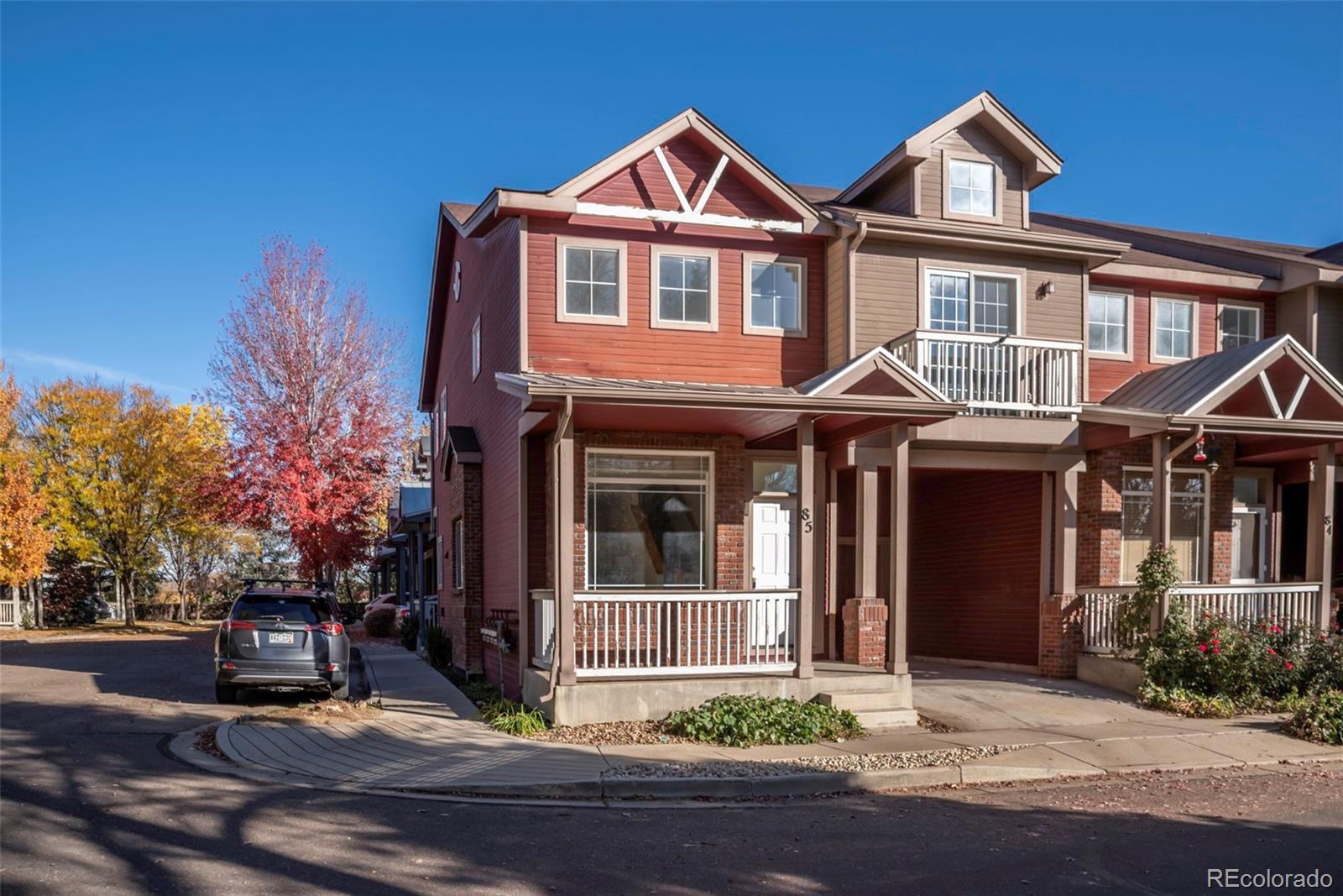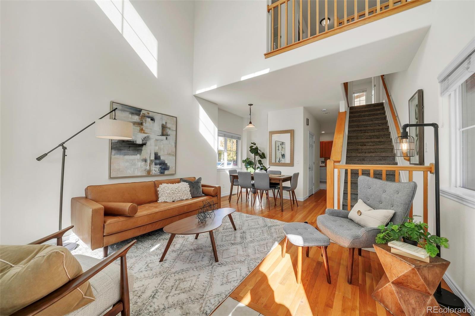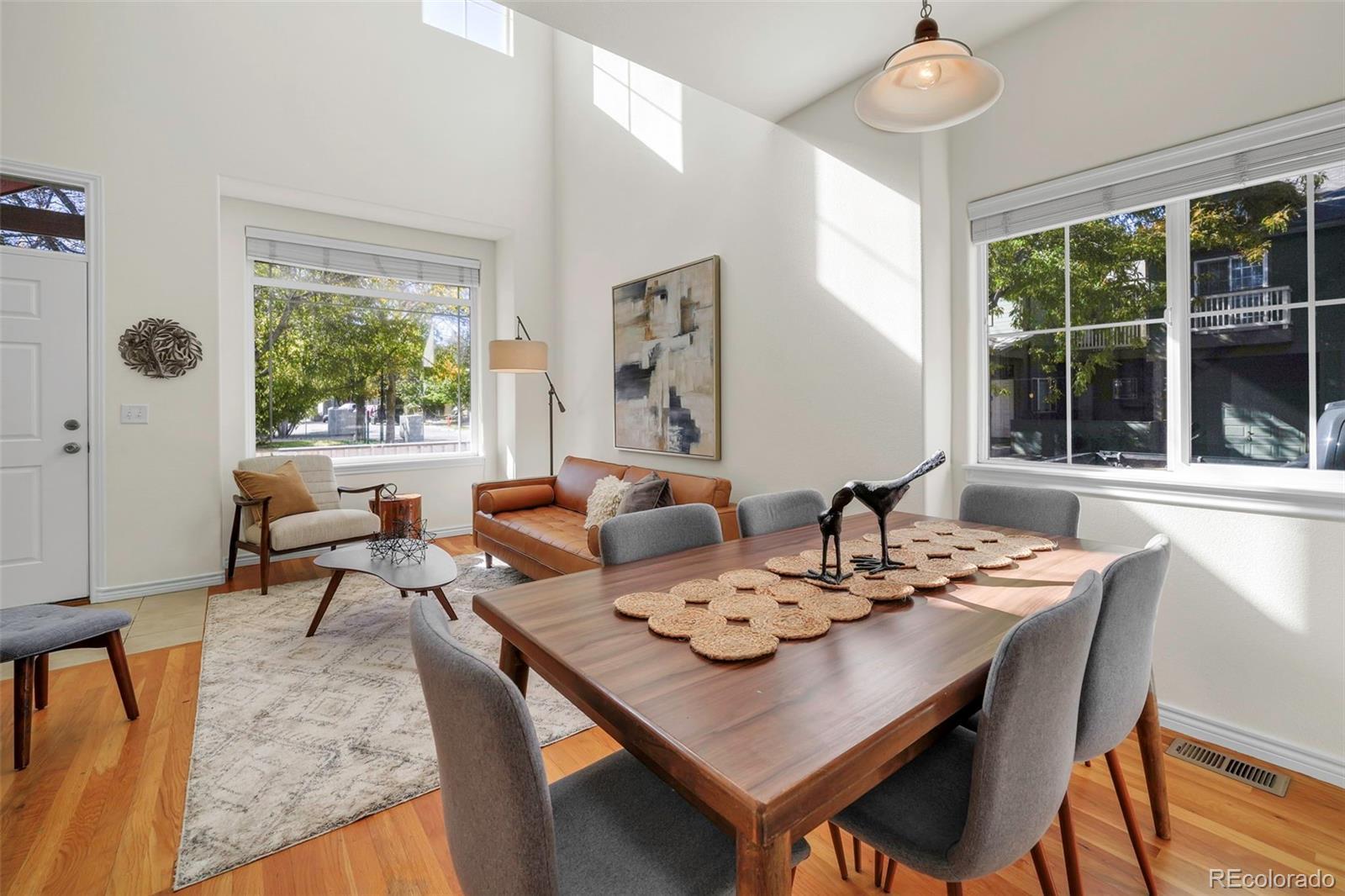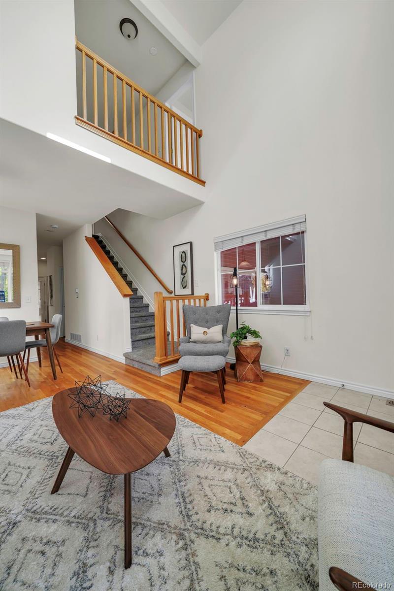 Charming three-bedroom townhome in a sweet location! South facing end unit flooded with natural light. Home is situated on a very quiet interior street, with only 1 shared wall! Enjoy looking out over the HOA green space from your covered front porch. New carpet, fresh paint, wood floors on the main level and dramatic vaulted ceilings. Primary bedroom with private bath, walk-in closet, and large south facing windows. Sunny laundry room on the upper level. One-car attached garage. NOT in a metro tax district!
