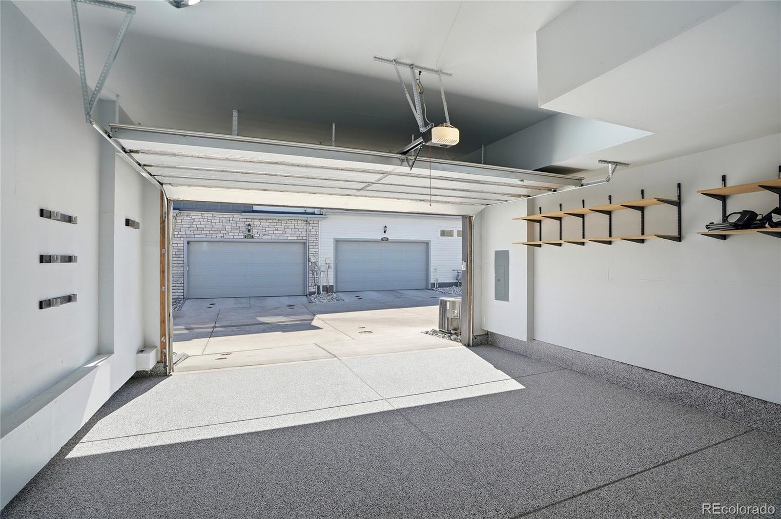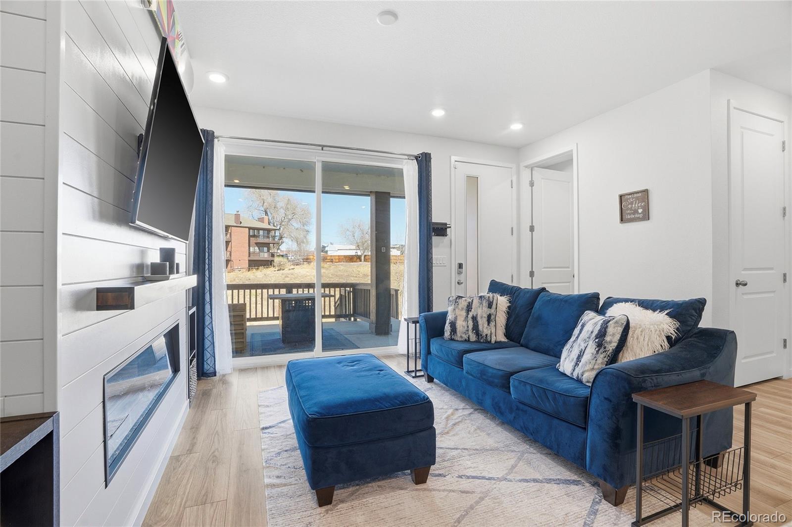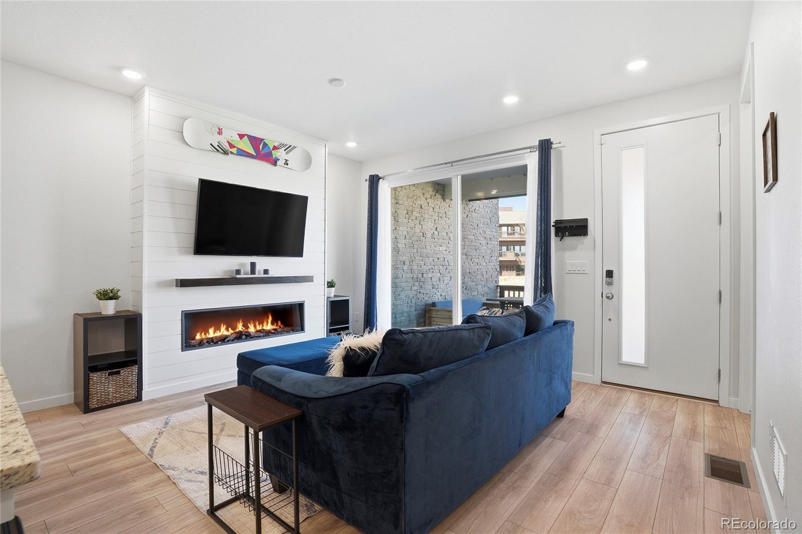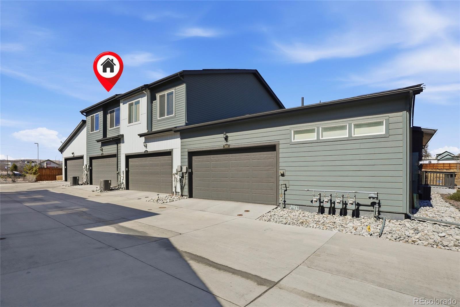 This lovely home is tucked into the best location in the community, offering peace, privacy, and beautiful open-space views from the spacious covered patio. Inside, the modern design shines with thoughtful upgrades throughout. The open-concept main level seamlessly connects the kitchen to the family room, where a sleek modern fireplace creates a warm and stylish focal point. The main floor also includes the added convenience of a stylish powder bath — perfect for guests. Upstairs, a generous flex space offers the versatility you need — ideal for a home office, workout area, or cozy additional living zone. Both bedrooms provide comfort and room to unwind, each complemented by custom-finished closets that maximize beauty and functionality. The oversized two-car garage is a dream, featuring epoxy flooring, built-in shelving, a workbench, and dedicated snowboard mounts. The community itself offers a refreshing outdoor pool, cabana, and playground. Plus, you’re just a short walk from Dunkin’ Donuts, Popeyes Chicken, and several other great local businesses.