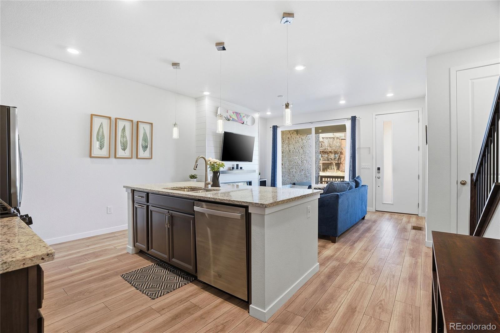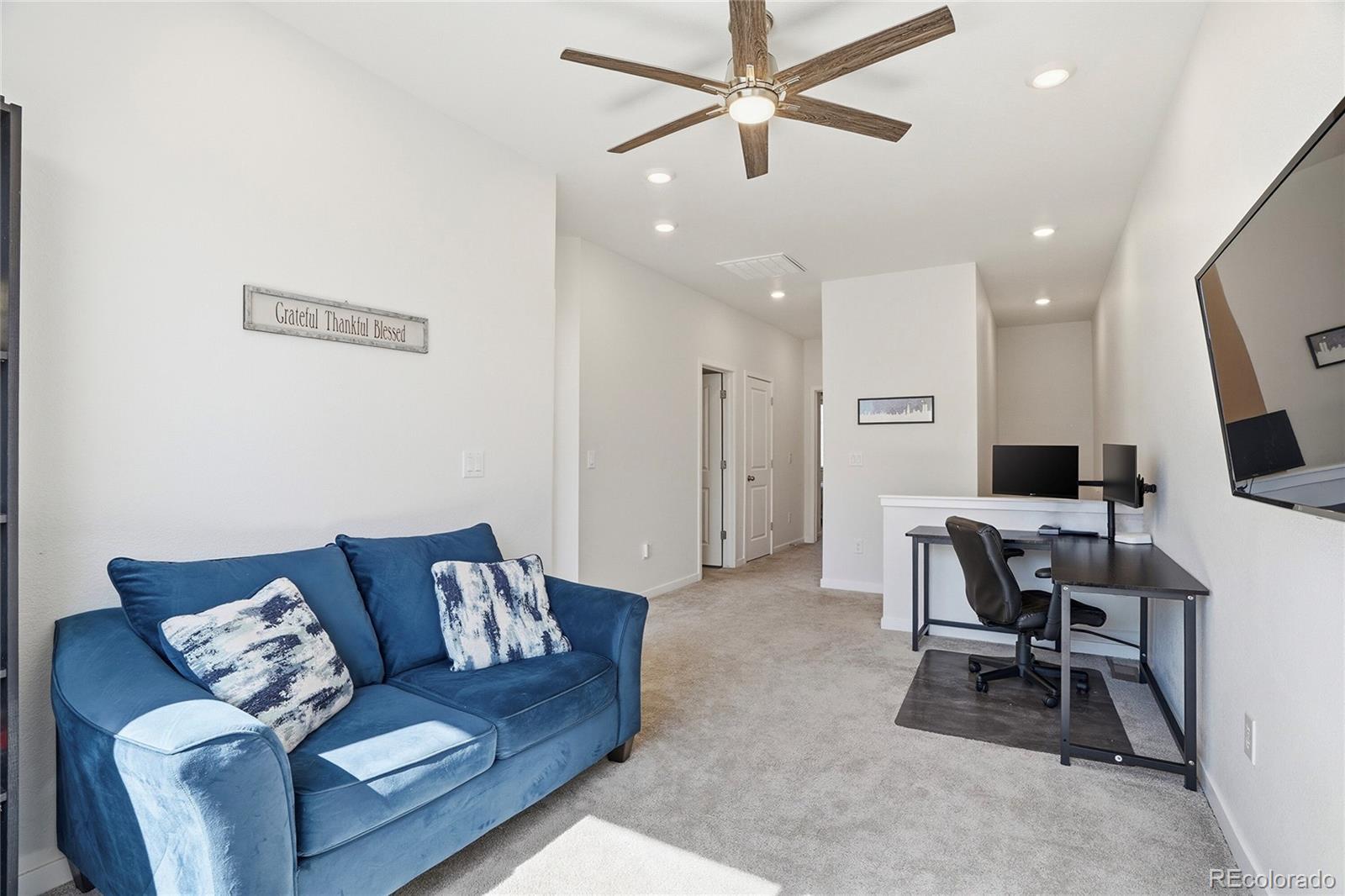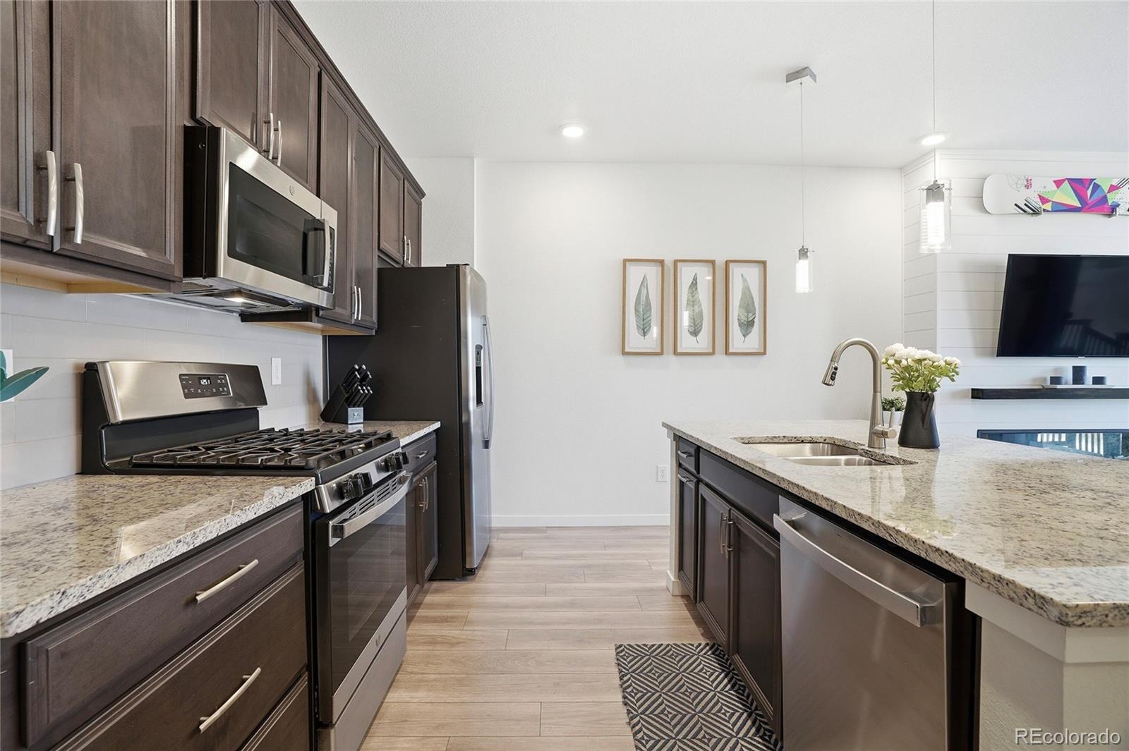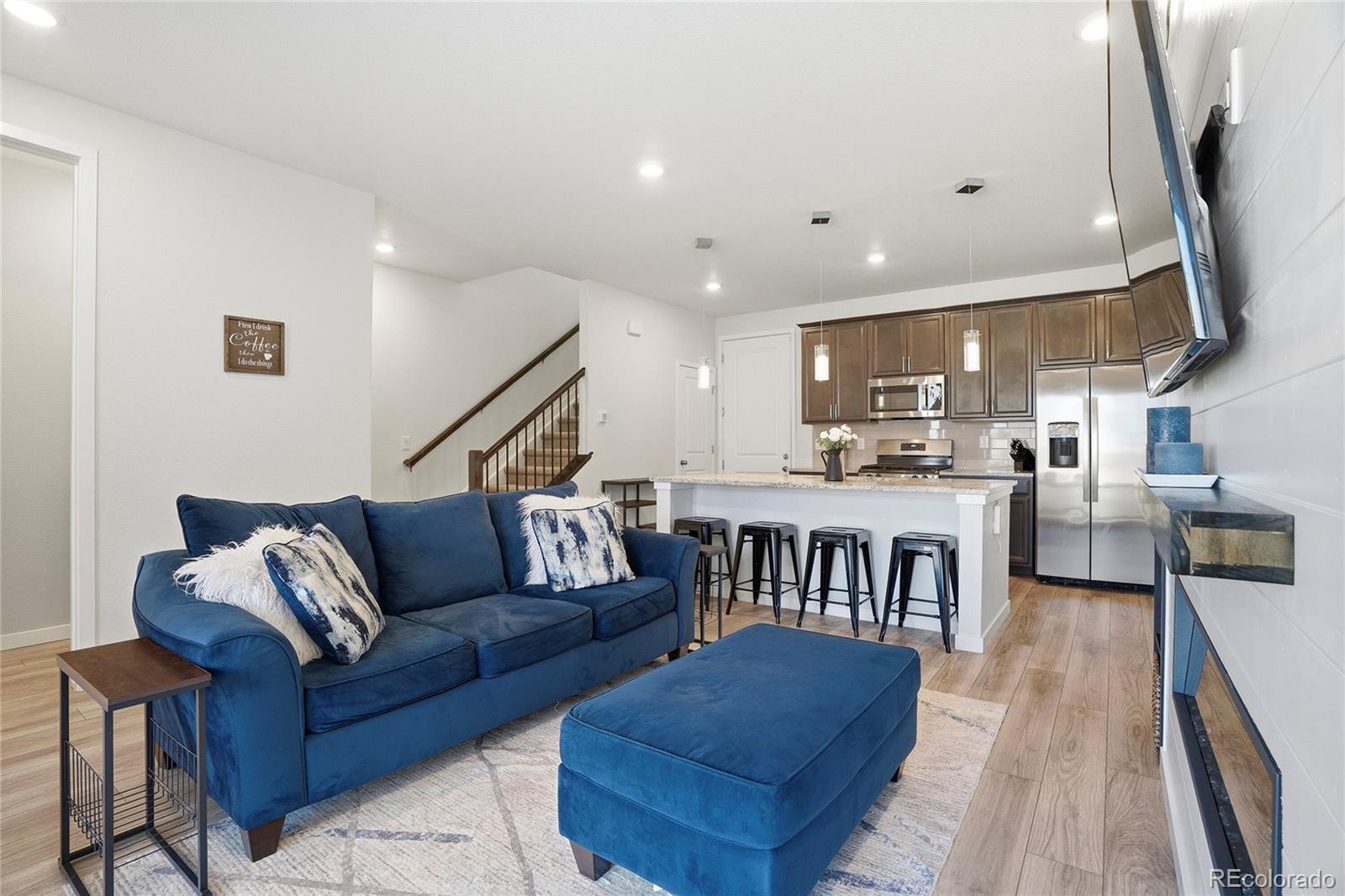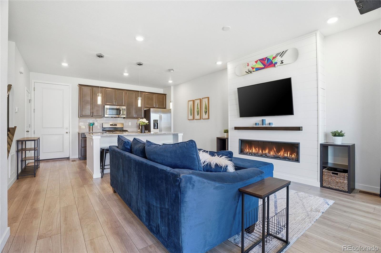 This lovely home is tucked into the best location in the community, offering peace, privacy, and beautiful open-space views from the spacious covered patio. Inside, the modern design shines with thoughtful upgrades throughout. The open-concept main level seamlessly connects the kitchen to the family room, where a sleek modern fireplace creates a warm and stylish focal point. The main floor also includes the added convenience of a stylish powder bath — perfect for guests. Upstairs, a generous flex space offers the versatility you need — ideal for a home office, workout area, or cozy additional living zone. Both bedrooms provide comfort and room to unwind, each complemented by custom-finished closets that maximize beauty and functionality. The oversized two-car garage is a dream, featuring epoxy flooring, built-in shelving, a workbench, and dedicated snowboard mounts. The community itself offers a refreshing outdoor pool, cabana, and playground. Plus, you’re just a short walk from Dunkin’ Donuts, Popeyes Chicken, and several other great local businesses.