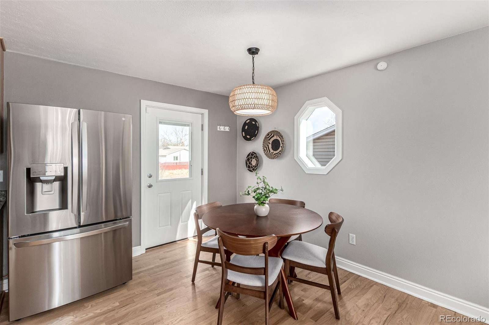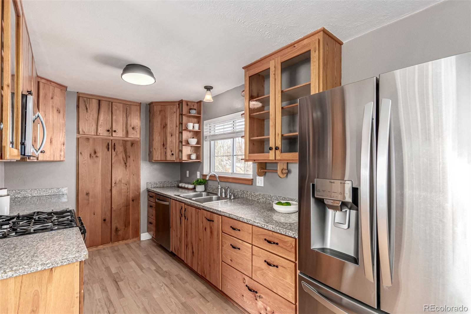 Welcome to this beautifully updated home, backing to a serene greenbelt. This charming home is move-in ready and showcases impressive updates and tasteful design touches throughout. Over $100,000 of updates in last few years including: new hot water heater, new appliances, new electric wiring, new A/C, new fence, new flooring throughout, a bathroom added, bathroom renovated and xeriscaping. As you enter, you're greeted by gleaming hardwood floors that guide you through the bright and welcoming living space with fireplace and open concept to dining and kitchen. The kitchen is equipped with stainless steel appliances, custom built-in wood cabinetry, pantry and brand-new flooring. Fresh paint brightens every corner, giving this home a welcoming and contemporary feel. Enjoy outdoor living in your serene backyard, complete with a storage shed: perfect for your gardening tools or outdoor supplies. The oversized two-car garage provides additional storage and convenience for your vehicles. Located in the heart of everything, right on the border of Broomfield/Westminster/Arvada, this home is just a short distance from excellent schools, local parks, and shopping centers, including the Broomfield Commons and Flatiron Crossing Mall. Easy access to major highways makes commuting a breeze, while the nearby trails and greenbelt offer wonderful opportunities for outdoor activities. Four parks within a 15 minute walk!!