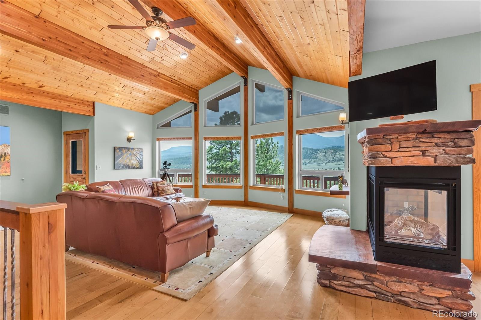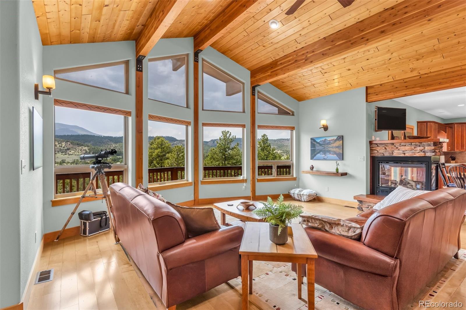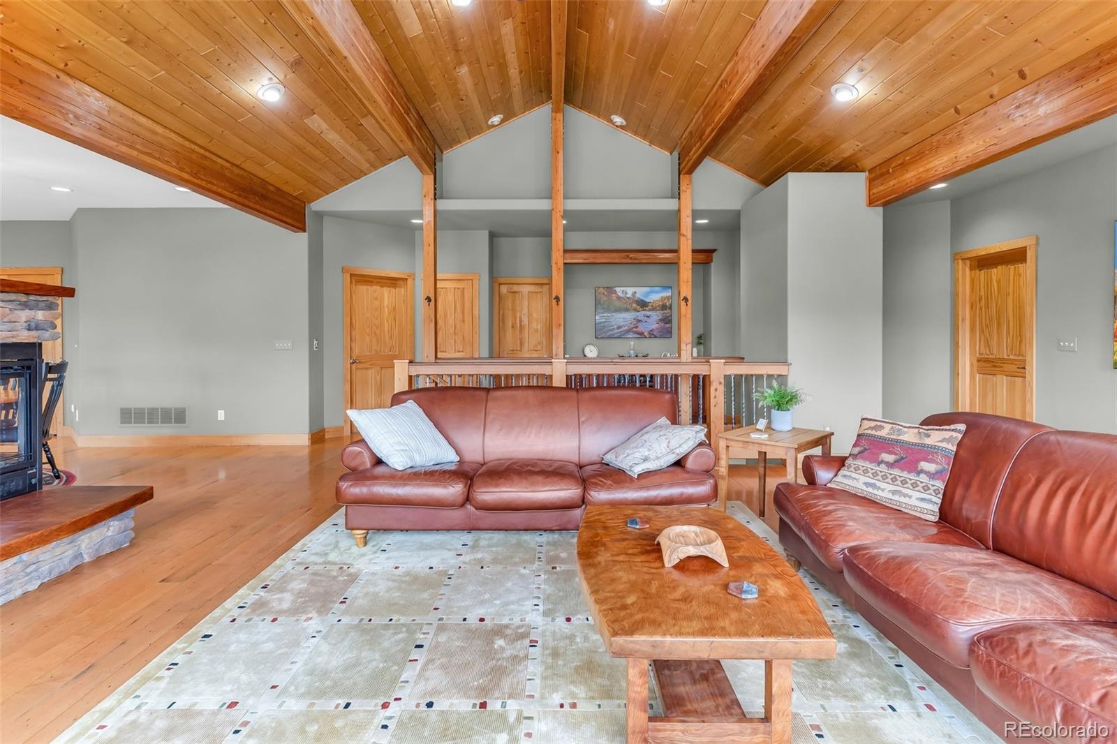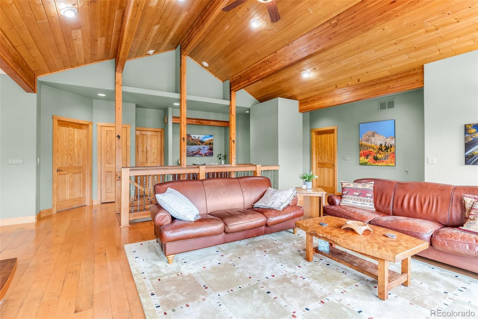 Welcome to your dream mountain escape! Nestled on 35 pristine acres with breathtaking views, this stunning home offers a peaceful lifestyle with every luxury you could imagine. The striking exterior, large deck in front and back, and expansive patio space set the tone for what's inside. Step into a warm, inviting kitchen featuring cherry cabinetry, granite countertops, and ample room to cook and entertain. Unwind in the dry sauna located in one of the home's well appointed bathrooms-perfect after a day outdoors. This home is equipped with thoughtful upgrades throughout, including a central whole-house vacuum system, a Generac 11kw whole-house generator, and a 1,700-gallon cistern for added self-sufficiency and Reverse Osmosis System. A bonus room that can be used as a home office, gym or even a nursery. Enjoy the incredible 30x42 detached insulated garage with 220v power and its own fireplace-ideal for a workshop, vehicle storage. Whether you're relaxing in the hot tub under the starts or enjoying morning coffee while soaking in the panoramic mountain views, this home delivers the ultimate Colorado lifestyle. Don't miss your opportunity to own this on-of-a-kind property that perfectly blends comfort, style, and unmatched natural beauty.