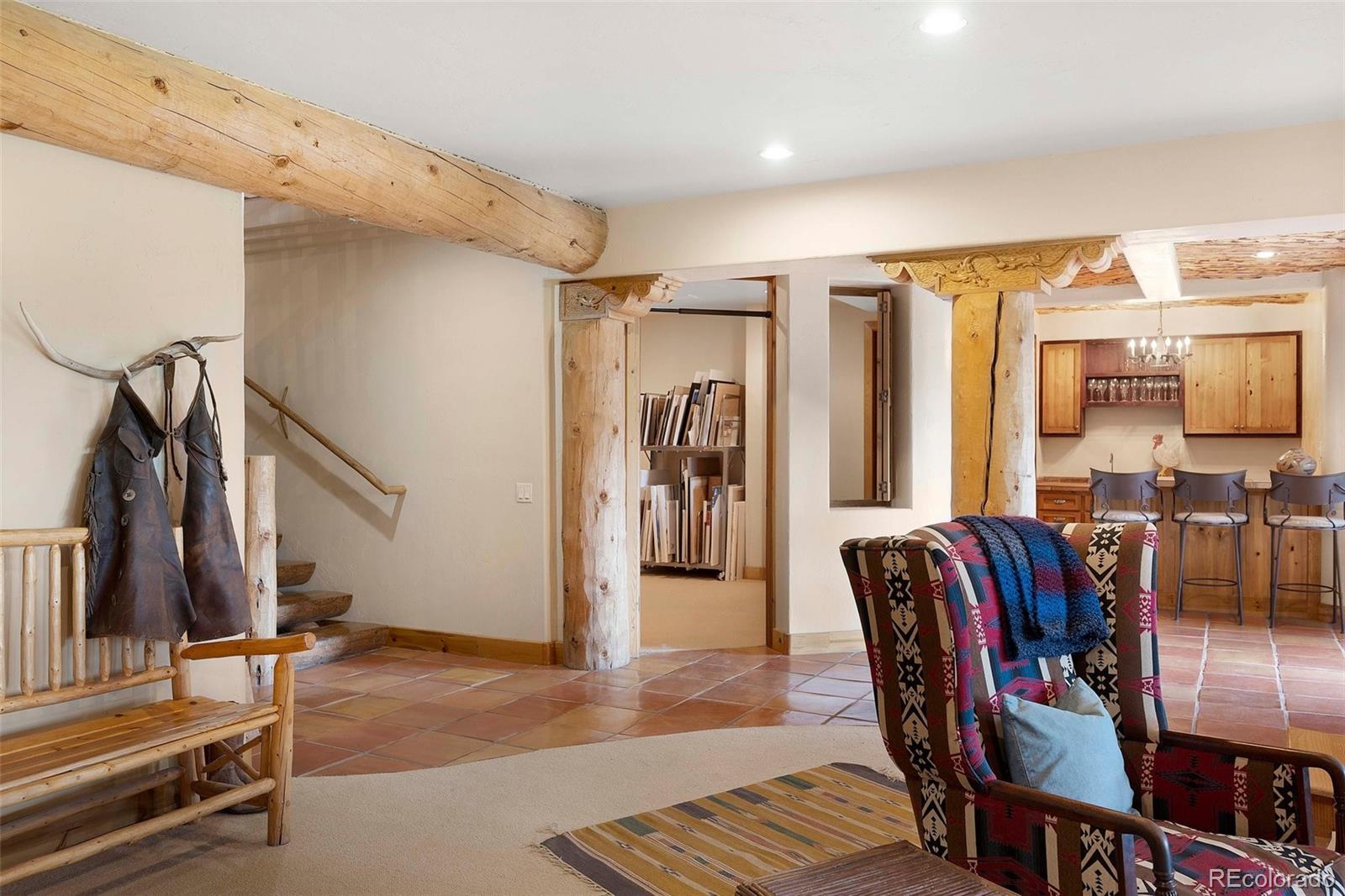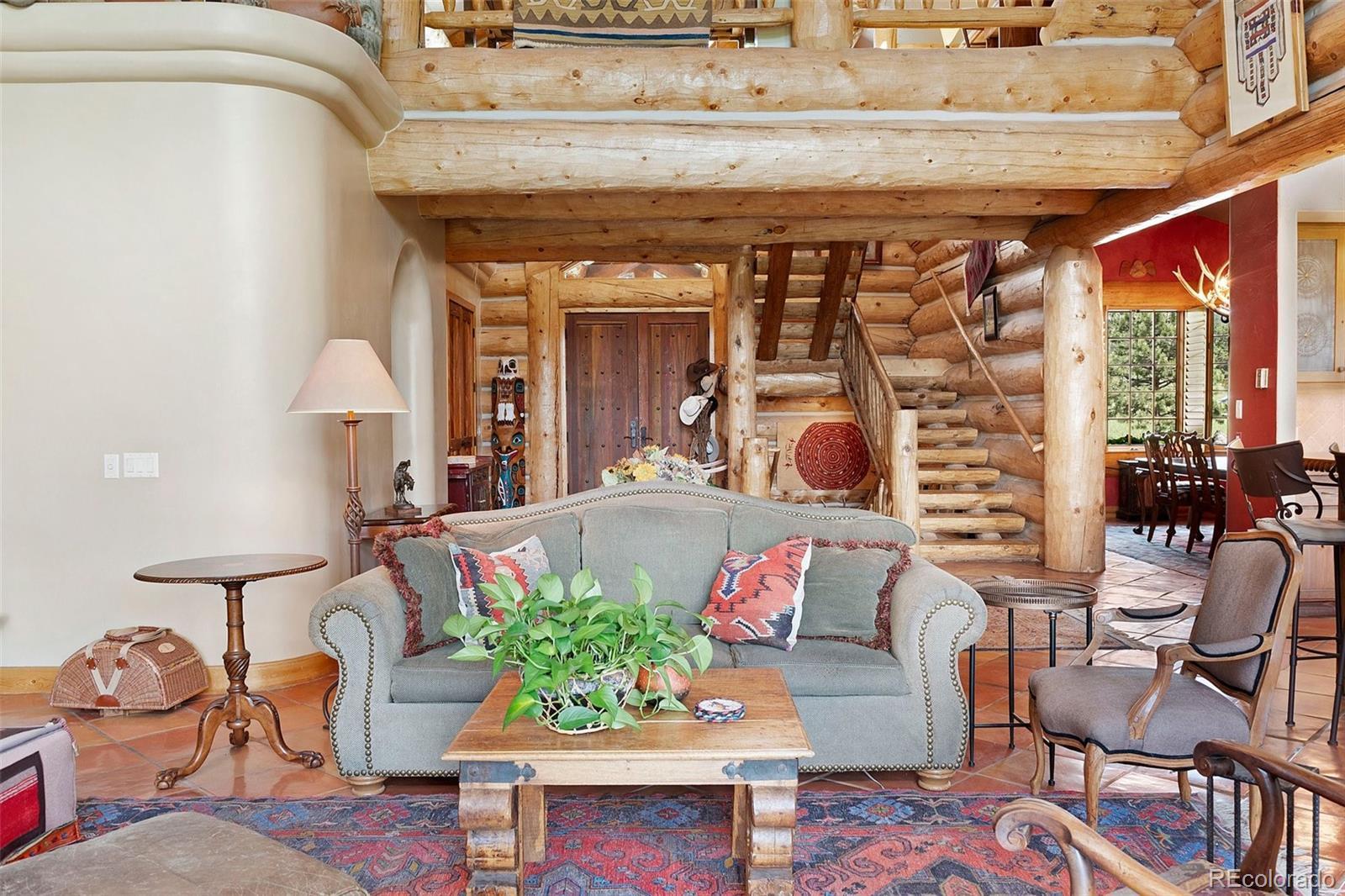 Welcome to a Colorado dream retreat nestled on a coveted 5.1 acre site overlooking a private lake, meadow and local wildlife. With timeless architectural details, custom artisan craftsmanship, and unforgettable view this breathtaking log and stucco home with rock accents is truly a sanctuary of warmth and character. Constructed with oversized full-round spruce logs from Colorado. Handcrafted details found throughout include 8-ft solid wood doors, custom cabinetry with hand-punched tin and Saguaro cactus inlays, a hand-carved bar imported from New Mexico with custom carved corbels, vigas, and latillas. Three kiva-style gas fireplaces in the family room, great room and private courtyard add warmth and ambiance, along with a double-sided gas fireplace in the primary suite. A thoughtful and elegant design features a stunning two story great room with dramatic log beams and saltillo tile floors, gracious formal dining, a charming breakfast nook and bar area perfect for entertaining, a cozy loft office with skylights, and a beautiful primary suite with generous his & hers walk-in closets. Outdoor living is exceptional with a covered upper deck for dining, private balcony off the primary bedroom, and a beautiful southwestern style courtyard with fireplace and a covered patio. Large picture windows frame lake and wildlife views, while passive solar and southern exposure enhance efficiency. Enjoy in-floor radiant heat with 8 zones, including the greenhouse, garage, and workshop. The oversized 3-car garage includes a camper bay. 4 bedrooms, 3 baths, 5543 sf. 1997 built. Unique craftsmanship, natural beauty, and thoughtful design define this unforgettable home in a peaceful community in a wonderful neighborhood.