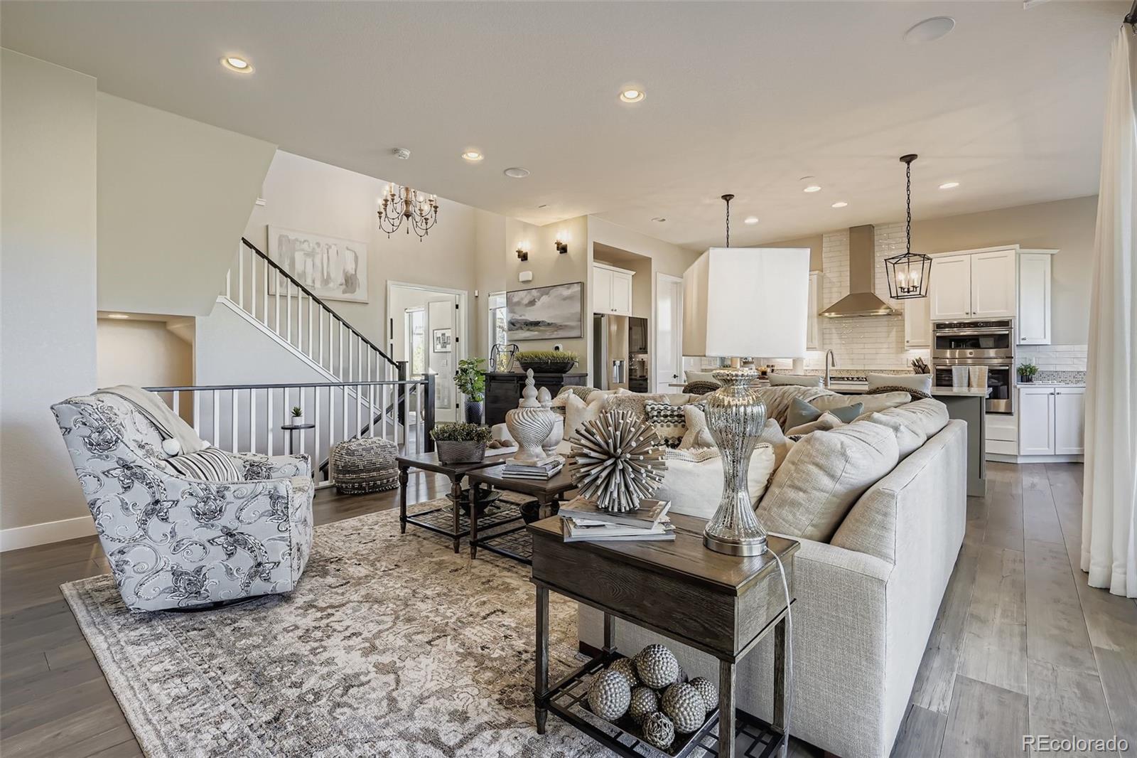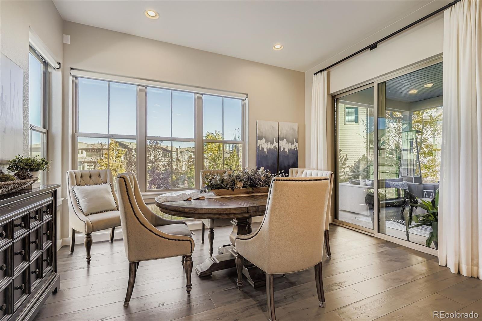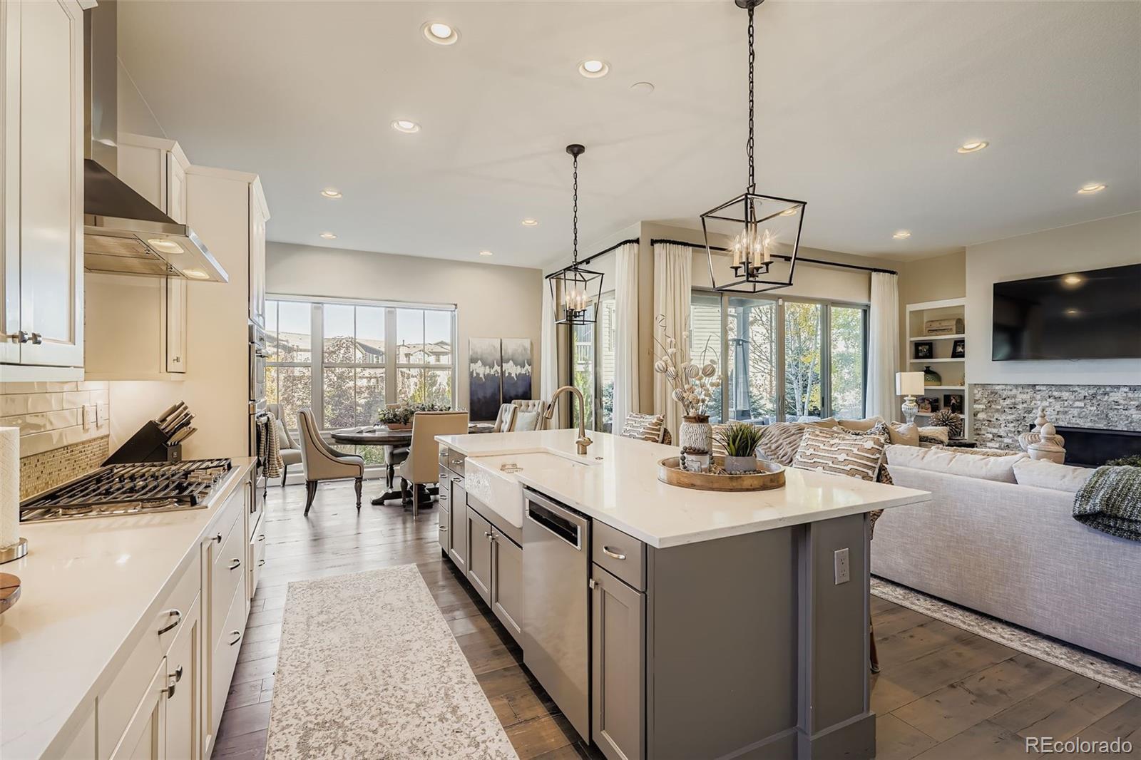 Discover luxurious living in this meticulously maintained 4-bedroom, 4-bathroom Highlands Ranch home in the gated Backcountry neighborhood. This 3,770 sq. ft. residence boasts a gourmet kitchen with quartzite counters, a gas stove-top, and walk-in pantry. The eat-in kitchen is surrounded by over-sized windows that flood the space with natural light. The open floor plan has tall ceilings, and seamless indoor-outdoor living through large sliding doors leading to a covered outdoor space, where you can relax and enjoy the low maintenance landscaping. A main level office, with glass french doors and windows galore, is the perfect place to spend your work day. Retreat upstairs to the expansive primary suite with a spa-like 5-piece ensuite and large walk-in closet. Enjoy mountain views from two secondary bedrooms, and the conveniently located upstairs laundry. An extra-wide, grand staircase leads down to the finished basement which offers a second large gathering area, wet bar, guestroom with private bath, and ample storage. The whole house has automatic Somfy shades, and a 4 zone sound system wired for Sonos. The insulated garage with epoxy floors features a west-facing driveway that quickly melts the snow away. Exclusive access to the hub of the neighborhood - the Sundial House - provides a restaurant, lounge, pool, and health/wellness facilities. Backcountry residents also get access to private trails for all-season activities like hiking, biking and snowshoeing, and the opportunity to see all the wildlife that Colorado has to offer. Experience a luxury home with resort-like amenities at every turn. Schedule your showing today!