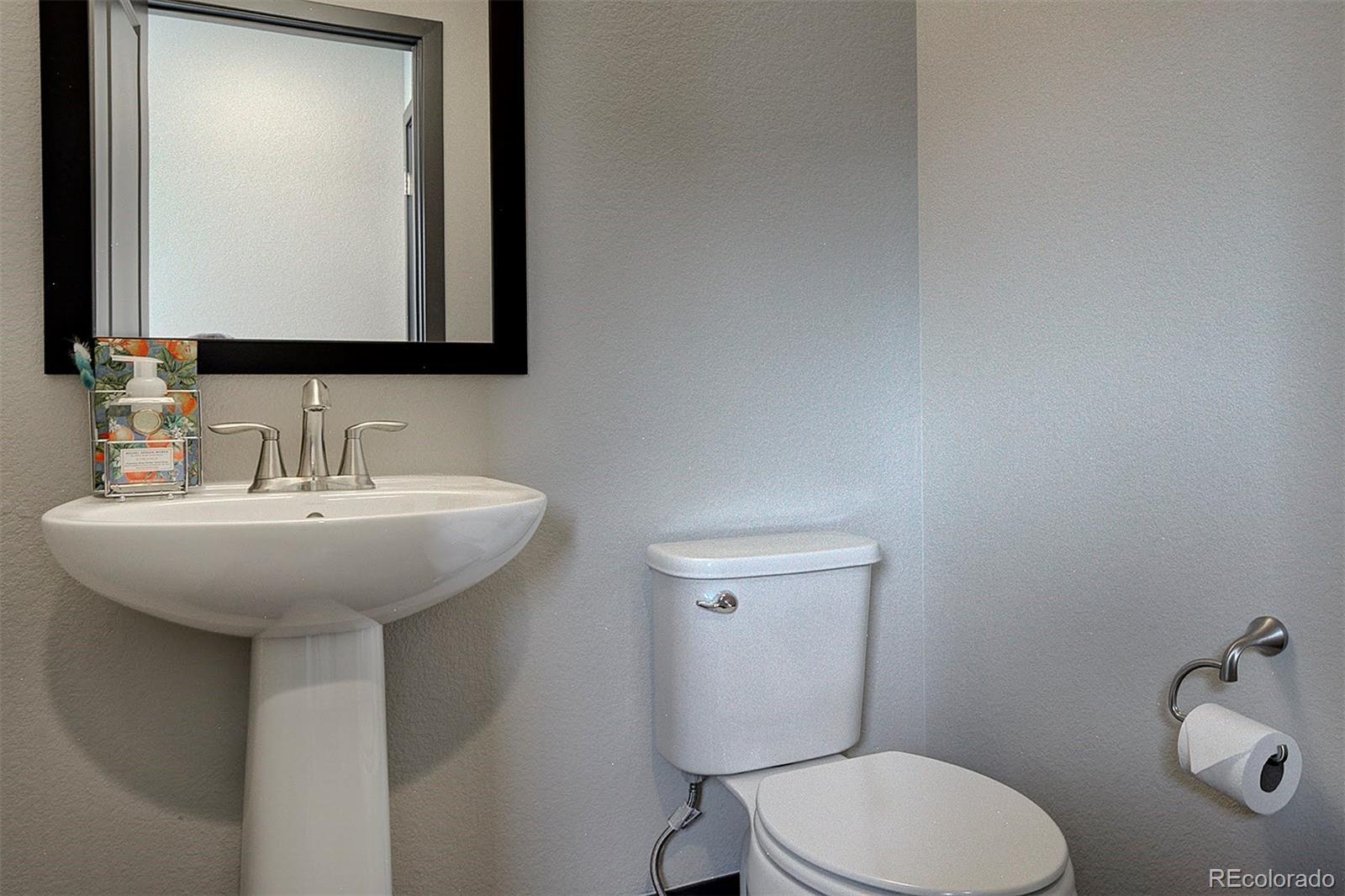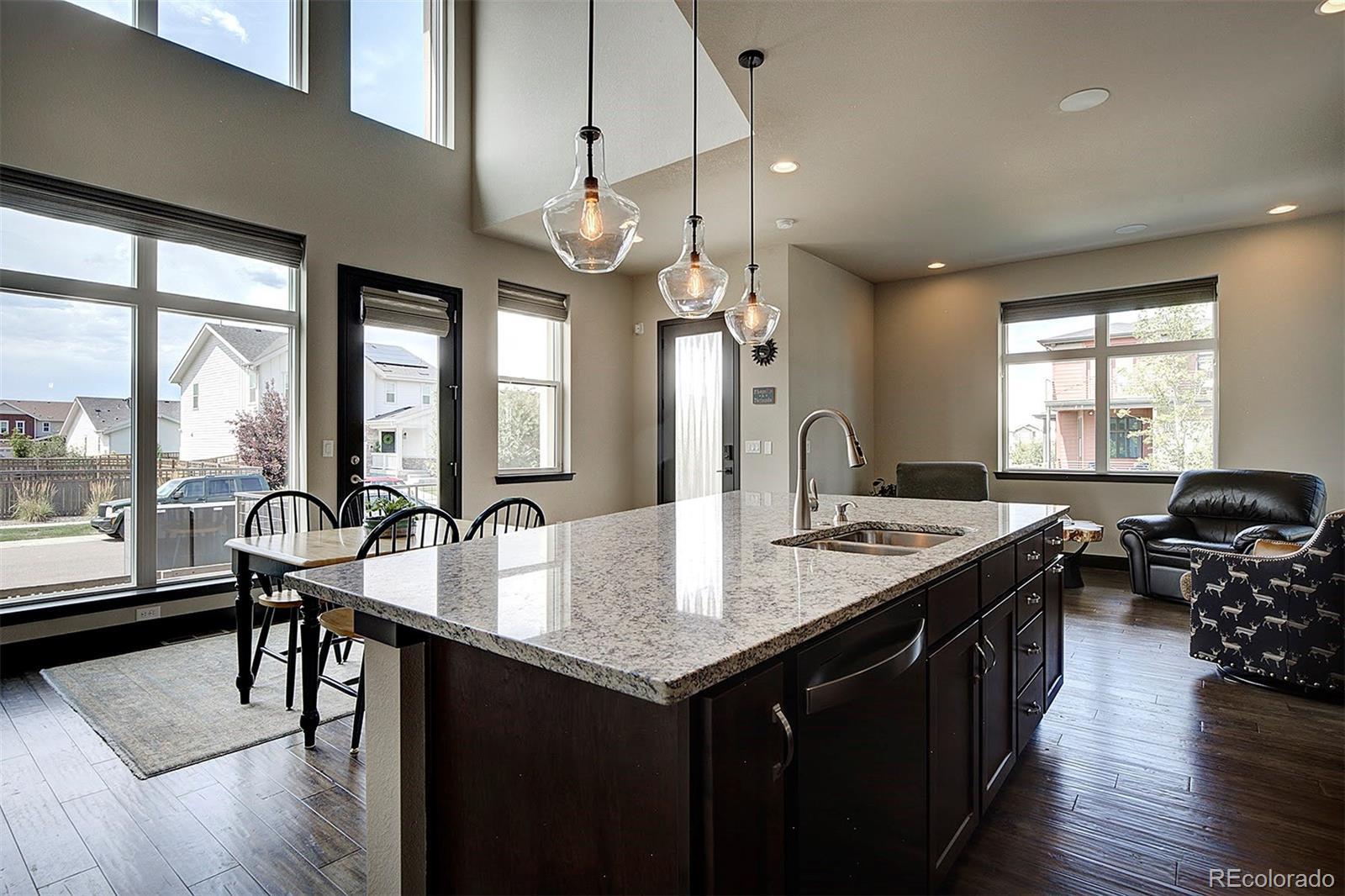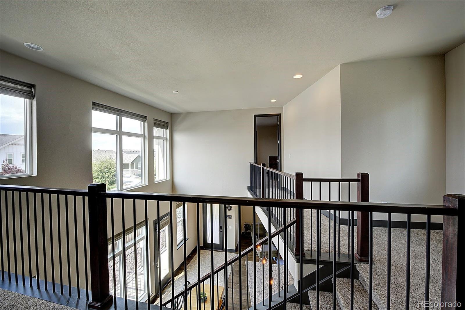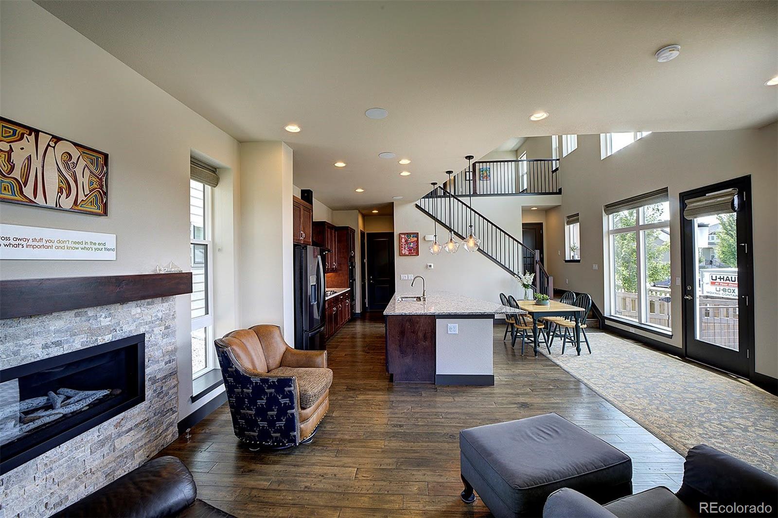 Like new, this single-family home completed in 2022 is ready for your personal touches. Located in the up-and-coming Painted Prairie community on a corner lot, it includes a covered front porch with wraparound patio including a gas hookup for your grill, plus a small fenced in side yard. Off the primary bedroom upstairs is a wrapround balcony overlooking the shared courtyard with firepit and picnic table. Inside you’ll find a two-story wall of windows facing west and bathing the room with light, which can be controlled by custom, automated Hunter Douglas shades. The large granite kitchen island is the centerpiece of the open concept lower level with spacious kitchen including Whirlpool black stainless-steel appliances, 5-burner gas cooktop, fan hood, and large walk-in pantry. The gas fireplace in the main room adds ambiance and warmth; above the fireplace is the conduit and power for a TV. Hand-scraped African hardwood covers the floors on the lower level. A powder room completes the first level. The second level includes a large primary bedroom with custom wood shutters and an in-suite bathroom. Down the open hallway is a laundry closet, second bedroom with Jack n Jill bathroom that connects to the loft that overlooks the downstairs area. The home feels expansive with the high ceilings, loft and numerous windows. The 2-car garage is fully finished and wired for an EV charger. There are built-in ceiling speakers on the lower level and loft that can stream audio from your phone using the provided VSSL equipment. Conveniently located close to the community park with walking trails, plus a short drive to retail, dining, and only 10 minutes to DIA via Jackson Gap Road.