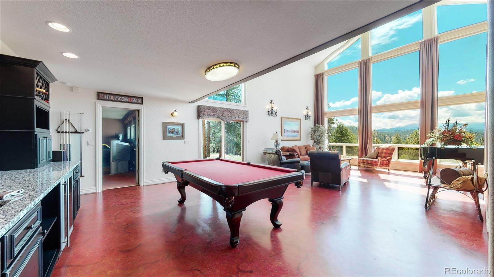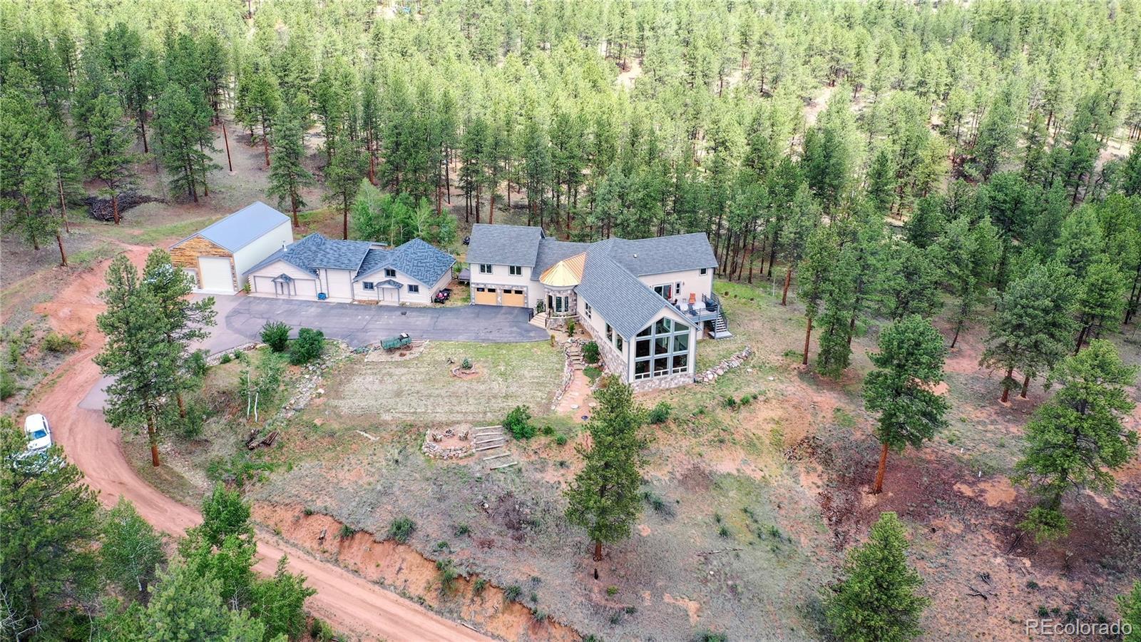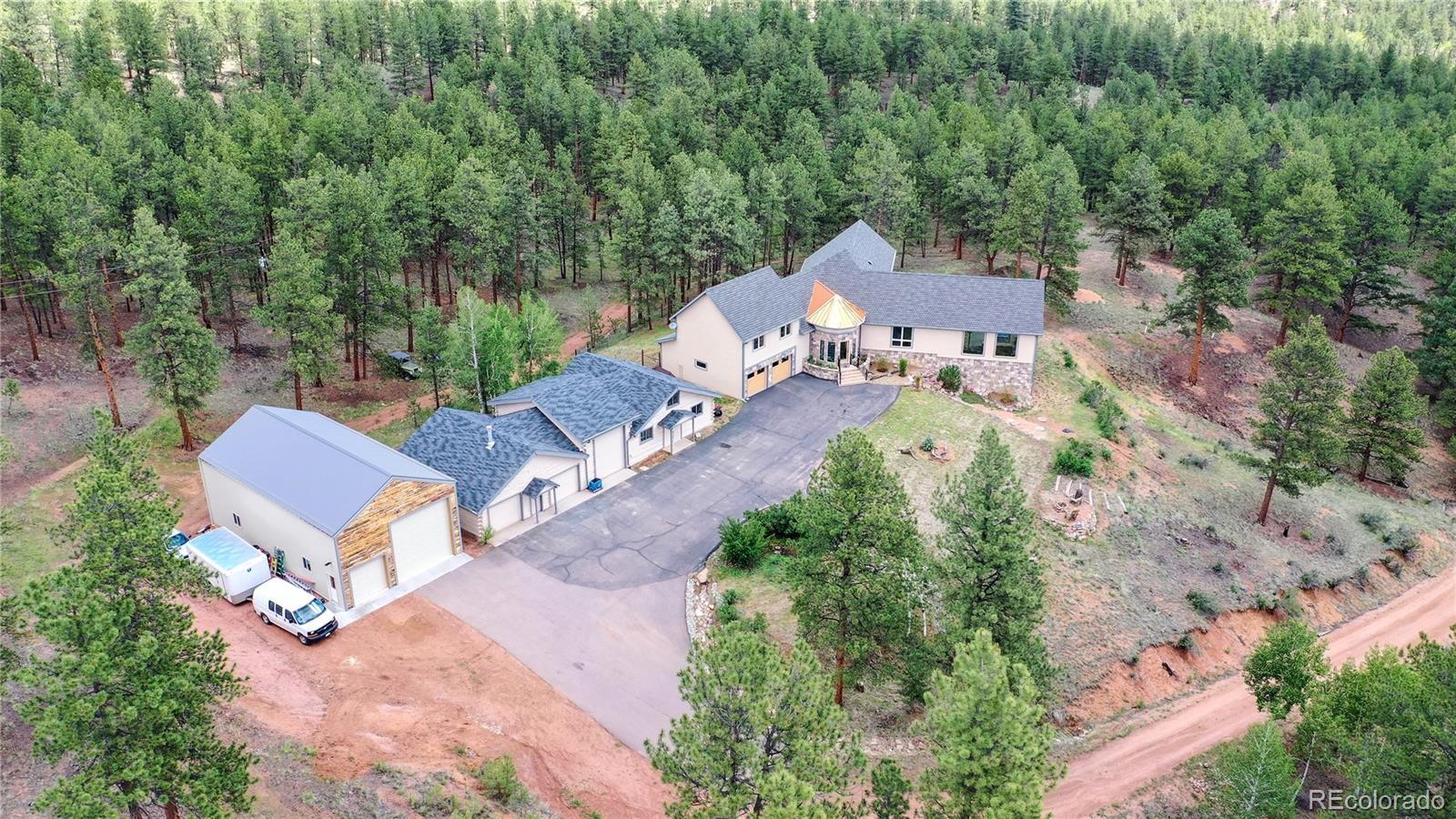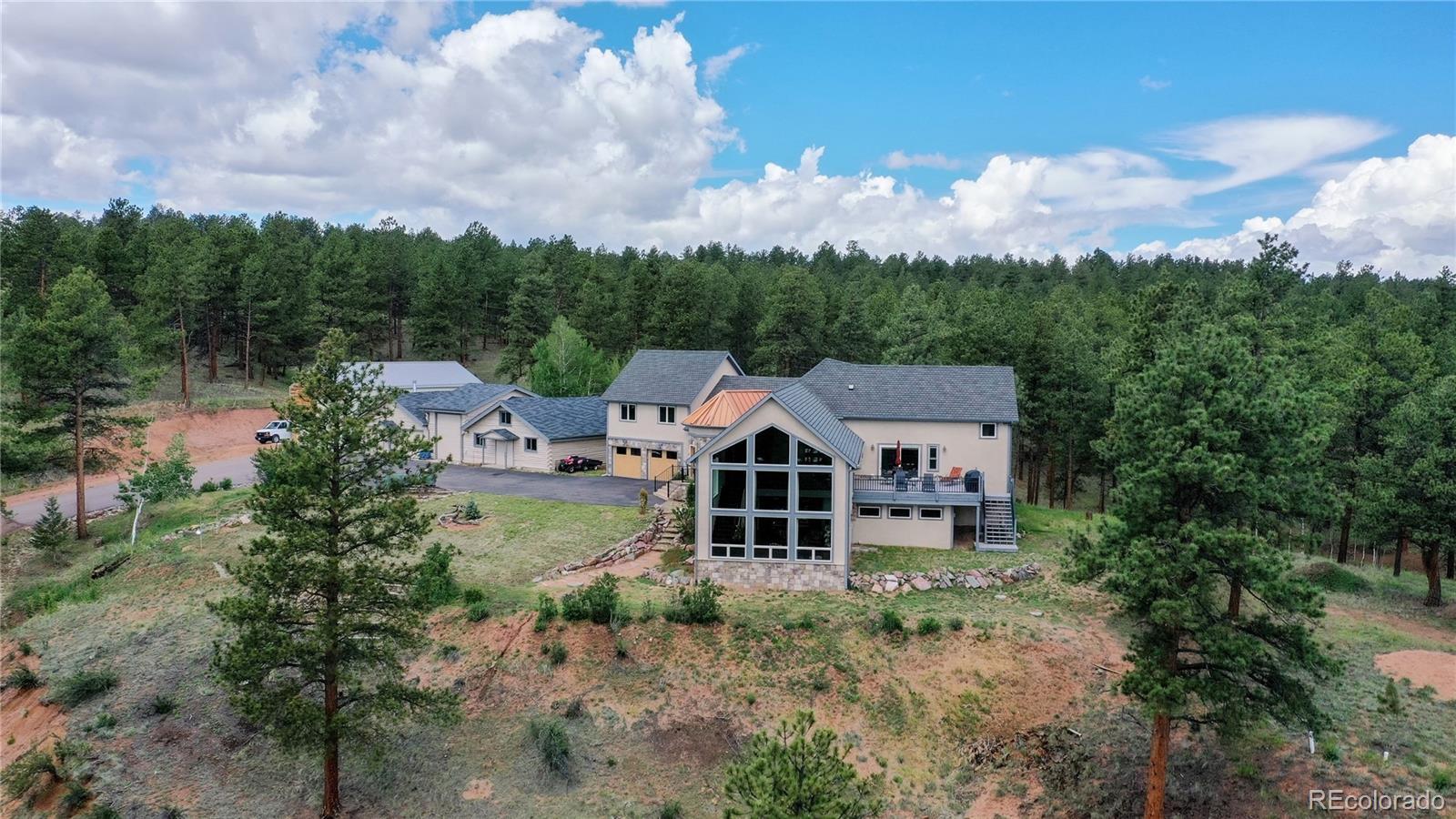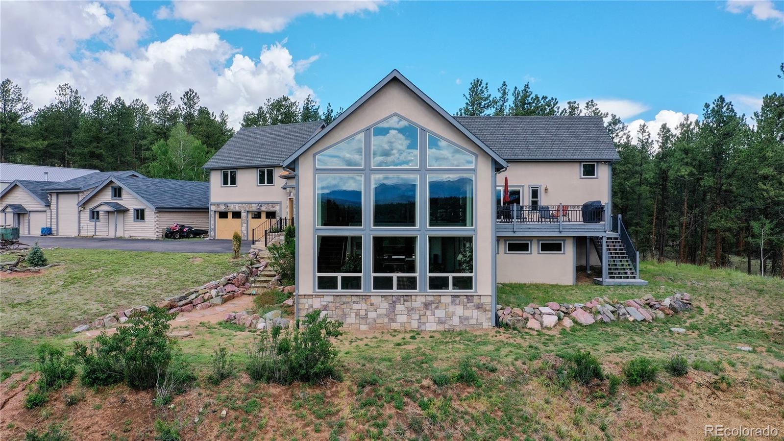 Spectacular Mountain Home on 38 acres with breathtaking view of Pikes Peak. Step in the front door and be blown away by how the owners captured the views from every inch of this home. Open floorplan with a massive gourmet kitchen that will impress any master chef, spacious dining room that walks out to an oversized deck, vaulted ceilings and a wall of windows that has Pikes Peak staring back at you. Main level primary suite with attached 5 piece bathroom, jetted tub, walk in shower, double vanities, sitting area, gas fireplace and an upper level private office. Venture to the other side of the home and you will find two large guest bedroom and a full bathroom. Lower level consist of an unbelievable Living room with a wet bar, pool table, ½ bathroom, attached theater room and a gym. Now let the fun begin!!!! Attached two car garage with heated dog kennels, separate “Barn” approximately 2,400 SQ FT that has two regular garage doors and one large RV garage door with attached shop, full RV hookups with dump station and….. another RV garage with two massive doors and the building measures about 28’x50’ that will hold any toys that you can imagine. Now take the time to walk the 38 acres and see that this property has it all, rolling hills, trees, meadows and views, what more can you ask for?