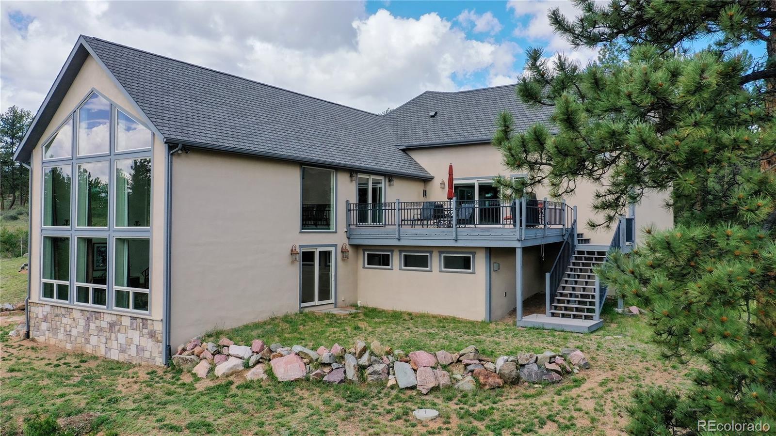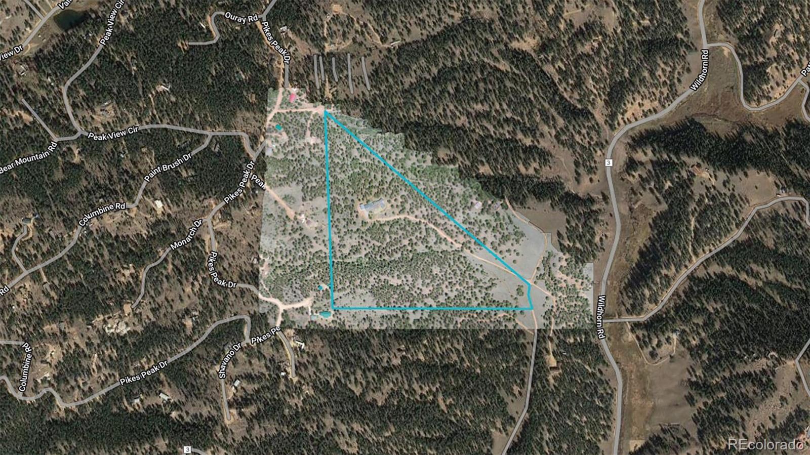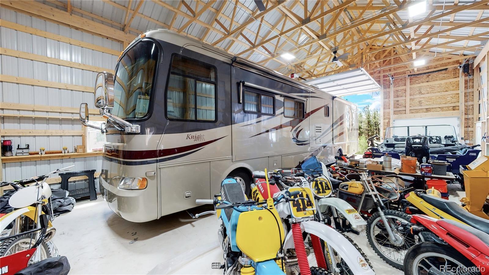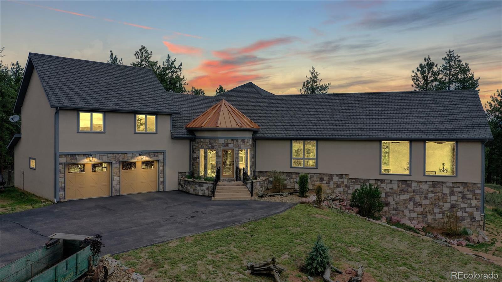 Spectacular Mountain Home on 38 acres with breathtaking view of Pikes Peak. Step in the front door and be blown away by how the owners captured the views from every inch of this home. Open floorplan with a massive gourmet kitchen that will impress any master chef, spacious dining room that walks out to an oversized deck, vaulted ceilings and a wall of windows that has Pikes Peak staring back at you. Main level primary suite with attached 5 piece bathroom, jetted tub, walk in shower, double vanities, sitting area, gas fireplace and an upper level private office. Venture to the other side of the home and you will find two large guest bedroom and a full bathroom. Lower level consist of an unbelievable Living room with a wet bar, pool table, ½ bathroom, attached theater room and a gym. Now let the fun begin!!!! Attached two car garage with heated dog kennels, separate “Barn” approximately 2,400 SQ FT that has two regular garage doors and one large RV garage door with attached shop, full RV hookups with dump station and….. another RV garage with two massive doors and the building measures about 28’x50’ that will hold any toys that you can imagine. Now take the time to walk the 38 acres and see that this property has it all, rolling hills, trees, meadows and views, what more can you ask for?