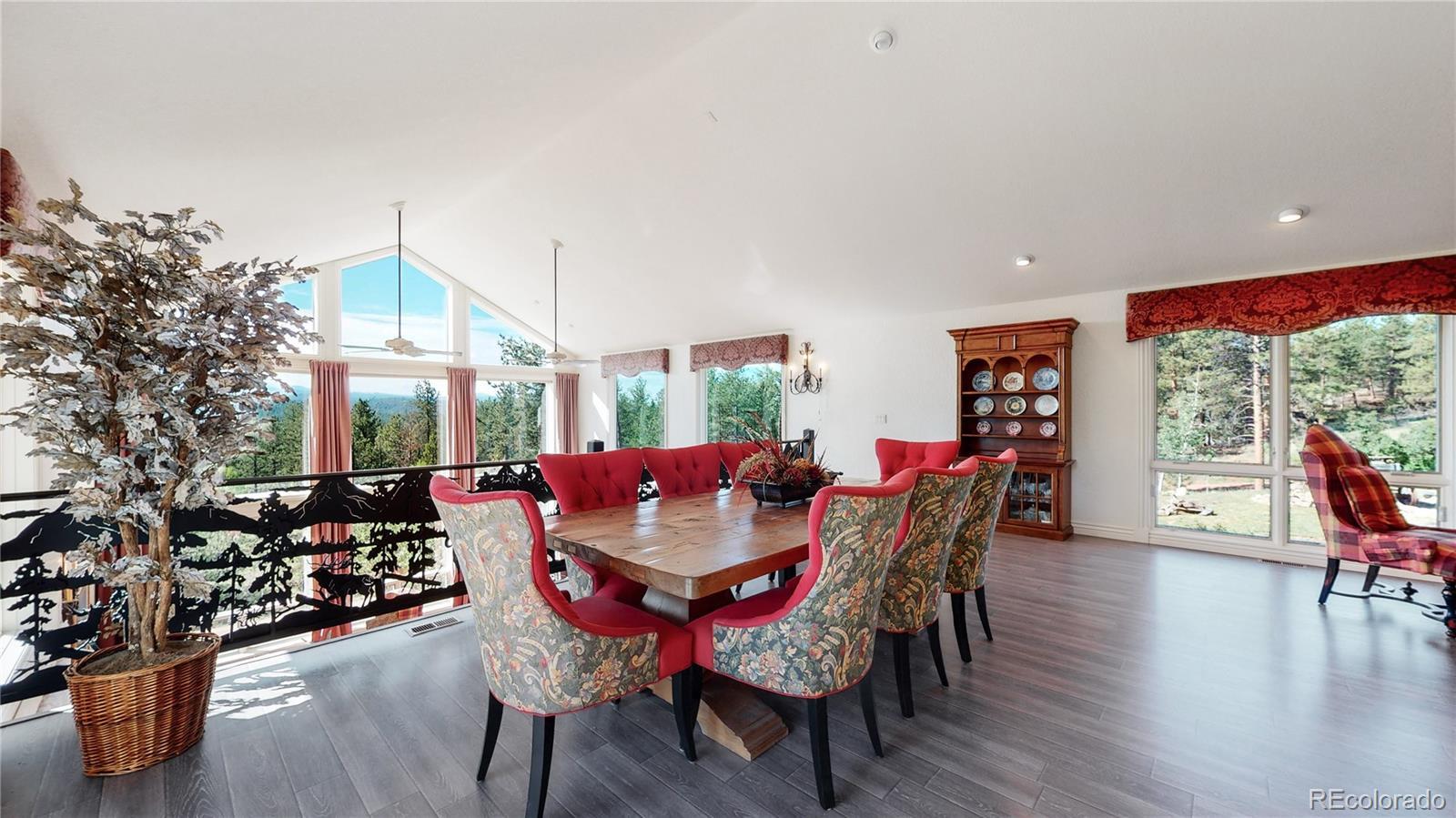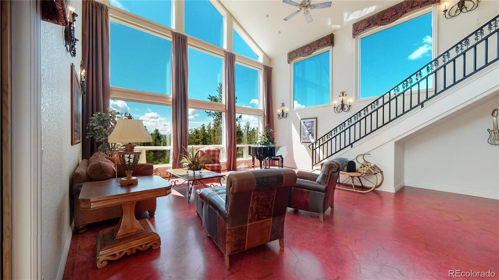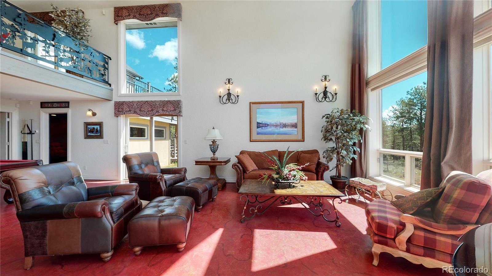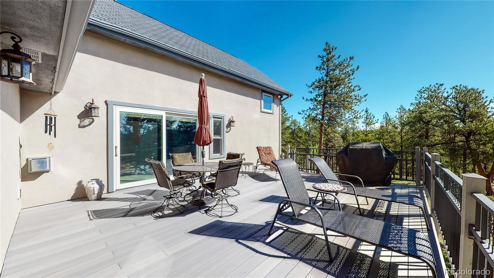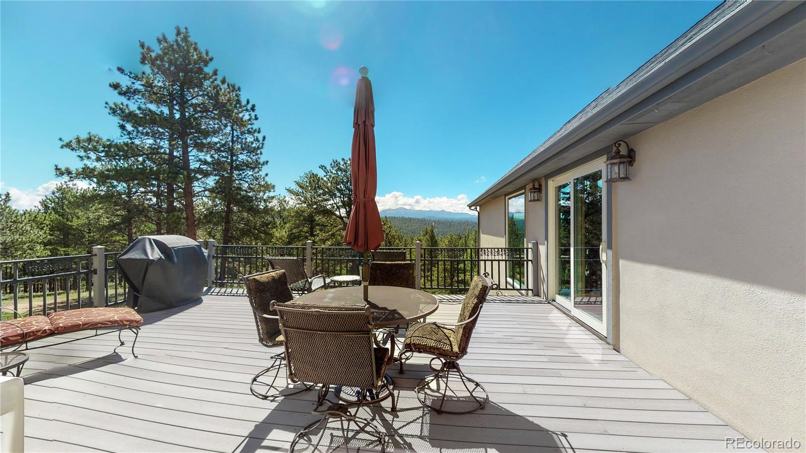 Spectacular Mountain Home on 38 acres with breathtaking view of Pikes Peak. Step in the front door and be blown away by how the owners captured the views from every inch of this home. Open floorplan with a massive gourmet kitchen that will impress any master chef, spacious dining room that walks out to an oversized deck, vaulted ceilings and a wall of windows that has Pikes Peak staring back at you. Main level primary suite with attached 5 piece bathroom, jetted tub, walk in shower, double vanities, sitting area, gas fireplace and an upper level private office. Venture to the other side of the home and you will find two large guest bedroom and a full bathroom. Lower level consist of an unbelievable Living room with a wet bar, pool table, ½ bathroom, attached theater room and a gym. Now let the fun begin!!!! Attached two car garage with heated dog kennels, separate “Barn” approximately 2,400 SQ FT that has two regular garage doors and one large RV garage door with attached shop, full RV hookups with dump station and….. another RV garage with two massive doors and the building measures about 28’x50’ that will hold any toys that you can imagine. Now take the time to walk the 38 acres and see that this property has it all, rolling hills, trees, meadows and views, what more can you ask for?