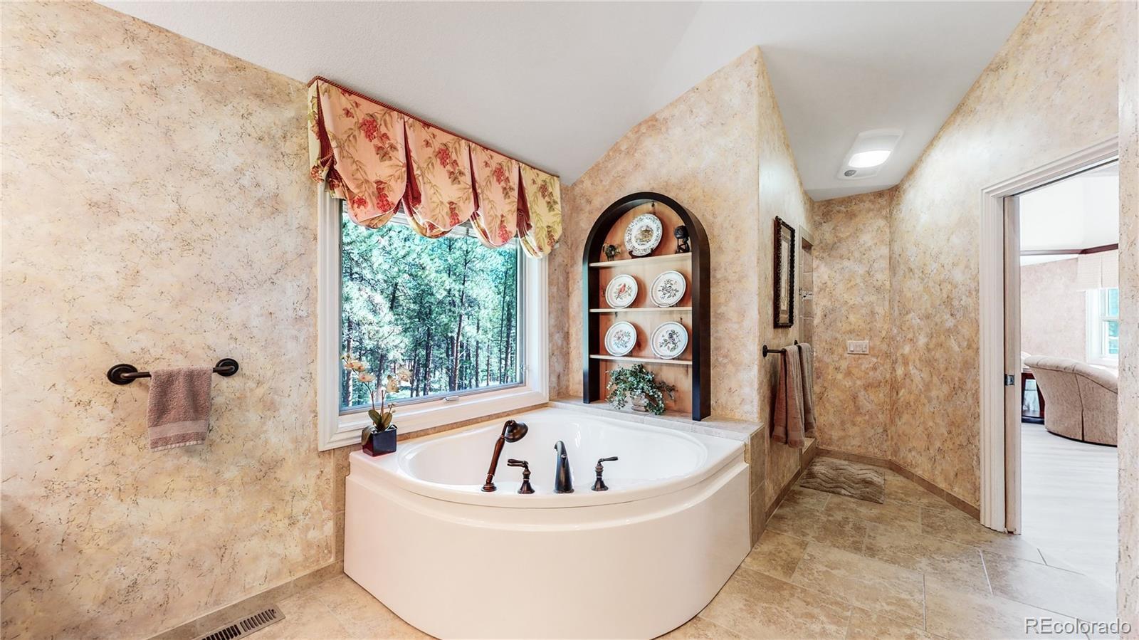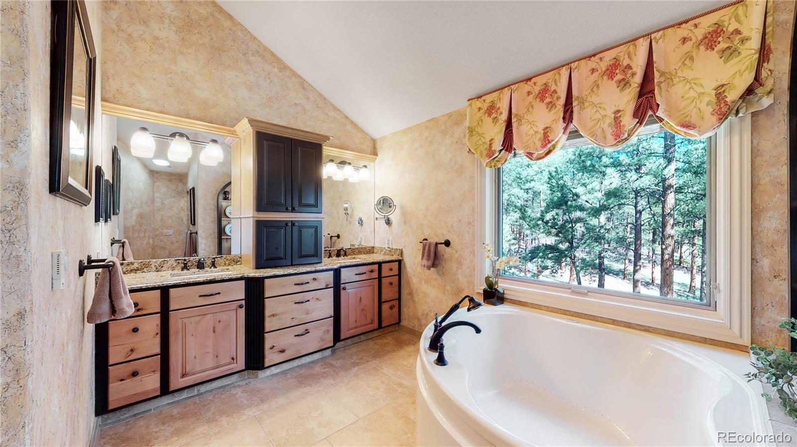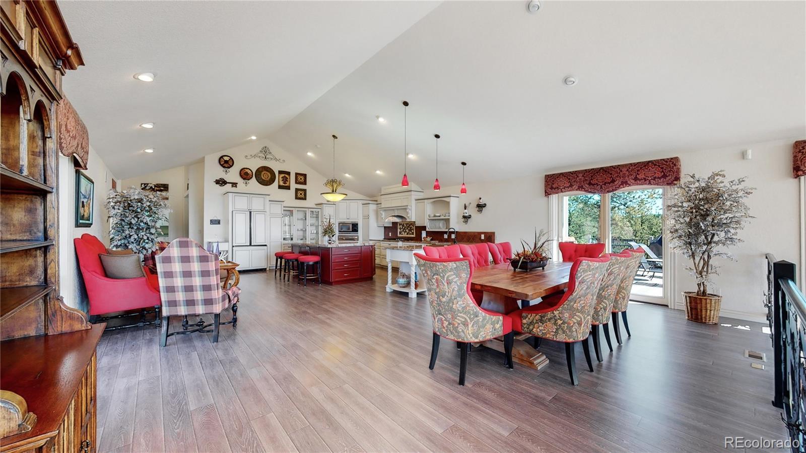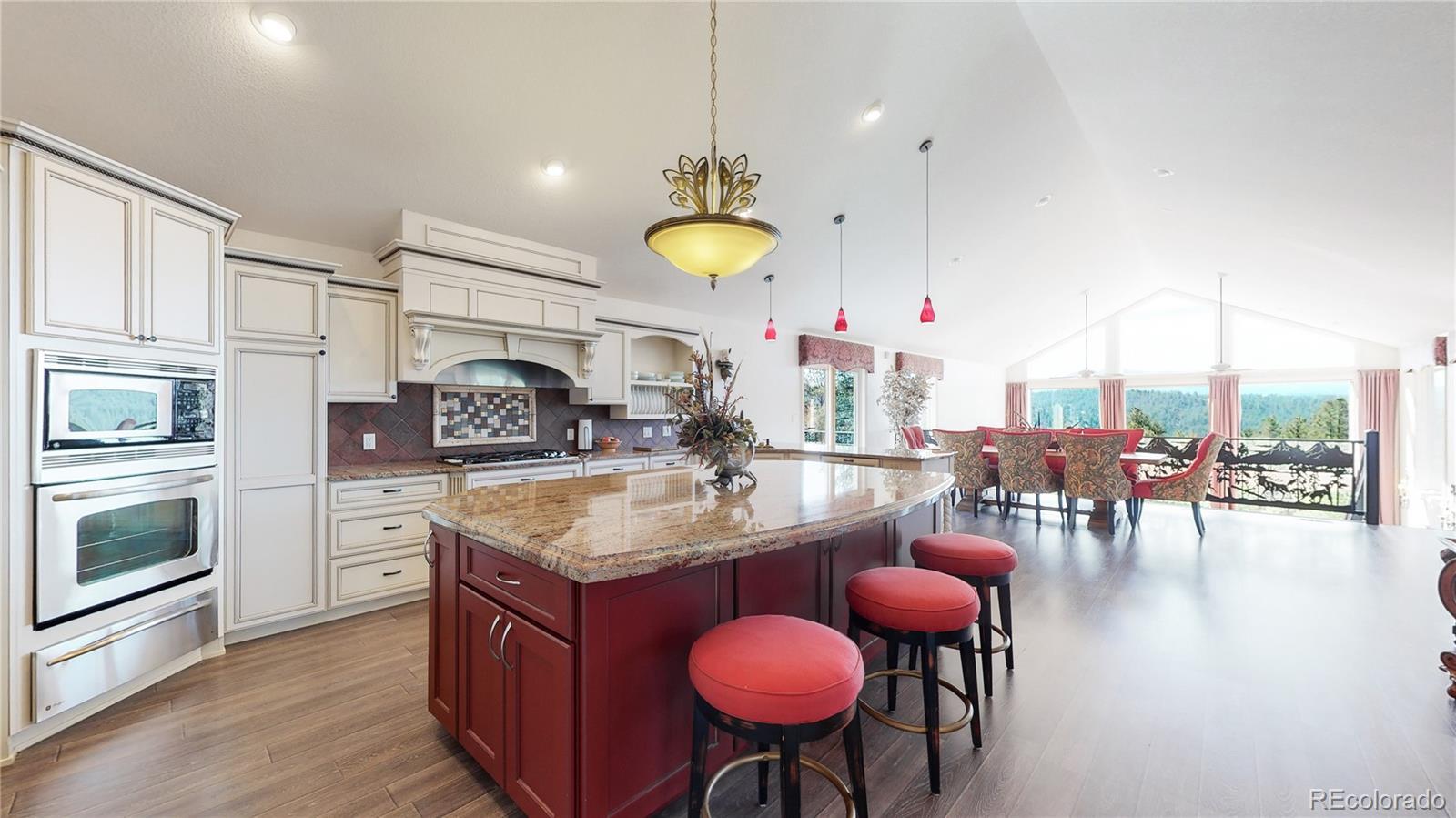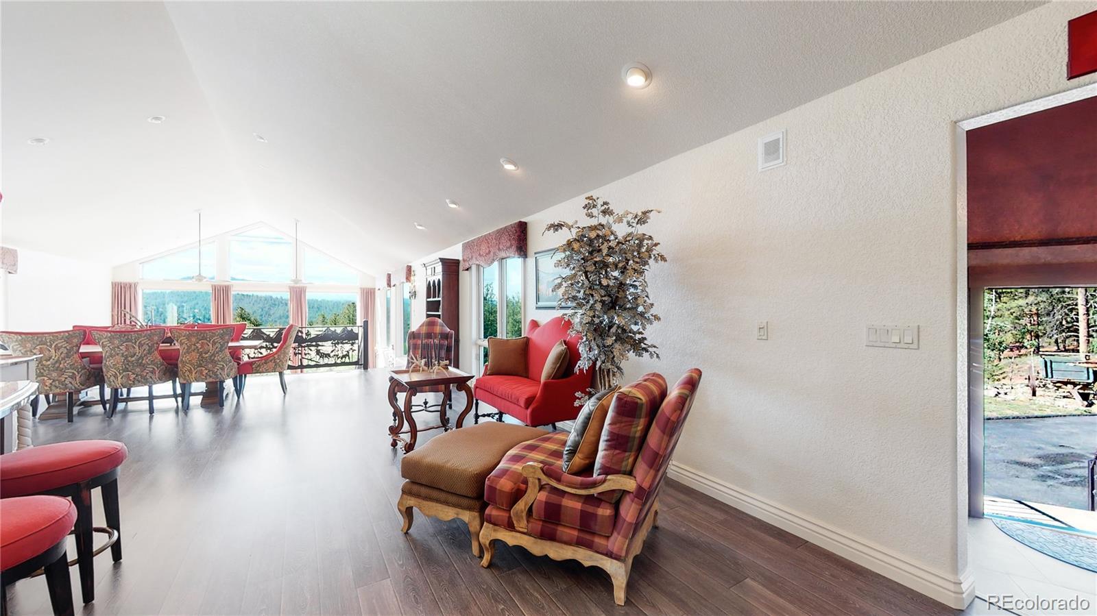Spectacular Mountain Home on 38 acres with breathtaking view of Pikes Peak. Step in the front door and be blown away by how the owners captured the views from every inch of this home. Open floorplan with a massive gourmet kitchen that will impress any master chef, spacious dining room that walks out to an oversized deck, vaulted ceilings and a wall of windows that has Pikes Peak staring back at you. Main level primary suite with attached 5 piece bathroom, jetted tub, walk in shower, double vanities, sitting area, gas fireplace and an upper level private office. Venture to the other side of the home and you will find two large guest bedroom and a full bathroom. Lower level consist of an unbelievable Living room with a wet bar, pool table, ½ bathroom, attached theater room and a gym. Now let the fun begin!!!! Attached two car garage with heated dog kennels, separate “Barn” approximately 2,400 SQ FT that has two regular garage doors and one large RV garage door with attached shop, full RV hookups with dump station and….. another RV garage with two massive doors and the building measures about 28’x50’ that will hold any toys that you can imagine. Now take the time to walk the 38 acres and see that this property has it all, rolling hills, trees, meadows and views, what more can you ask for?