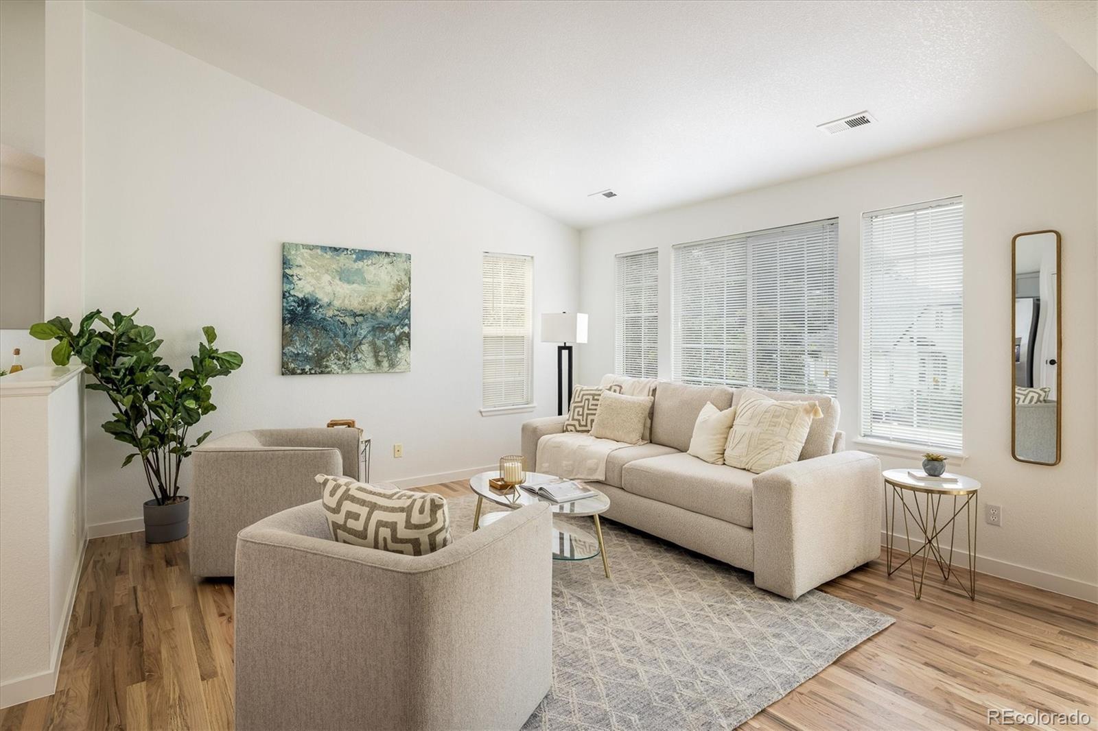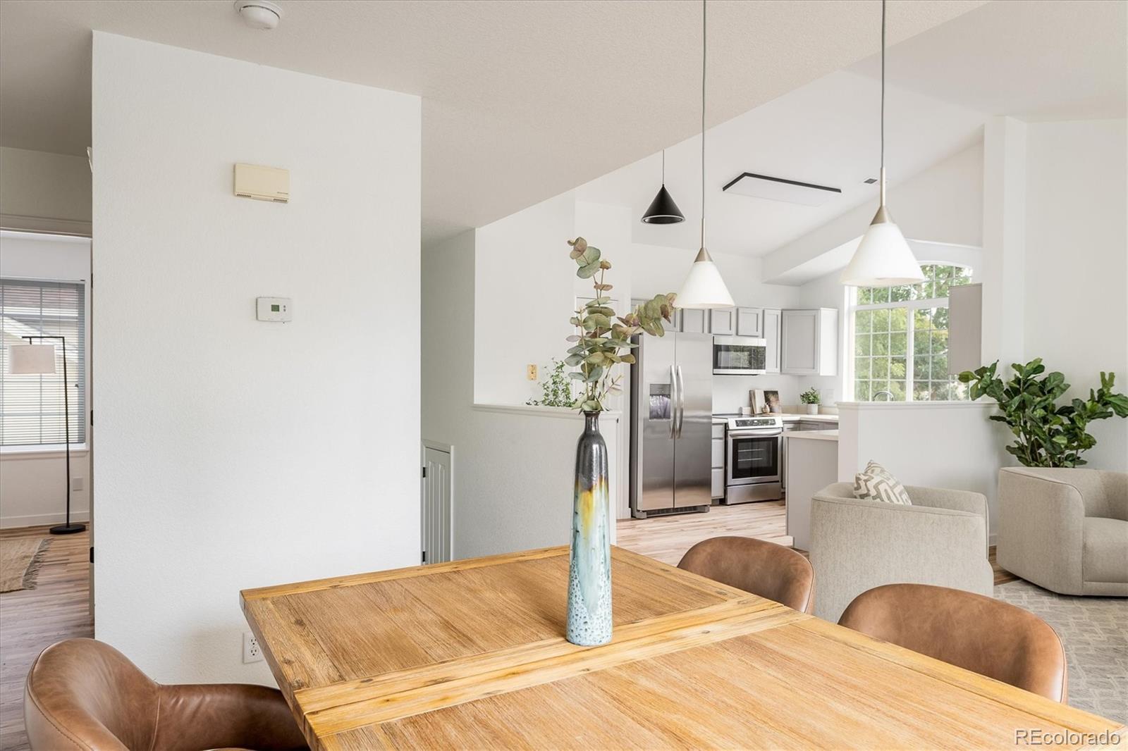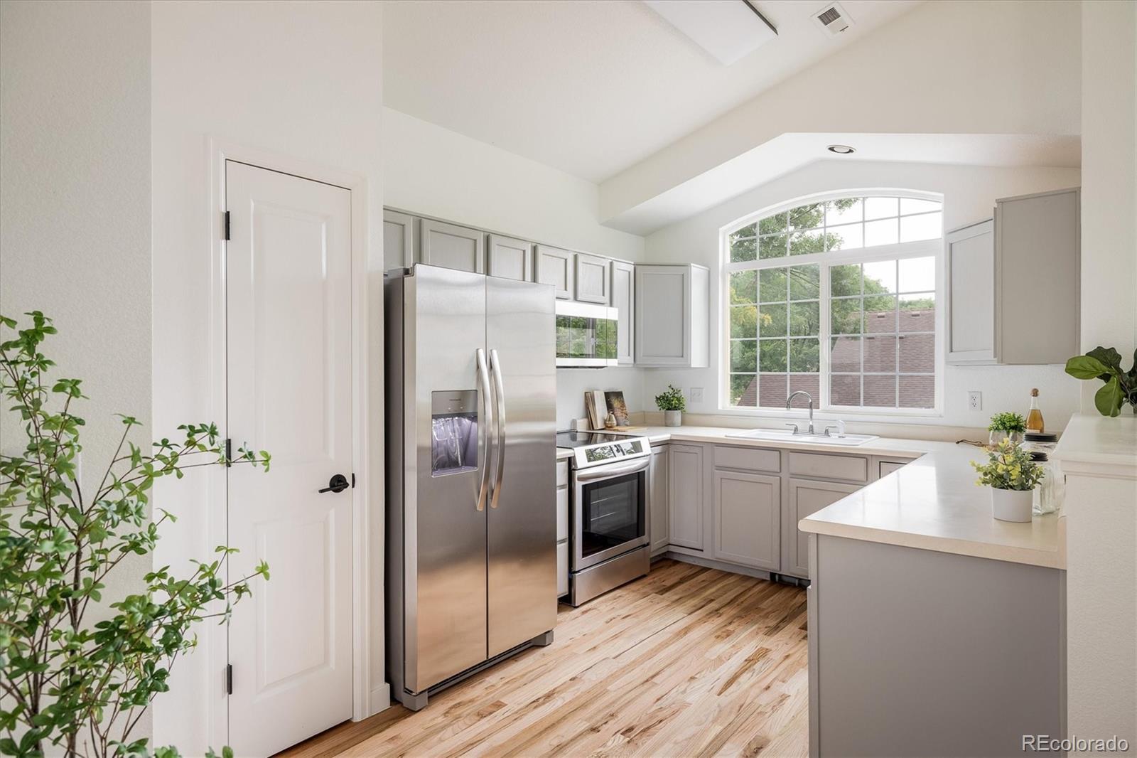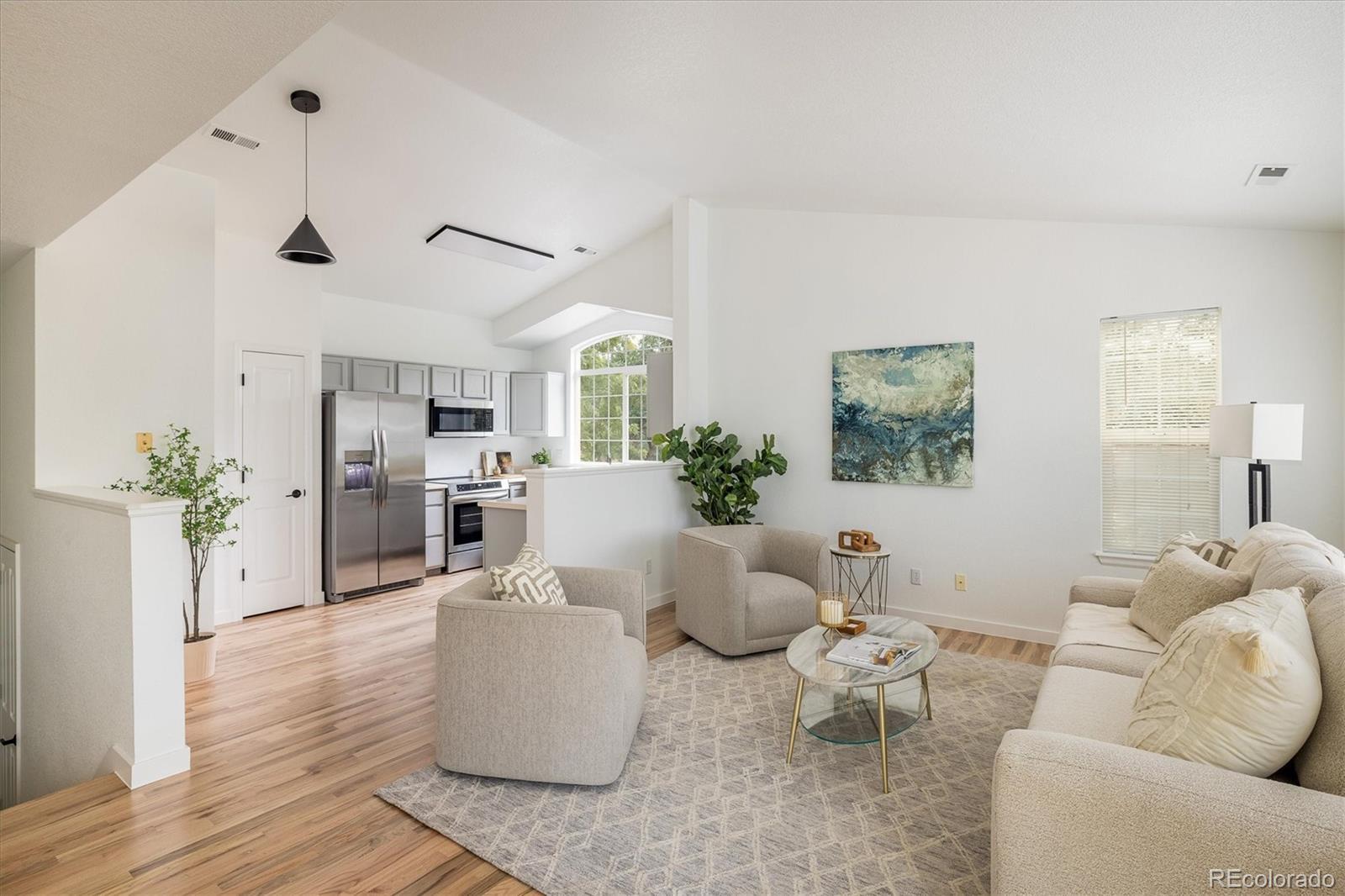 OPEN HOUSE THIS SATURDAY FROM 10AM-12PM!! Rarely Available End Unit Condo with Vaulted Ceilings & Prime Location! Opportunities like this don’t come often - these sought-after condos are rarely on the market! Nestled in a peaceful, tucked-away corner of the Villages at Horizon Pointe community, this ranch-style end unit offers the perfect blend of privacy and modern convenience. Enjoy main-floor living with just one flight of stairs up to your home, with no neighbors above and soaring vaulted ceilings throughout. The oversized attached one-car garage includes extra storage space and a private driveway, a rare and valuable feature. Recently remodeled, this home is truly move-in ready. You'll love the newly installed REAL oak hardwood floors, fresh interior paint, brand-new stainless steel appliance package, updated lighting, and stylish hardware throughout. Soak in the sunshine from your southwest-facing deck, which overlooks the scenic Big Dry Creek Trail and offers seasonal mountain views. With the trail system and open space just steps from your door, it's a Colorado outdoor lover’s dream. The well-maintained community features low HOA dues, beautifully kept grounds, and ample guest parking. Ideally located between Boulder and Denver, commuting is a breeze, and you’re just minutes from shopping, dining, and everyday conveniences.