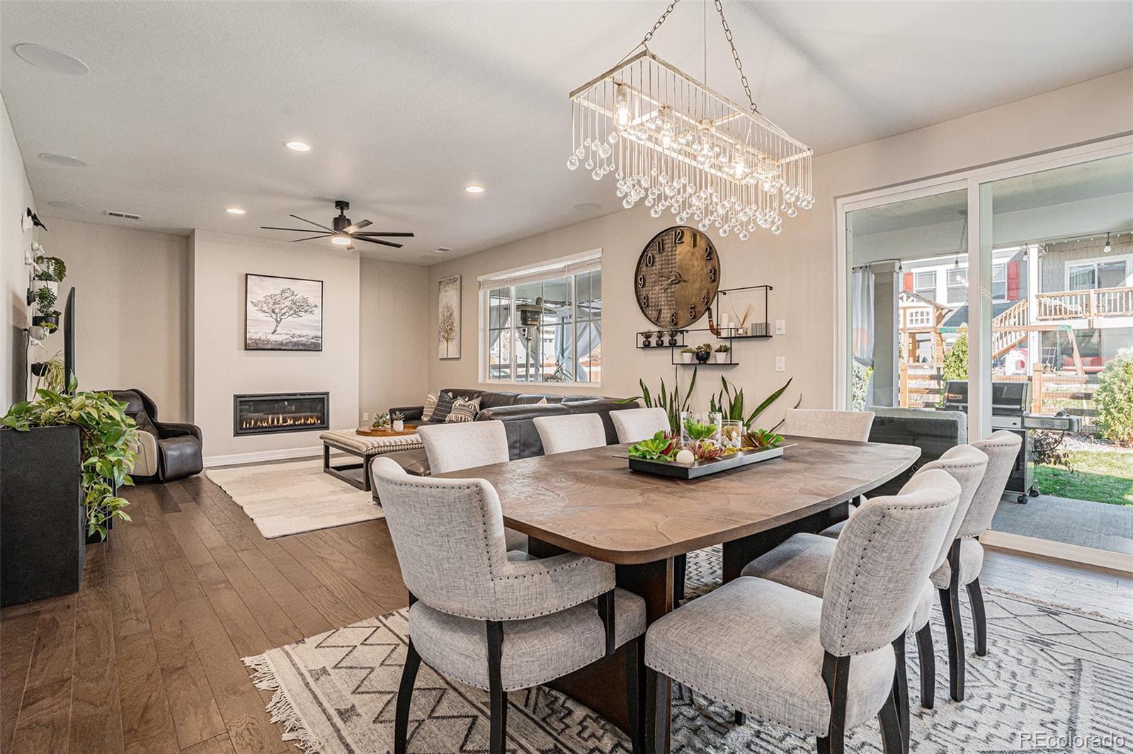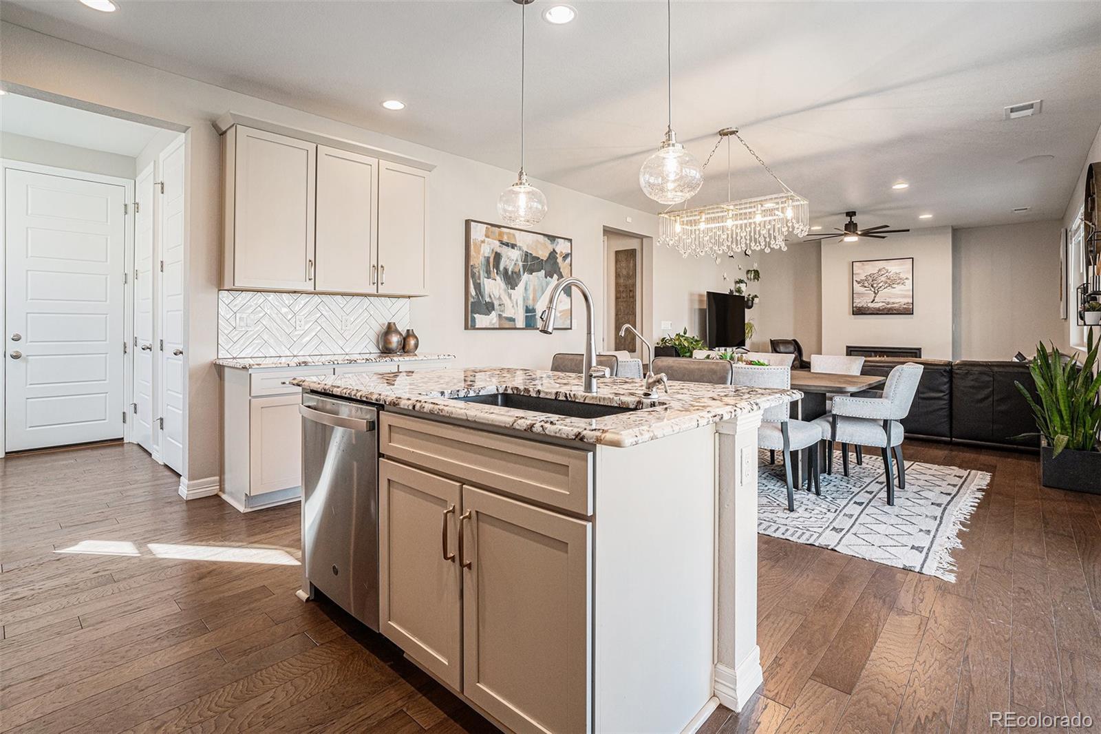 Welcome to your new home where light, flow, and design come together in perfect balance. Every space was created for modern living, blending beauty and function with a sense of calm that’s impossible to leave behind. Wide-plank engineered wood floors lead through an open main level centered around a sleek linear fireplace and built-in surround sound — a space that draws people in. The expanded sliders open fully to a peaceful patio and beautifully landscaped yard, creating an easy connection between indoor comfort and outdoor relaxation. The kitchen is as striking as it is practical, with white cabinets topped in crown molding, stunning granite counters, and a herringbone backsplash that adds texture and style. It’s the kind of space that makes both everyday meals and special gatherings feel effortless. A main-level suite with its own living area, bedroom, and bath offers privacy for guests, roommates or multi-generational living. Upstairs, you’ll find a versatile loft, spacious bedrooms, and a primary suite designed to recharge — featuring a massive walk-in closet and spa-inspired bath with herringbone tile in every shower throughout! Every detail, from black steel railings to thoughtfully chosen fixtures, speaks to quality and care. Beautifully finished and ready for your house warming party, this home delivers modern style, comfort, and connection in every moment. Don’t let this one slip away — it’s the home you’ve been waiting for.