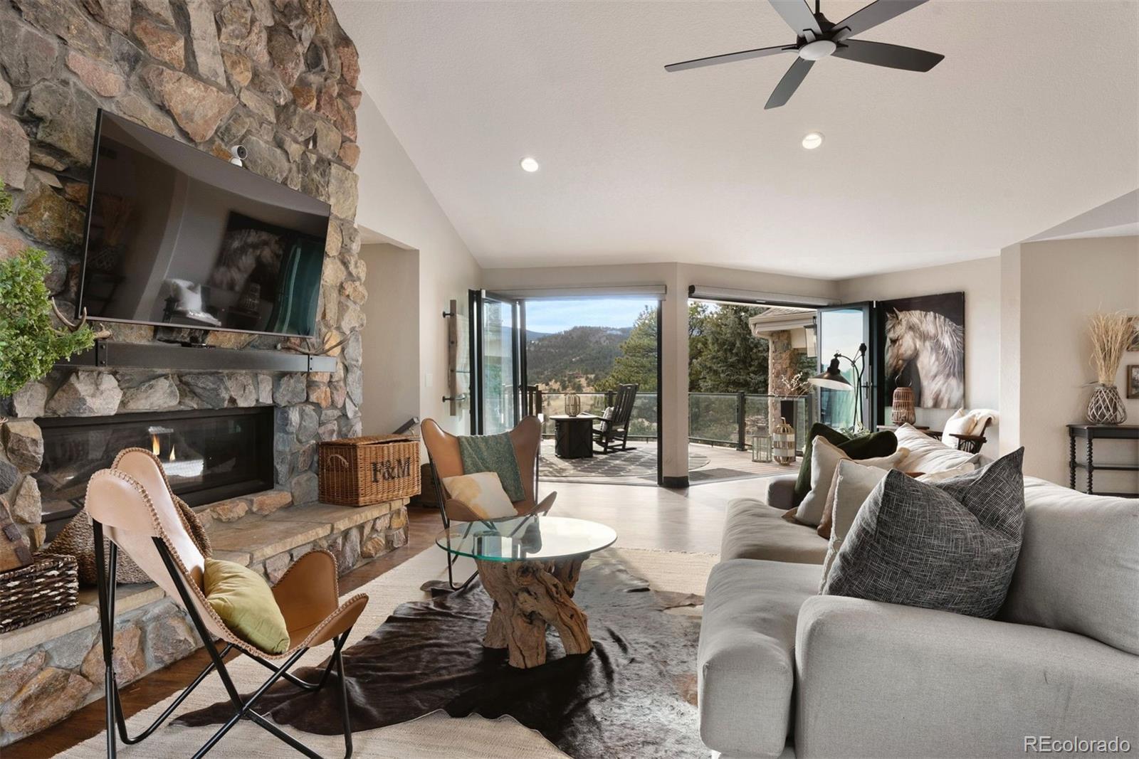 One of Soda Creek’s most exceptional offerings, this 20-acre ridge-top estate commands unobstructed 360° views from rolling vistas to the Continental Divide! The setting feels cinematic—sky meets mountain—while the homesite is elevated above a private meadow suited for a barn, pasture, or equestrian pursuits. With only three homes on the street, privacy is paramount, yet I-70 is minutes away, linking Denver, DIA, world-class skiing, and everything Colorado, making the neighborhood one of the most sought-after in North Evergreen. Reimagined with a local designer, the home blends a modern mountain aesthetic with custom updates throughout! True main-floor living provides a rare advantage: primary retreat-like suite, oversized office, dining, laundry/mudroom, and flexible spaces—all on a single level. The open-concept family and gathering areas flow naturally into a redesigned kitchen, anchored by a stunning 2" raw-edge marble island, butler’s bar, and top-tier appliances. NanaWall doors dissolve indoor/outdoor boundaries to a south-facing deck framing endless views. A new oversized patio (pre-piped for heat) showcases an infinity-edge swim spa. A gated, newly sodded, huge backyard is perfect for entertaining or quiet reflection. Key longevity assets include a newer Class IV roof, furnaces, gutters and water heaters, replaced windows, upgraded electrical panel, and durable exterior stonework. Two garages provide exceptional capacity for up to 11 vehicles, ideal for collectors, recreational toys, or a workshop.Upstairs, three ensuite bedrooms share a versatile loft, while the lower level—with rec-room, sunroom, steam shower, and private entrance—offers generational space for guests, wellness, or a studio. Soda Creek residents enjoy private trails, a neighborhood pond for fishing and skating, and Evergreen’s mountain-town energy, historic charm, and convenient amenities within minutes—an estate defined as much by views, lifestyle, and rare seclusion as by the land itself.