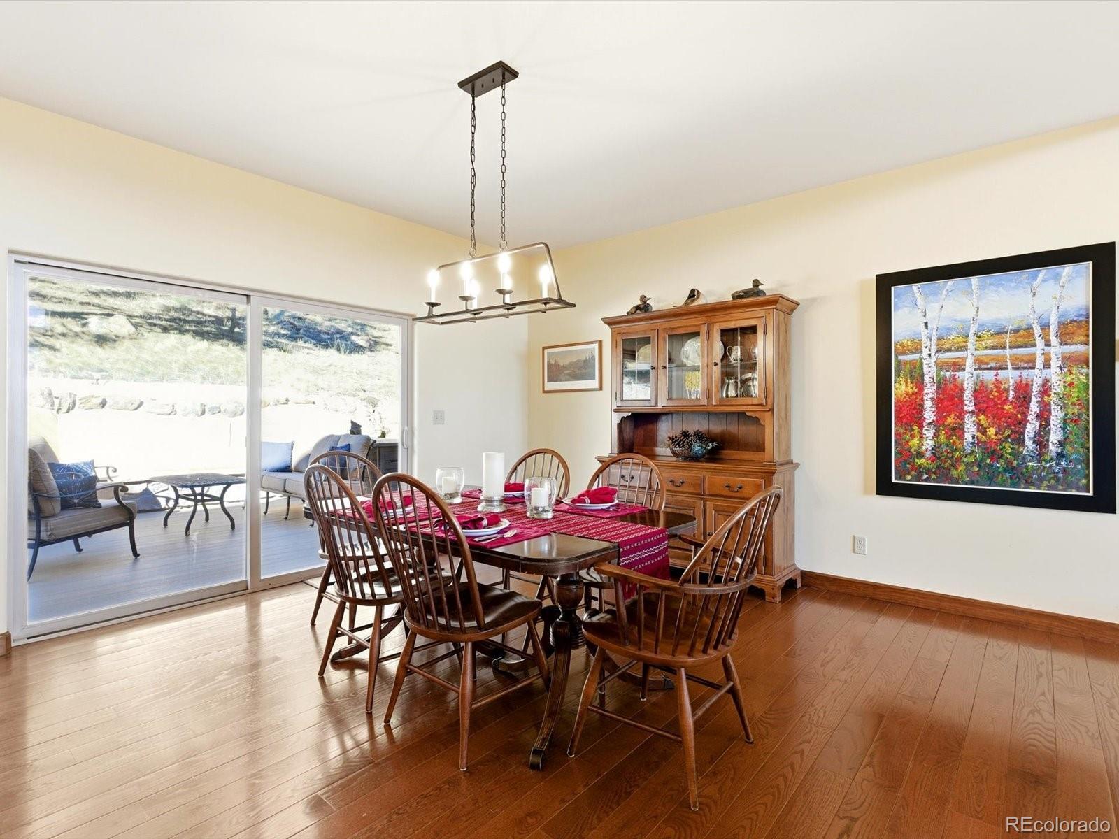 Located in the highly desirable Homestead neighborhood, this custom built mountain home offers the perfect blend of community, privacy, and convenience, all just a short drive to Denver. Built and lovingly maintained by the original owners, the home has been exceptionally well cared for and presents like a brand new home. The highly sought after main floor living floor plan features a spacious primary suite on the main level, along with a second main level bedroom with its own bathroom, ideal for guests or multi-generational living. Vaulted ceilings and a wall of windows fill the main living area with natural light and showcase rolling mountain views, creating a welcoming space for everyday living. The open concept kitchen is both beautiful and functional, featuring striking cabinetry, a gas cooktop, double oven, wine fridge, large island, and abundant countertop space for meal prep and gathering. The layout flows seamlessly into the dining and living areas, making it ideal for entertaining. Upstairs, a massive bonus room offers incredible flexibility and could easily serve as a fifth bedroom, home office, art studio, or game room. The walk out lower level extends the living space with a bar and plenty of room for a pool table, shuffleboard, darts, or movie nights plus two more bedrooms. A generously sized mudroom provides the perfect drop zone for Colorado living, with space for boots, coats, laundry, dogs with muddy paws, and even an extra refrigerator. Car enthusiasts and outdoor adventurers will appreciate the attached two car garage plus a detached two car garage, ideal for a workshop or storing skis, bikes, and fly fishing gear. Situated on a quiet cul-de-sac with a private backyard, this home offers a peaceful mountain setting with a true neighborhood feel. Start your day with a cup of coffee on the front porch as the morning sun rolls in and indulge in the best of mountain living!