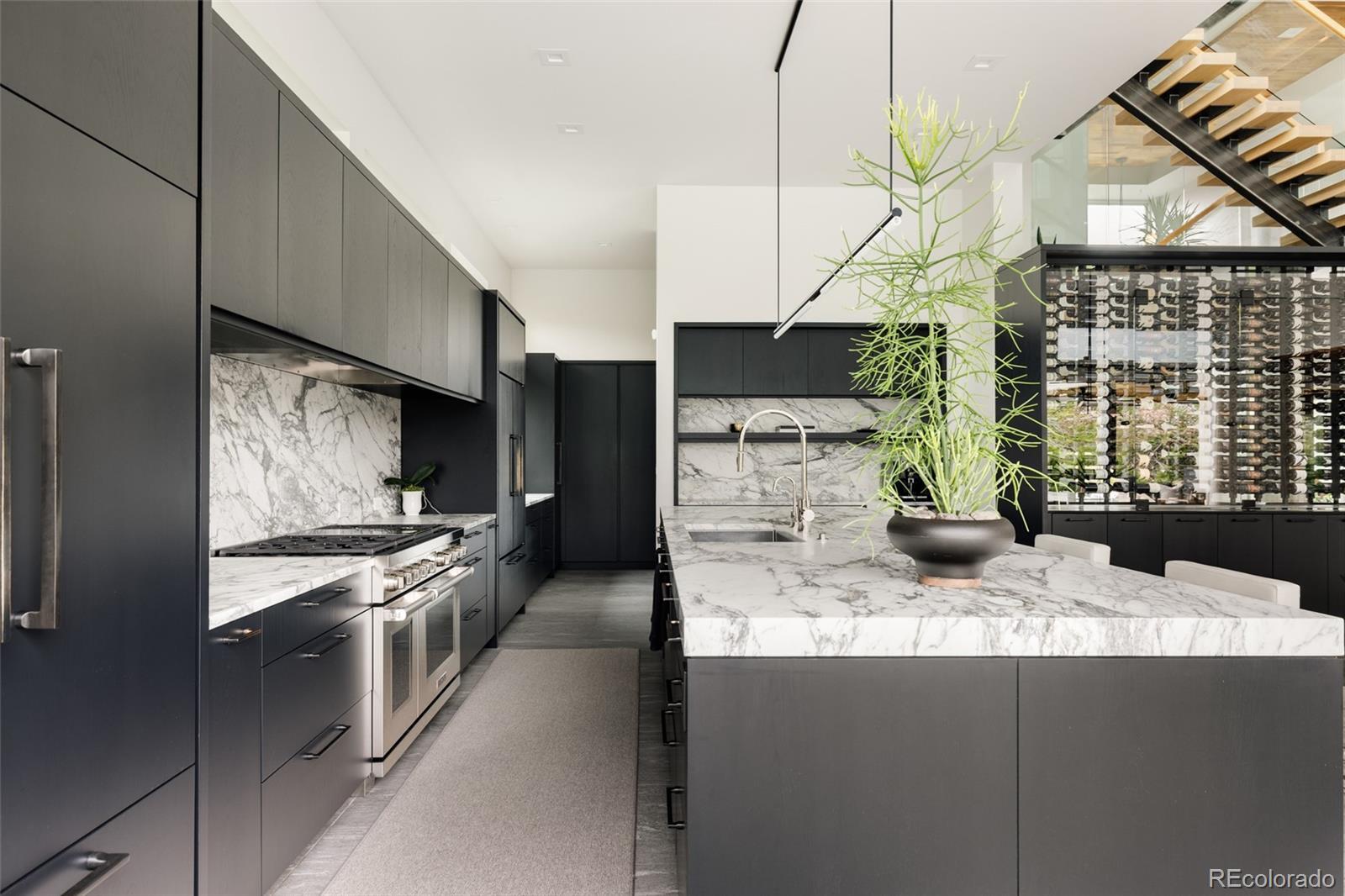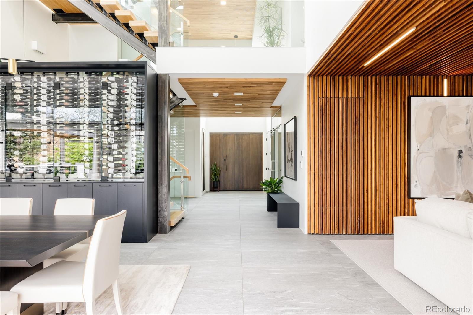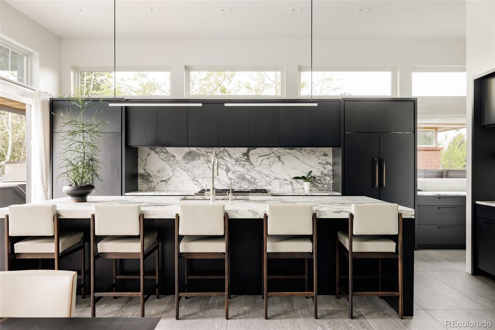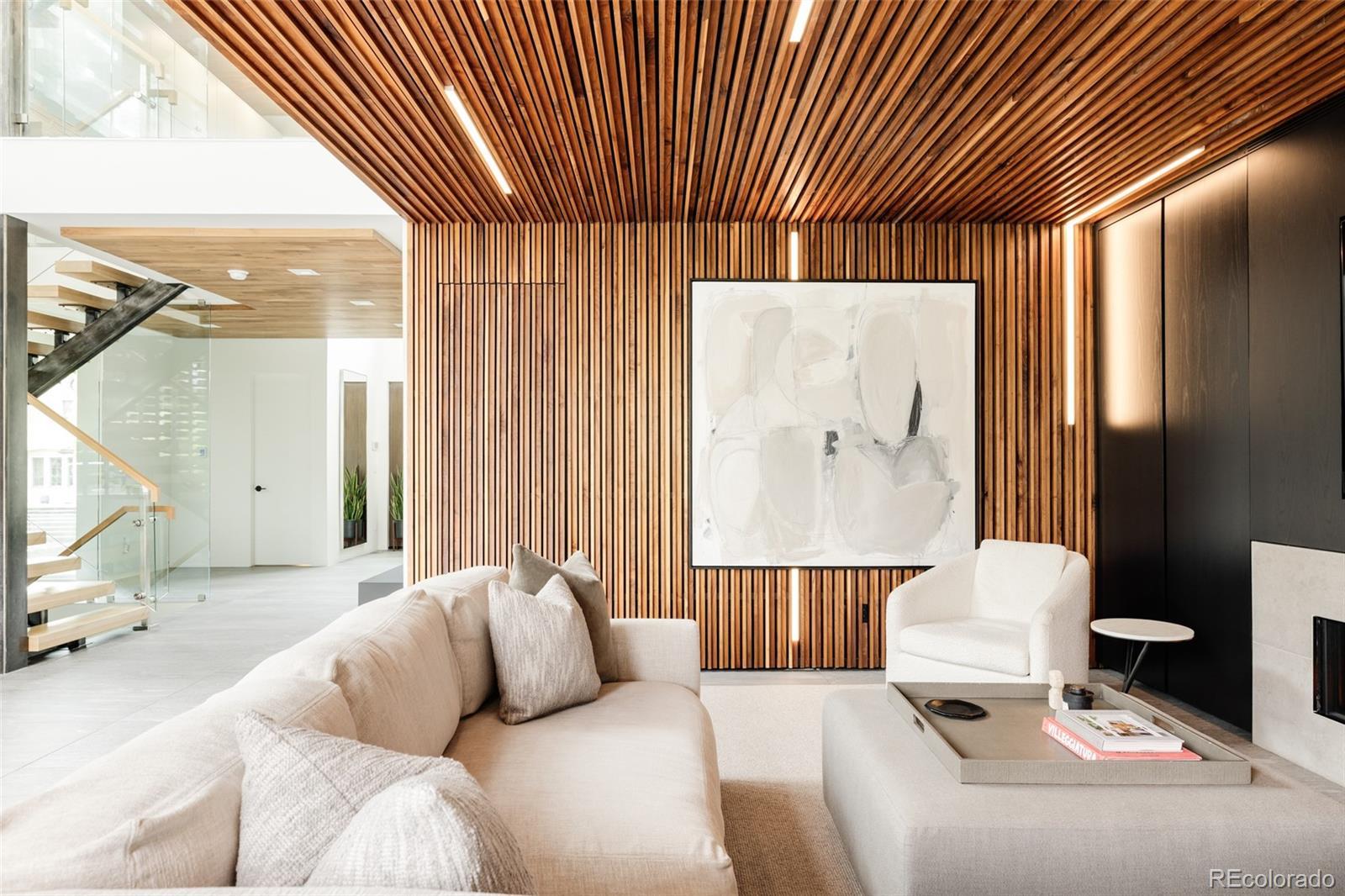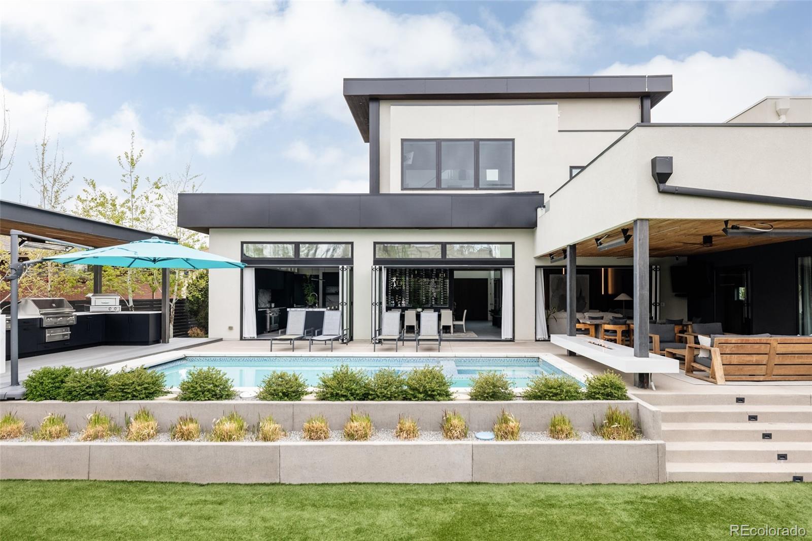 A rare opportunity to own one of Denver’s most architecturally significant contemporary estates. Set on a 12,500 sq ft lot in a premier location, this custom-designed residence masterfully blends high design, luxury materials, and flawless functionality. A commanding exterior showcases stonework, a solid wood front door, and custom fencing enclosing a manicured front yard with a bocce court. Inside, seamless stone flooring and tailored cabinetry with soft-close finishes set a sophisticated tone. The open-concept main level centers around a sculptural slab marble island, matte black oak cabinetry, exotic honed marble countertops, pro-grade appliances, a coffee bar, and a fully appointed walk-in pantry. A custom glass wine wall anchors the dining area, while the family room stuns with walnut accents, sleek fireplace, and concealed mudroom access. Accordion doors open to a heated covered patio, resort-style pool and spa, full outdoor kitchen with grill, cooktop, pizza oven, fire pit, turf lawn, and mature trees. The main floor also includes a refined office. Upstairs, the primary suite is a sanctuary with a fully custom walk-in closet, wall of built-ins, spa bath with dual showers (steam), dual vanities and toilets, and an adjacent Pilates retreat. Two additional ensuite bedrooms and a laundry room with double W/Ds complete the level. The third-floor sky lounge opens to a rooftop terrace with fireplace. The over-excavated basement features a marble bar, gym, sunken courtyard, rec room with fireplace, and guest suite with sitting area. The 4-car tandem garage is conditioned with epoxy floors, built-ins, wine fridge, and sauna. Just off the garage, a second private office with built-ins, fireplace, and powder room offers an ideal in-law suite conversion. Additional amenities include radiant heat (14 zones), Sonos, smart home automation, six fireplaces/fire pits, custom lighting, window coverings, turf dog run, and backup forced air.