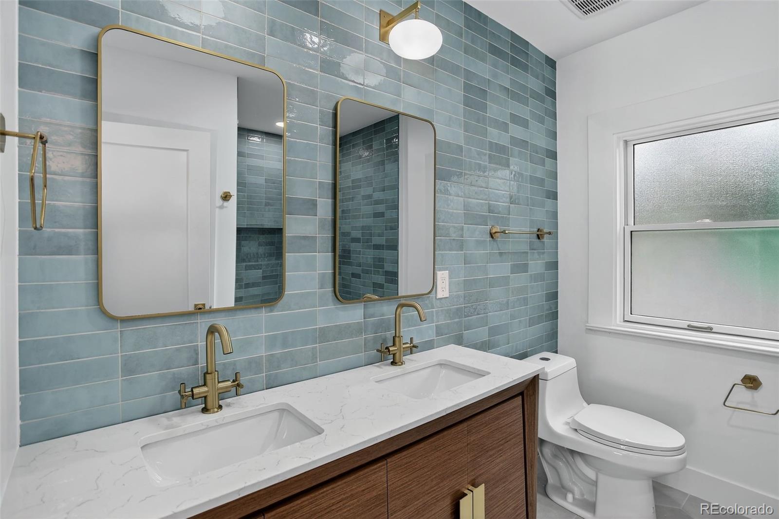 A PRICE IMPROVEMENT YOU WON’T BELIEVE! Located in the heart of the East Seventh Ave Historic District, this beautifully updated Denver Square blends classic charm with modern luxury in the most seamless way. From the moment you step inside, the restored wood bench and original stair railing and exposed brick set the stage for the craftsmanship & character that define this home. The main level is made for entertaining, featuring an open layout, anchored by a fully remodeled chef’s kitchen. You’ll love the 6-burner gas range, custom cabinetry, walk-in pantry, and built-in outlets! A bright and airy flex space opens through two sets of new Pella sliding glass doors to the covered patio and private backyard— A half bath adds convenience without sacrificing style. Upstairs, the primary suite is a true retreat + a terrific size! Enjoy a spa-inspired ¾ bath with floor-to-ceiling marble tile, a custom walnut dual vanity, an oversized walk-in closet (design it your way with a seller concession!), and private laundry. Two additional bedrooms and a beautifully updated full bath with a double vanity complete this level. The finished basement with its own private entrance offers incredible versatility—ideal for guests, in-laws, or multigenerational living. It features a large bedroom with egress, a ¾ bath, living area, kitchenette, and second laundry setup. Outside, you’ll find a serene backyard with mature trees, lush grass, a blooming hibiscus tree, and a spacious covered patio perfect for outdoor dining. You have a garage and large RV/extra parking as well! This home has been renovated top to bottom, including new double-pane wood windows, wood sliding doors, hardwood floors, roof, AC, furnace, plumbing, electrical, sprinklers, and more. The finished basement—HAS ITS OWN ENTRANCE—functions perfectly as a guest suite or multigenerational living space, offering a large bedroom with egress window, ¾ bath, living area, kitchenette, and second laundry.