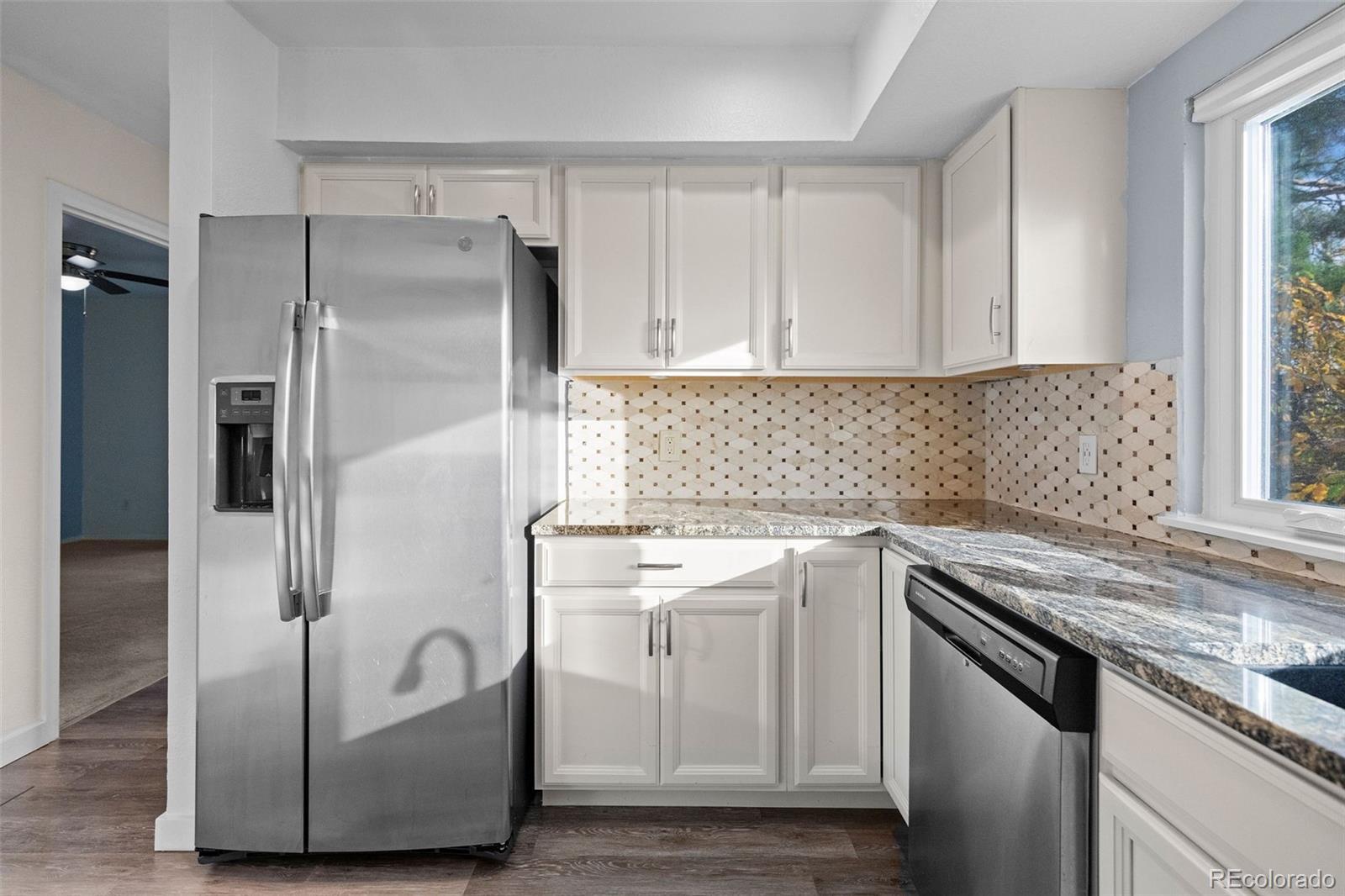 Discover effortless living with style and comfort in this updated end-unit condo nestled within Parker Meadows. Vaulted ceilings and expansive windows fill the open-concept living area with natural light, while a wood-burning fireplace creates a cozy focal point for Colorado evenings. The kitchen is thoughtfully designed with granite countertops, stainless-steel appliances, and generous cabinet space, flowing seamlessly into the dining and living areas for easy entertaining. Both bedrooms are conveniently located on the main level, including a spacious primary suite that opens to a private balcony. It's the perfect place to enjoy your morning coffee or unwind after a long day. The updated full bathroom offers modern finishes with washer and dryer hook-ups for everyday convenience. Additional features include a smart thermostat, durable vinyl flooring, and double-pane windows that enhance comfort and efficiency year-round. Outside, mature trees and well-kept grounds create a peaceful setting, while two reserved parking spaces add ease and accessibility. Ideally situated just minutes from Cottonwood Square, Trader Joe’s, restaurants, and major highways, this home offers the perfect blend of quiet surroundings and everyday convenience—an ideal opportunity for first-time buyers, downsizers, or anyone looking to experience the best of Parker living.