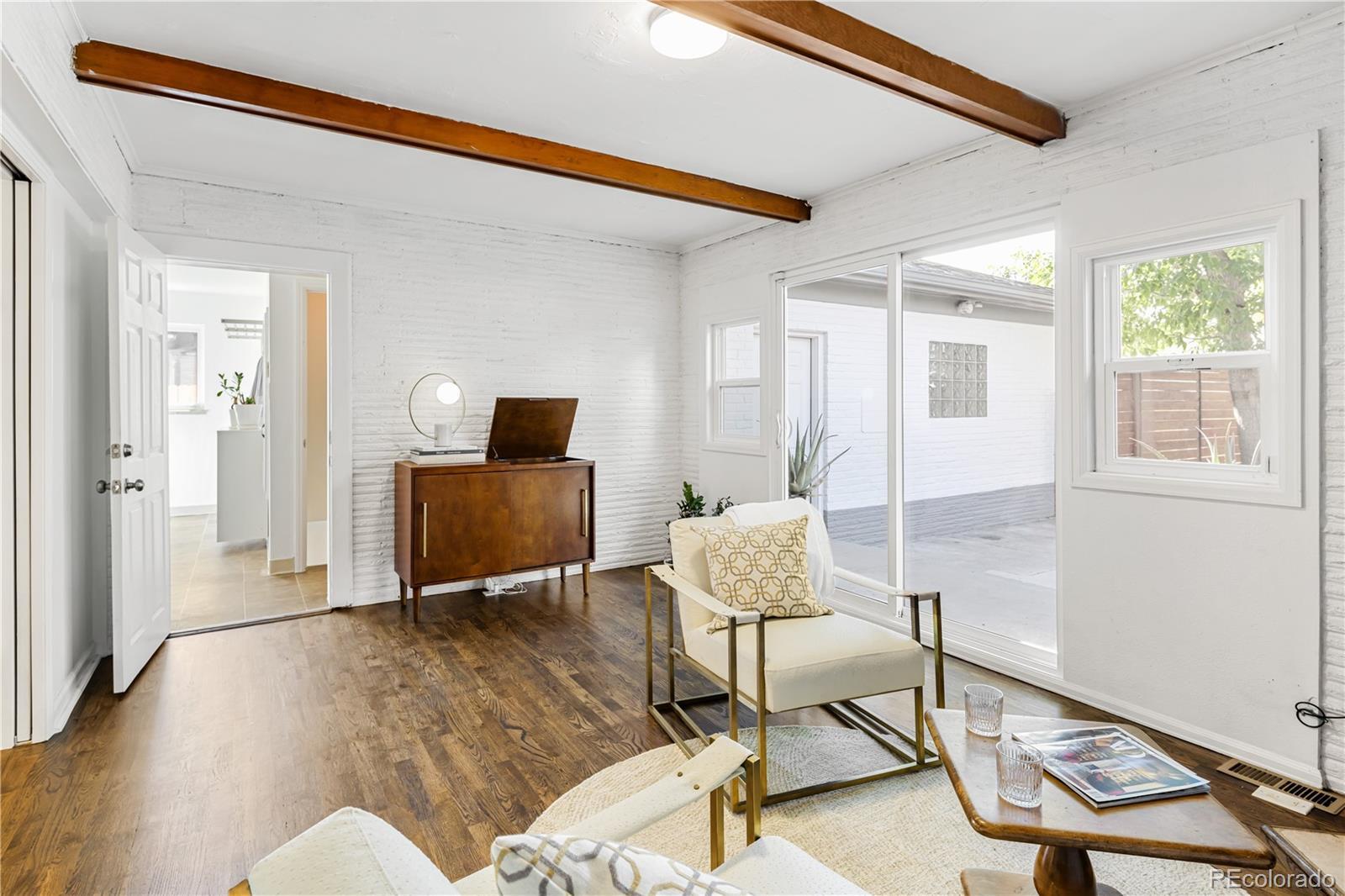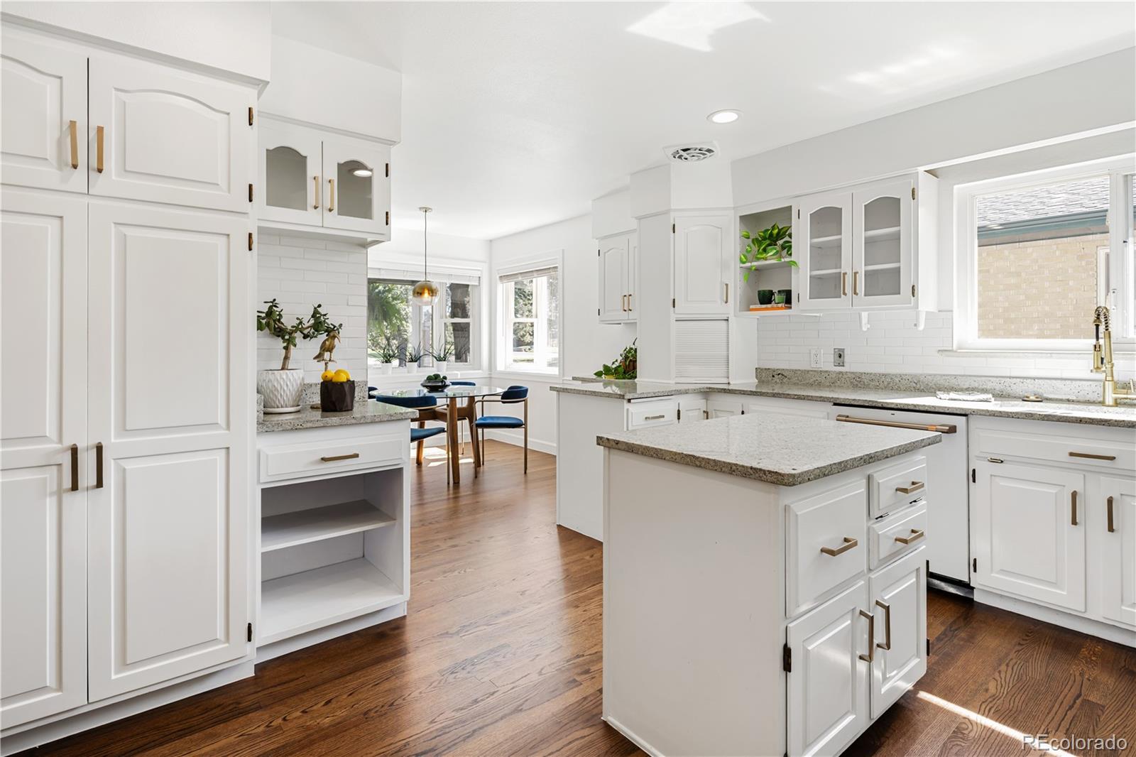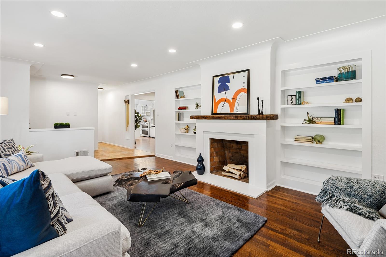 This is North Park Hill living at its best and it just got even more charming with this move-in ready, ranch-style home on a spacious lot. This mid-20th-century gem blends timeless character with thoughtful modern updates throughout. Step inside to find gleaming hardwood floors, original built-ins, and an open, inviting layout designed for everyday living and effortless entertaining. The remodeled eat-in kitchen is the heart of the home, featuring crisp white cabinetry, granite countertops, a center island, and a full suite of new Café appliances, perfect for the dedicated home cook or enthusiastic host. The main living room, anchored by a cozy gas fireplace, creates a welcoming gathering space, while a separate den offers wood-beam ceilings, painted exposed brick, a second fireplace, and direct backyard access for seamless indoor-outdoor flow. A formal dining room with built-in cabinetry and updated lighting sits at the center of the home, ready for memorable meals and celebrations. The oversized bedrooms provide generous closet space, while the primary suite feels like a private retreat with a bonus sitting area and easy walk-out access to the backyard. The main-level bathroom impresses with a dual-sink granite vanity, walk-in shower, and jetted soaking tub. The fully finished basement expands your living options with reclaimed wood accents, a kitchenette, a bedroom with egress, and a ¾ bath, deal for guests, in-laws, roommates, or a home office/workspace. Step outside to a private, fully fenced backyard with a large patio, plenty of room for outdoor dining, gardening, play, and pets. Major updates provide peace of mind, including newer furnace, gutters, siding, sewer line to tap, and solar panels for energy efficiency. Mature landscaping adds to the quiet, welcoming setting.Just a short stroll to Oneida Park and Kearney Plaza for coffee, dining, shopping, and community fun. Easy access to City Park, Downtown Denver, Central Park amenities and no HOA.