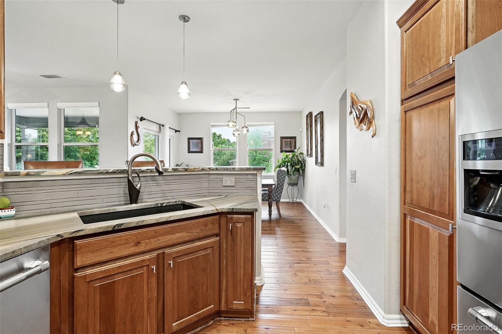 BRAND NEW PRICE!! To get this beautifully Updated End-Unit in the Brownstones at Town Center under $520K is a steal! Conveniently located steps to shopping, coffee, parks, open space, and farmers' market. This is the unit that allows you to engage with your community while having all of the top finishes in your top-floor home. This stylish unit features stunning hardwood floors, custom lighting, and a bright, spacious living area. The updated kitchen offers a tile backsplash, quartzite countertops, and newer stainless steel appliances. A framed fireplace serves as the focal point on the main floor, while corner windows and a bar top create seamless flow to the dining area—perfect for formal or casual meals. You’ll find two bedrooms, a walk-in closet, a washer, dryer, and a luxurious 5-piece bath. Enjoy the expansive front patio with a gas fire pit, ideal for relaxing or entertaining. A 2-car attached garage adds everyday convenience. This move-in-ready home has it all!