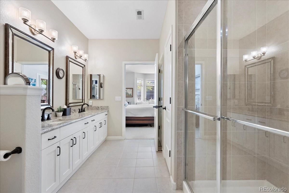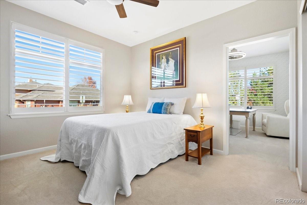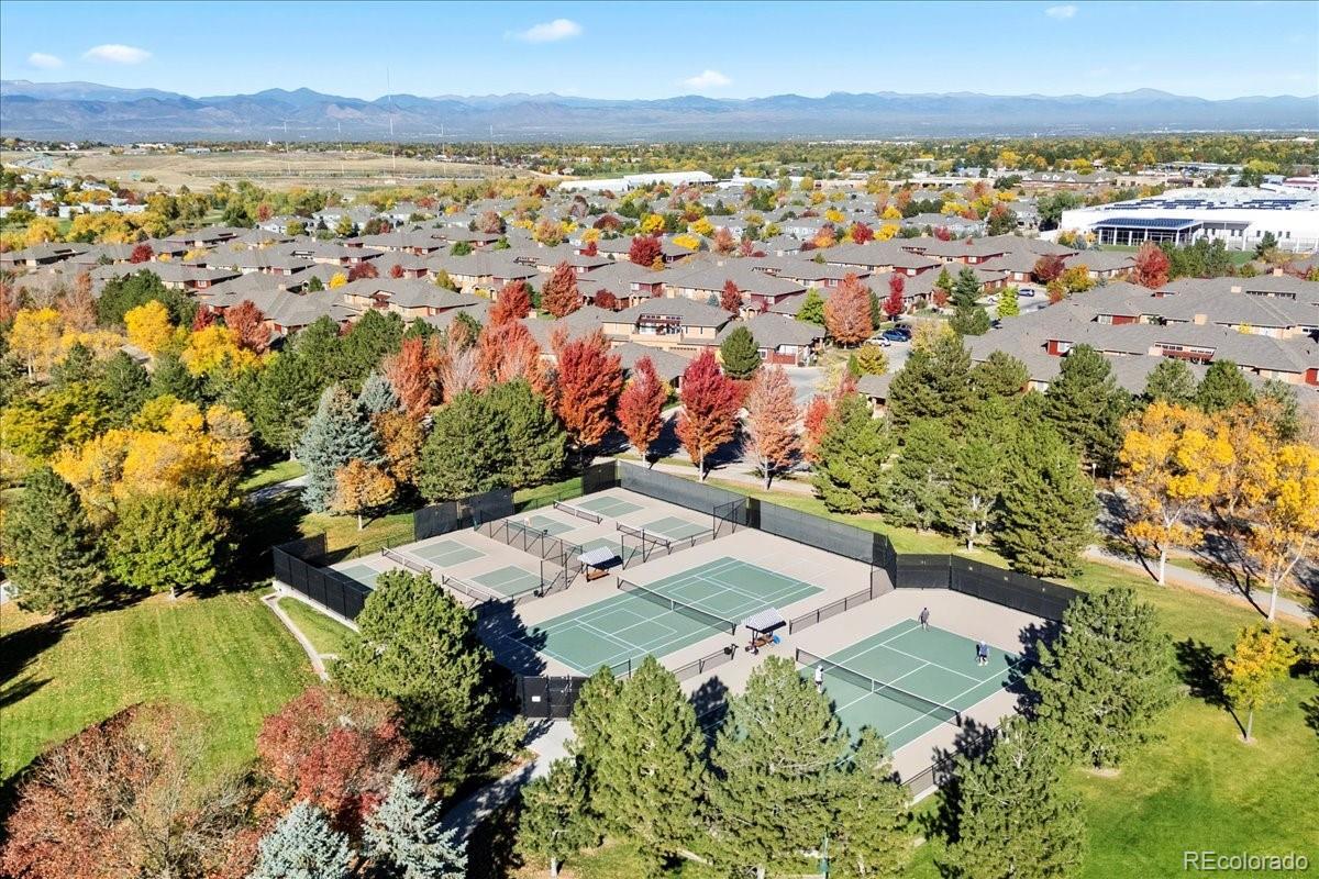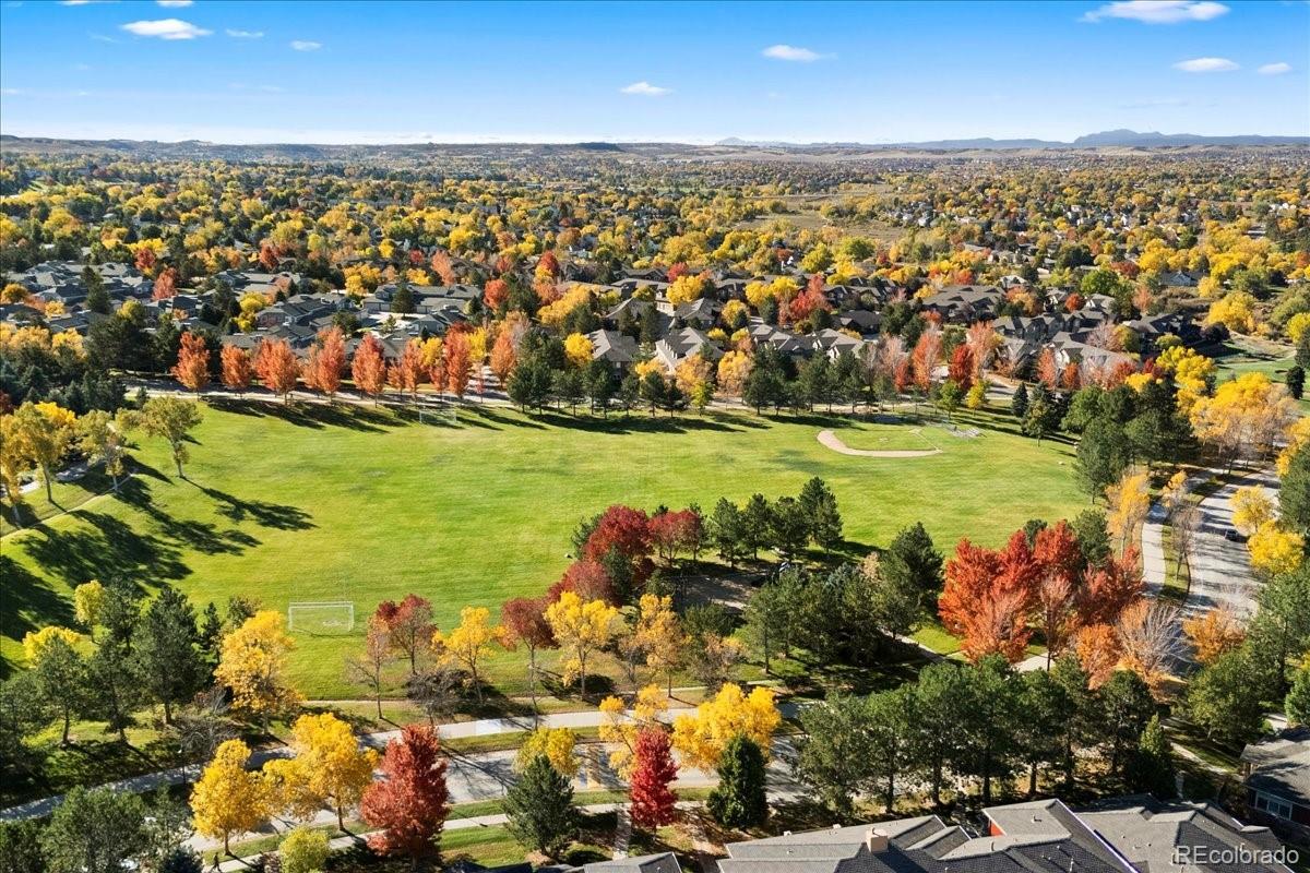 Absolutely stunning turn key 3-bedroom and office (2,456 sf) end unit in Gold Peak, this home glistens with luxurious upgrades throughout. The location within the complex is exceptional, southern exposure, very bright and sunny, quiet location with large yard surrounding and parking area for many guests. Entire home has been remodeled, gorgeous top of the line Kohler walk-in jetted tub in main bath, all new windows with Hunter Douglas plantation shutters. Master suite is luxurious with access to front porch, fireplace, large bathroom with walk-in shower and custom enlarged walk-in closet. Granite counters throughout, all new kitchen appliances. Garage is fully finished with high end finish on concrete and shelving surrounding the entire garage. All appliances stay to include washer, dryer as well as freezer and refrigerator in garage. Home has been meticulously maintained. This gated community has a feel of a private country club, residents can access state-of-the-art fitness club, cafe in club house open for breakfast/lunch/dinner, pool, multiple hot tubs throughout community, indoor basketball court, tennis and pickleball courts, baseball diamond, volleyball courts, children’s play area, racquetball court, high-impact training room, horseshoe pits, putting green and frisbee golf course. And not to mention the gorgeous park in the center of community to walk or ride your bike. Conveniently located to Park Meadows Shopping Center, great restaurants, close to medical care, borders The Links golf course. Minutes away to C-470 and I-25.